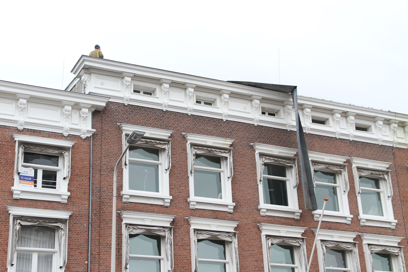 Aan de Nassauplein in Den Haag kwam een deel van de dakgoot los te hangen wat zorgde voor een gevaarlijke situatie.