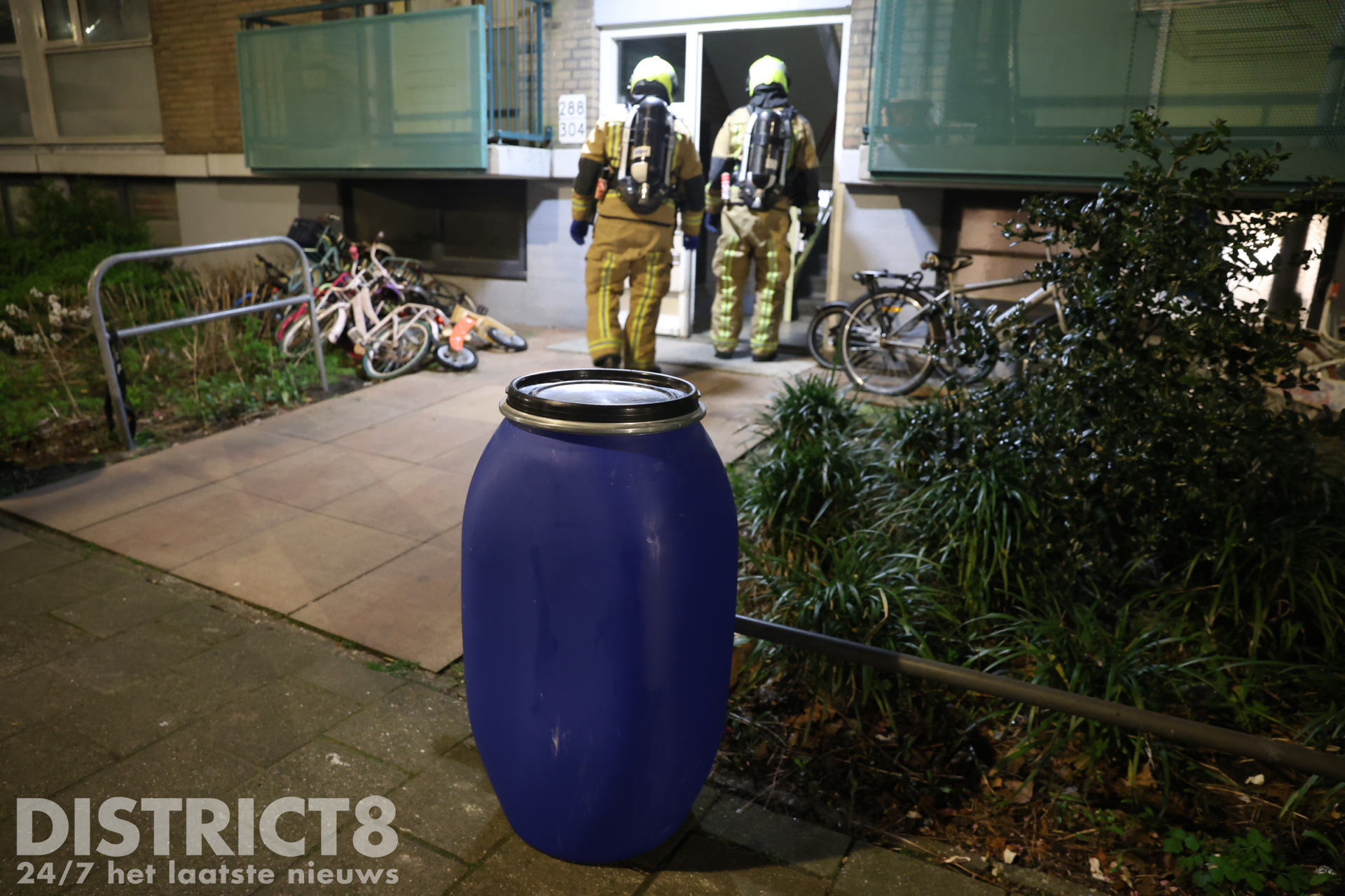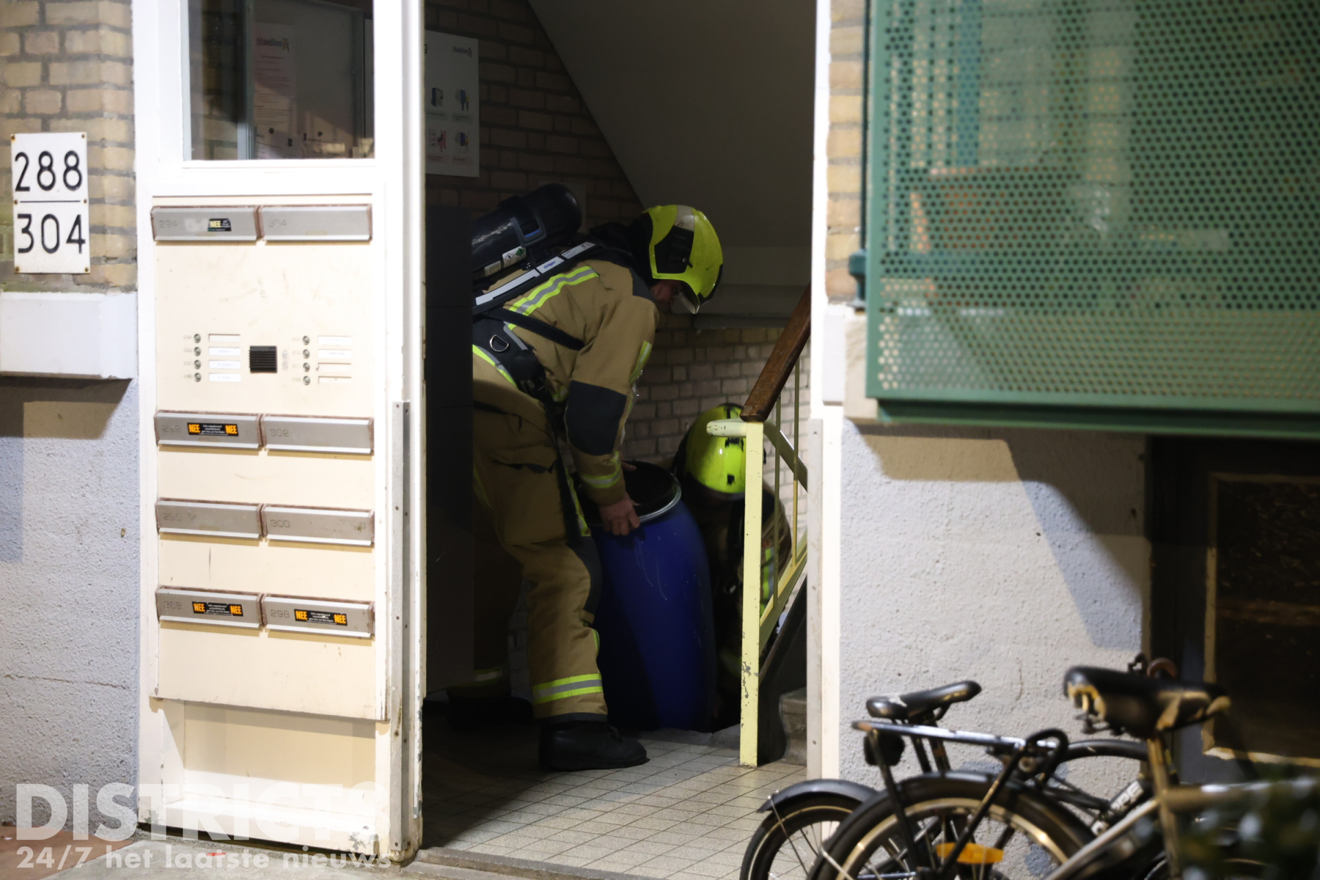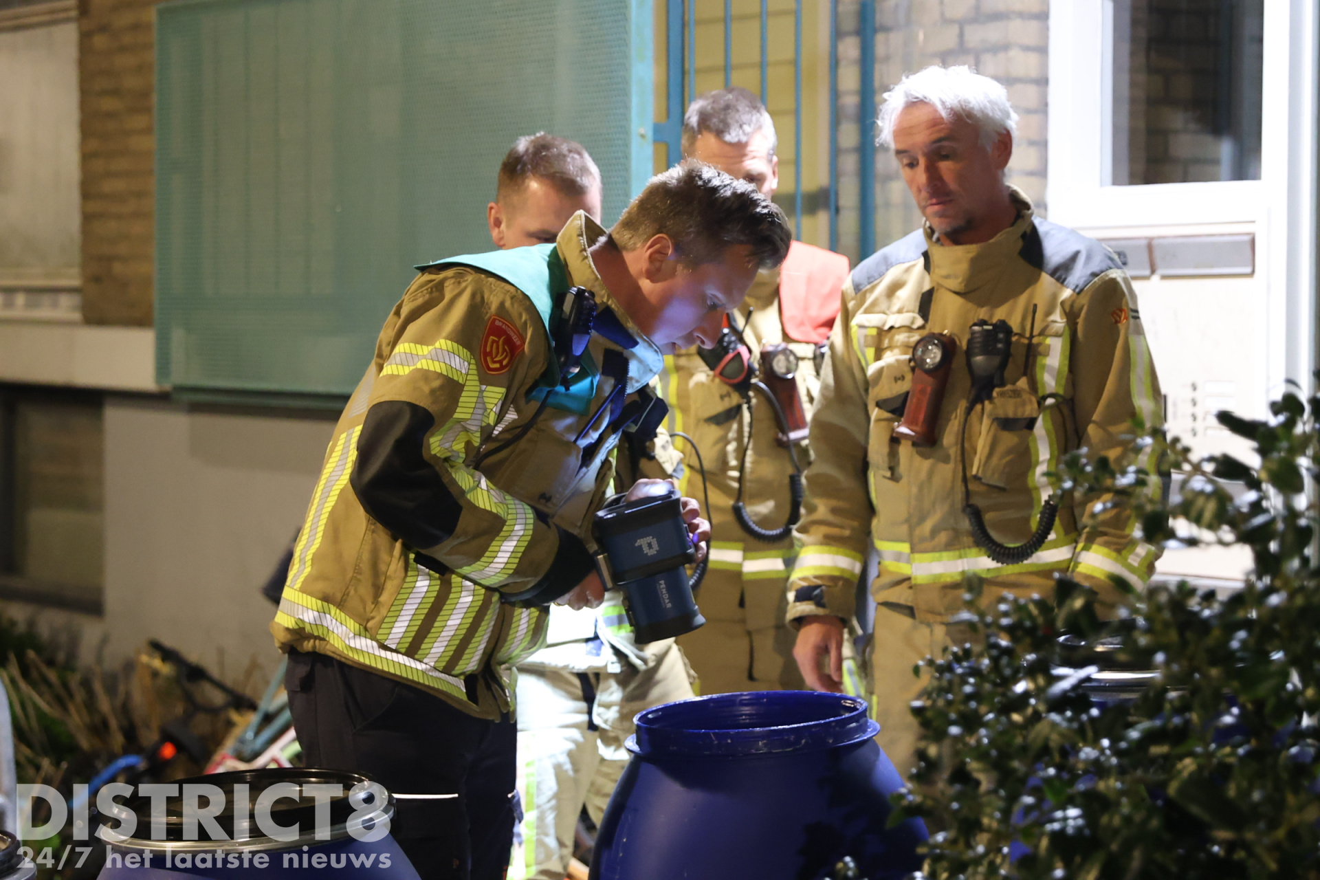 In een keldergang werden grote blauwe vaten aangetroffen met een onbekende inhoud. Hierop is de brandweer ter plaatse gevraagd.