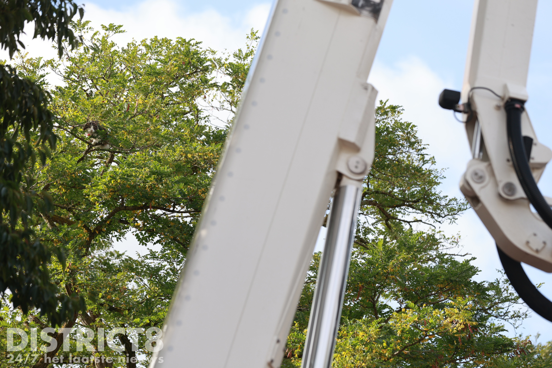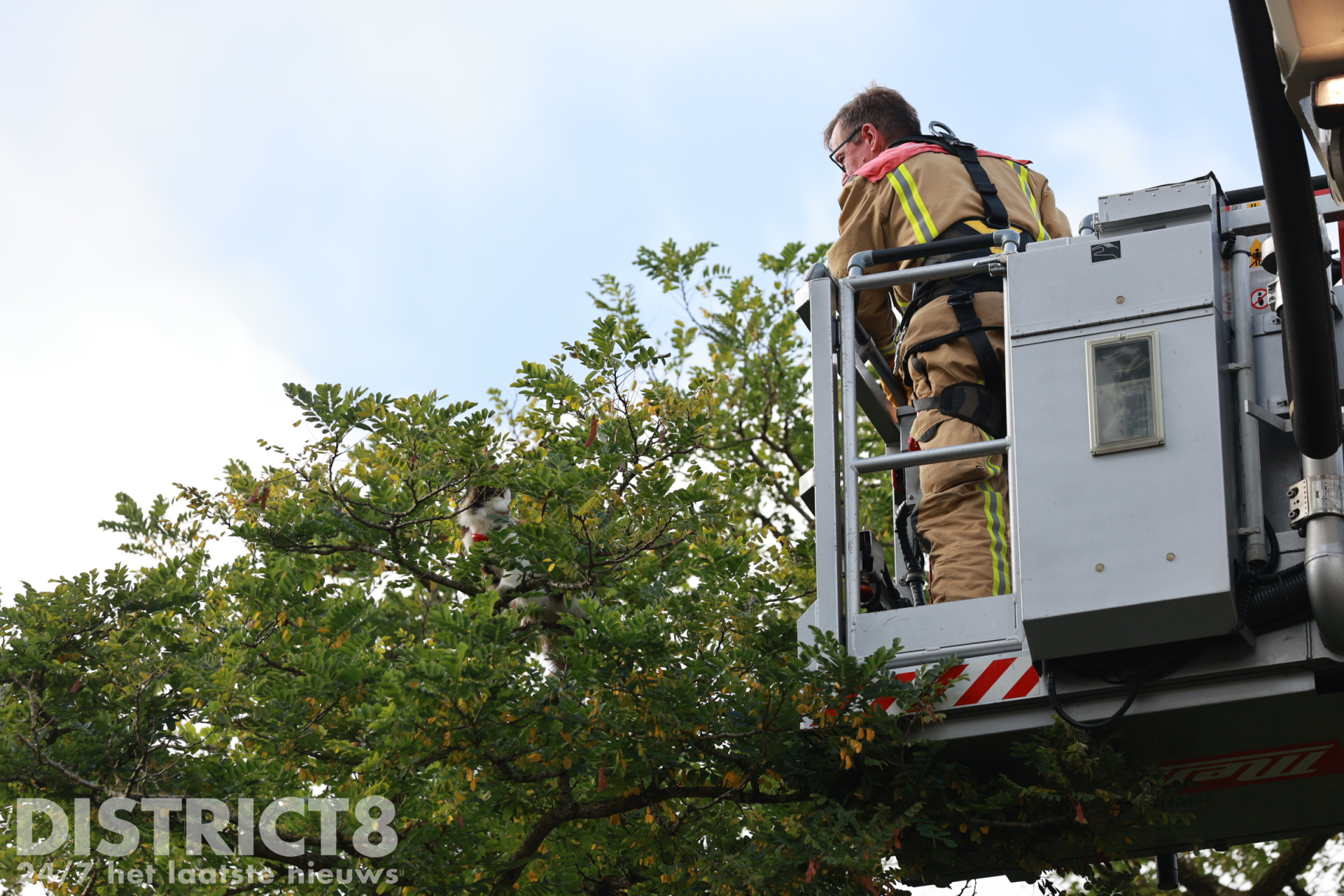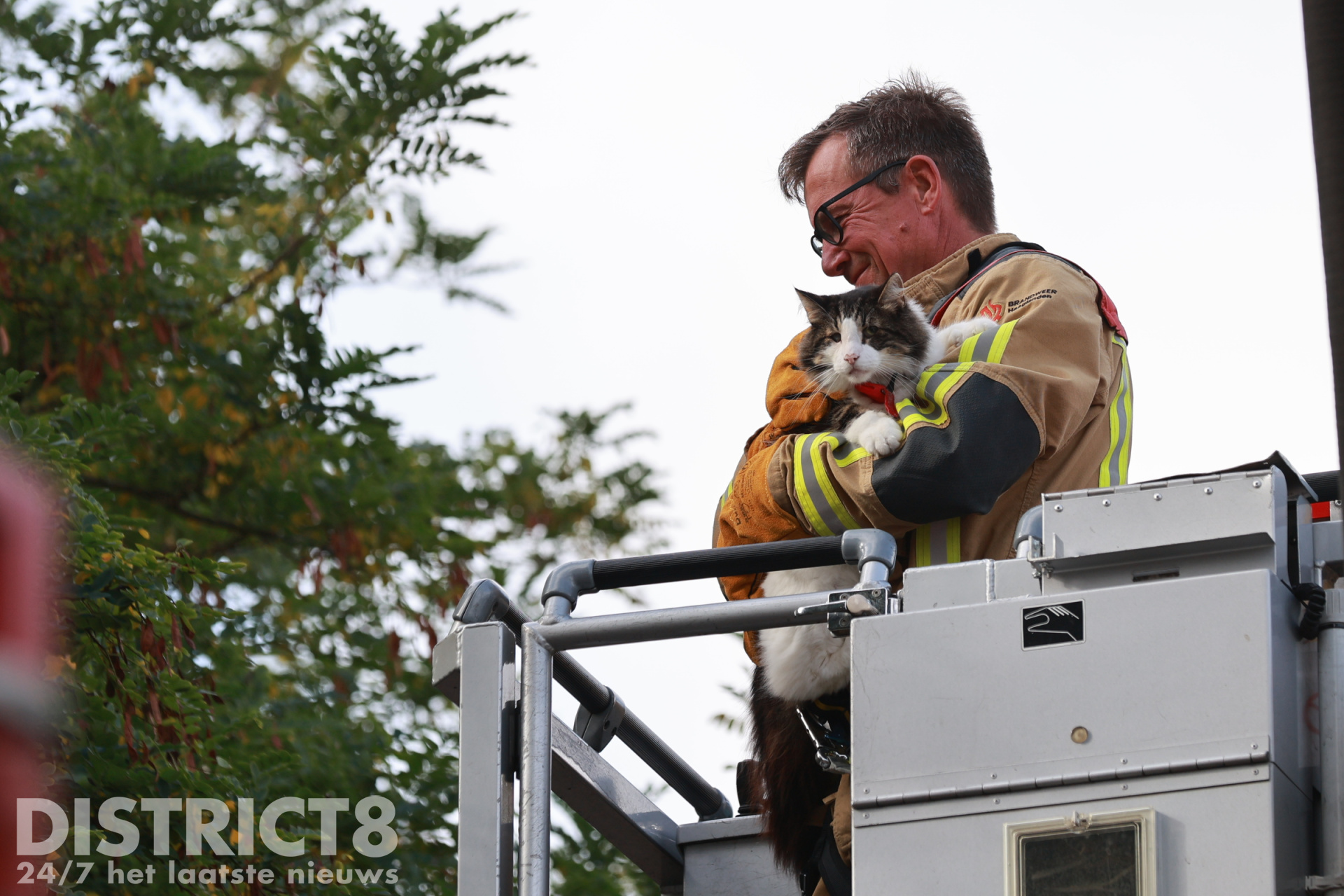 Na een luxe lift in de hoogwerker werd de kat herenigd met zijn opgeluchte eigenaar, die de hulpdiensten dankbaar was. De kat zelf liet zich niet uit over de kwestie, maar lijkt voorlopig genoeg te hebben van klimmen.