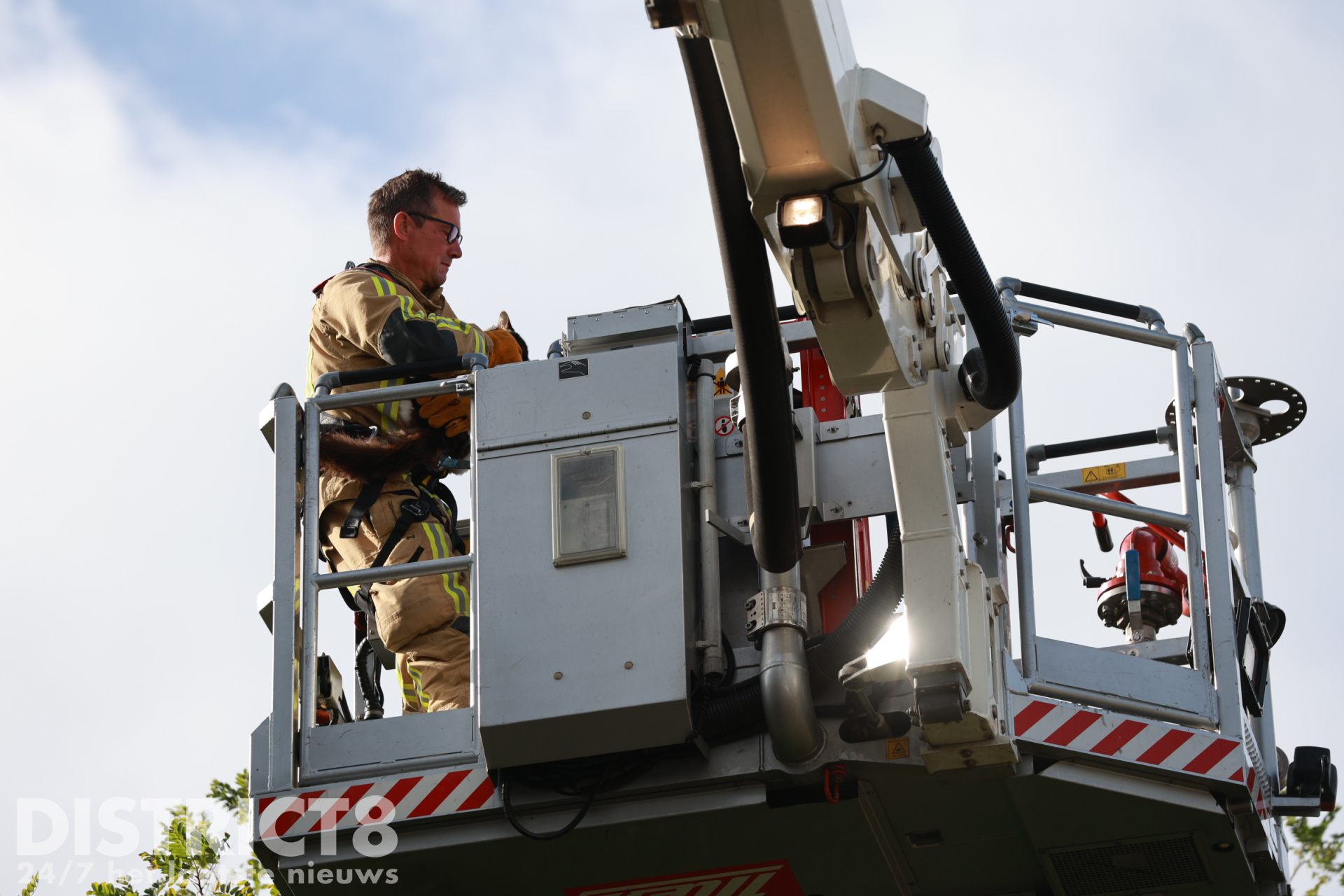 De brandweer van Delft arriveerde met de hoogwerker, tot zichtbaar genoegen van de kat, die rustig bleef zitten terwijl het zware materieel in stelling werd gebracht. Even later kon een brandweerman het dier zonder problemen meenemen naar beneden.