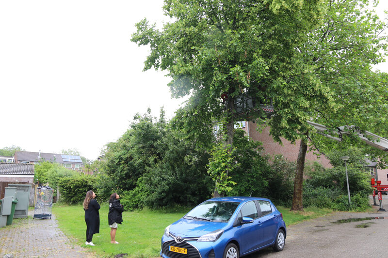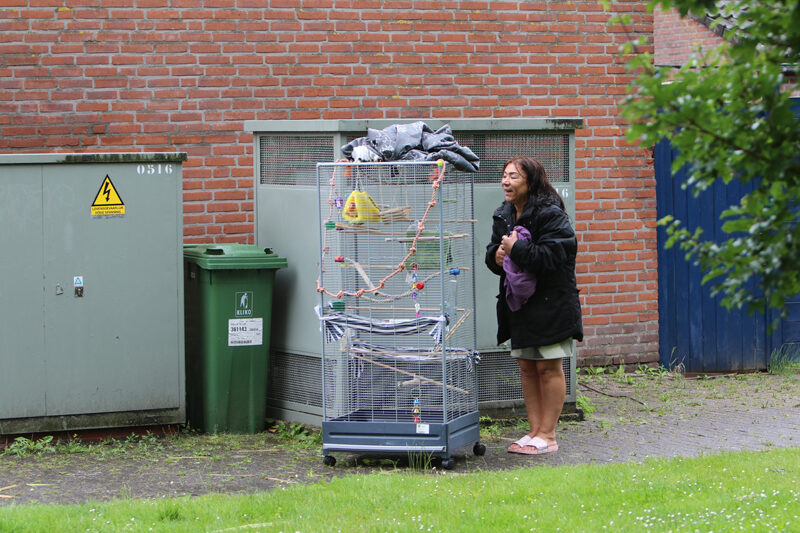 Een hoogwerker van de brandweer kwam ter plaatse. De brandweer had samen met de eigenaresse de kooi met daarin een andere agapornis buiten gezet, om te kijken of het dier naar de kooi zou vliegen.