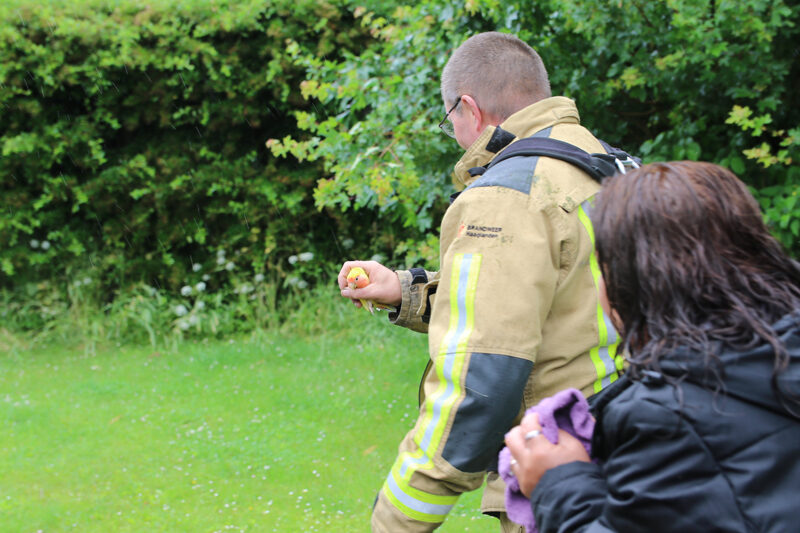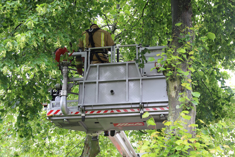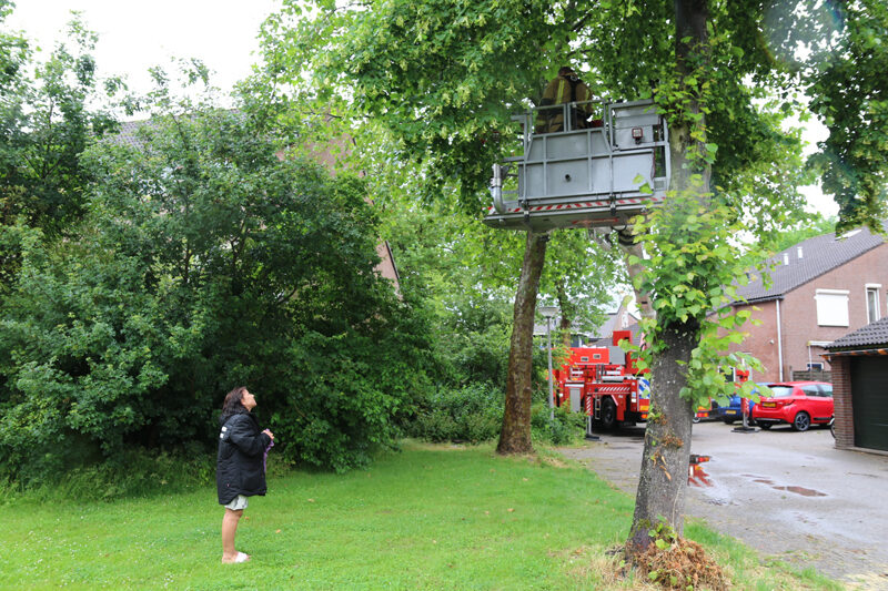 Toen de kooi buiten was gezet heeft de brandweer de hoogwerker opgesteld en heeft een poging gedaan om het dier uit de boom te pakken, deze poging lukte. De blije eigenaresse heeft de agapornis weer veilig in haar kooi gezet en heeft de brandweer bedankt voor hun komst.