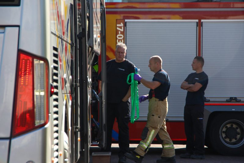 Met behulp van een wervelplank werd de dame voorzichtig uit de bus gehaald. Dit koste de nodige moeite omdat het looppad en de weg richting deur weinig ruimte laten om een brancard te tillen. Nadat ze uit de bus gehaald was klapten de andere inzittenden van de bus voor de inzet van de hulpdiensten.