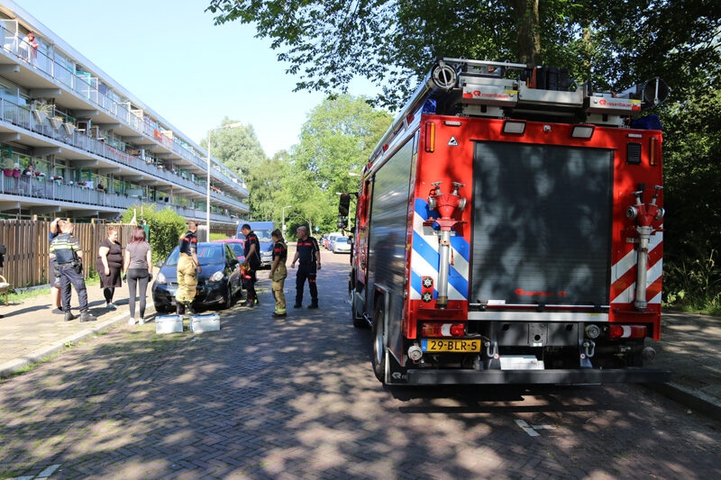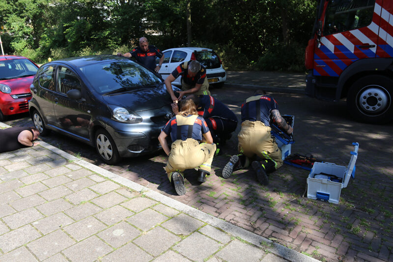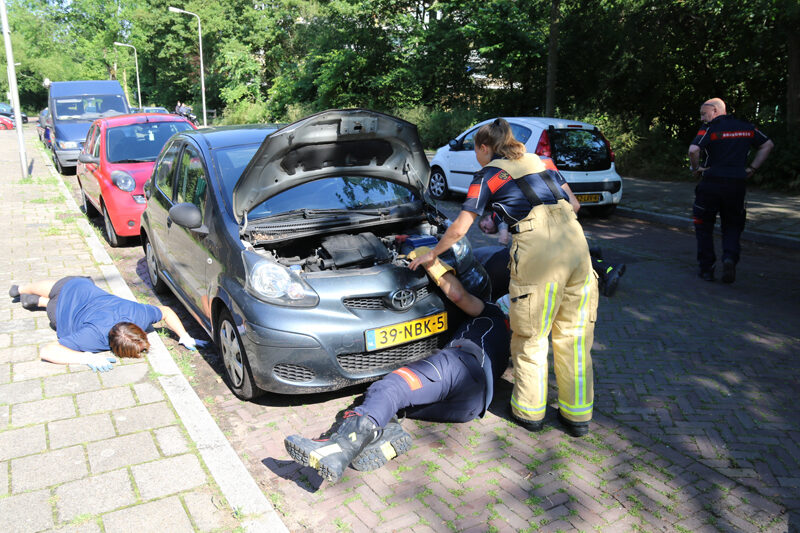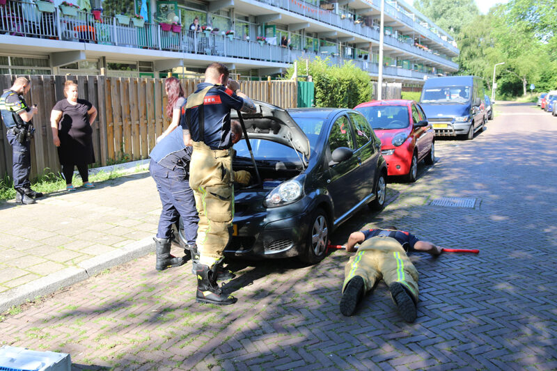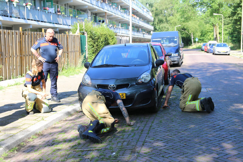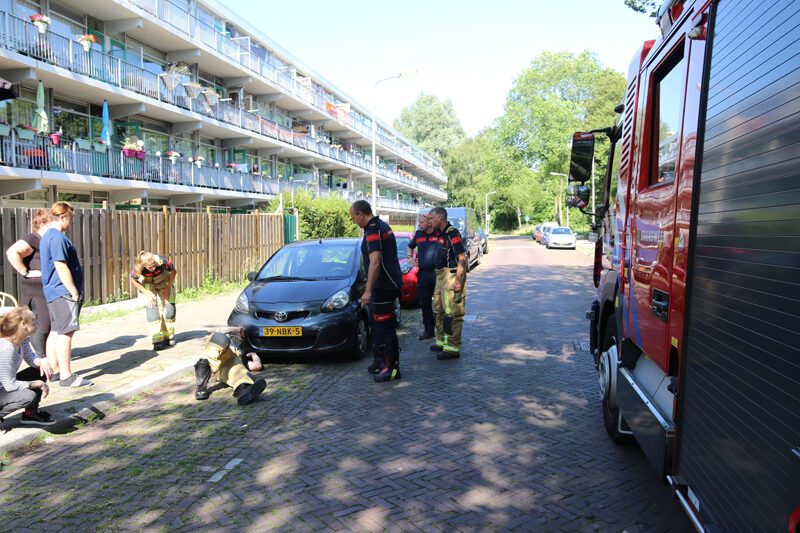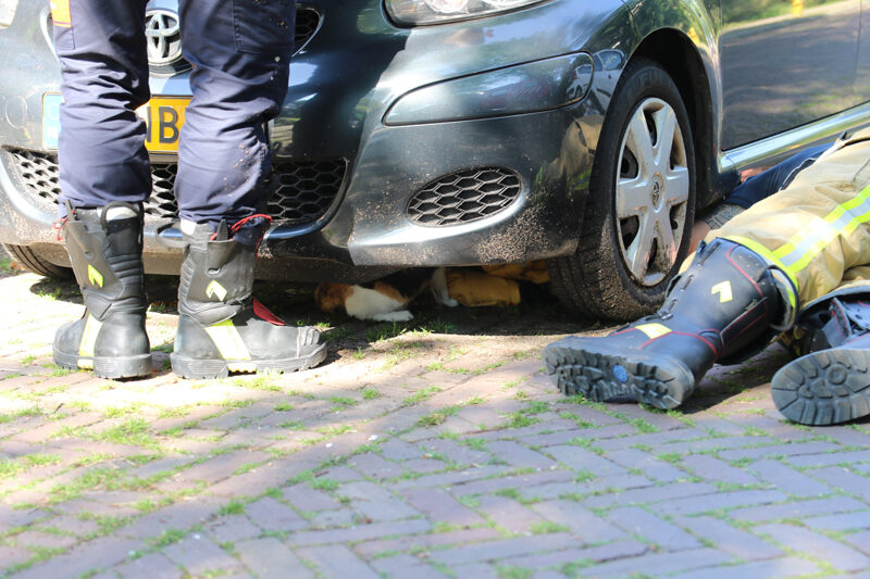 De poes glipte naar buiten en kroop onder de motorkap van een geparkeerde auto. Toen bleek dat een bakje voer neerzetten en de poes roepen geen succes was, werd de brandweer ingeschakeld.