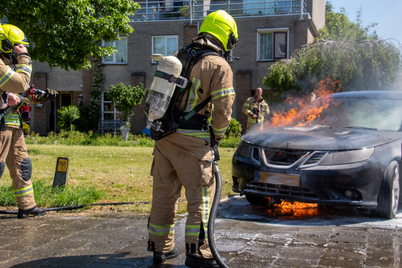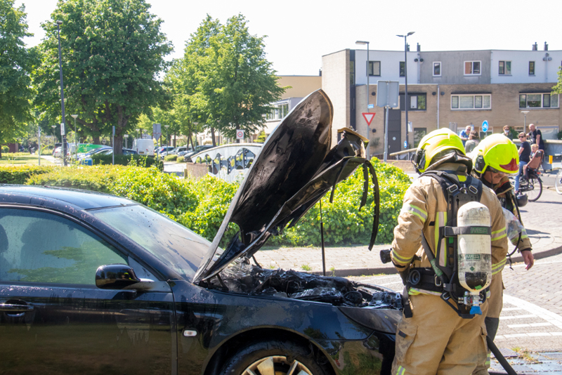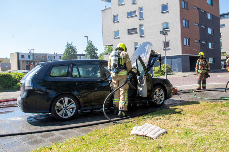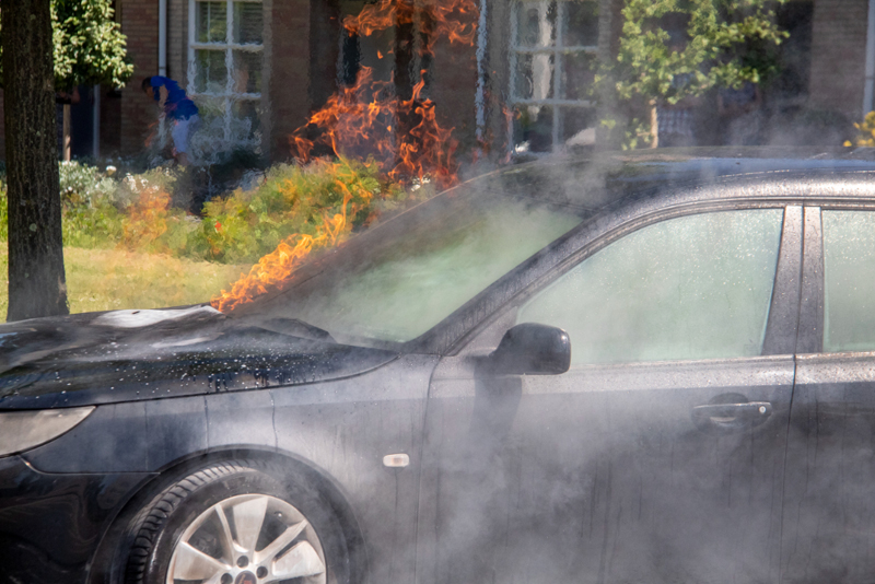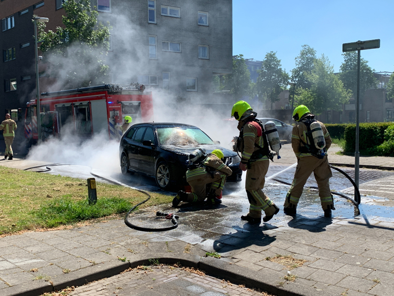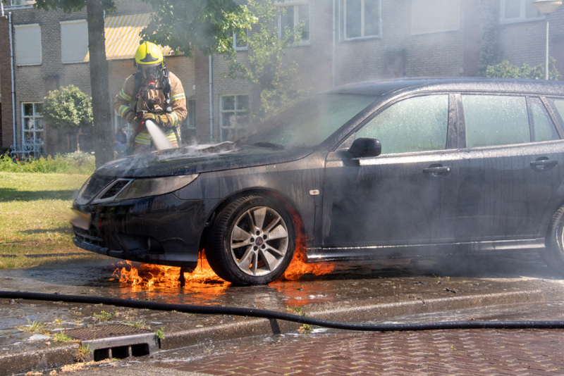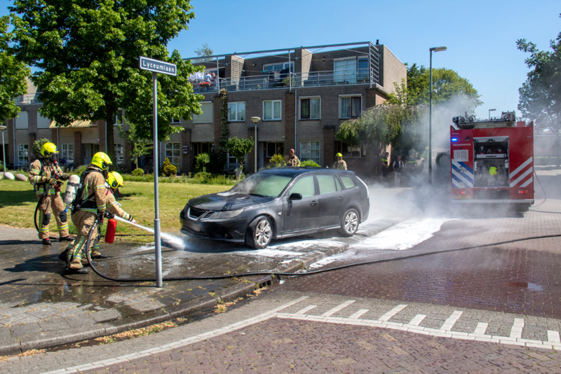 De auto stond op de stoep geparkeerd op de hoek van de Lyceumlaan. Op een gegeven moment kwamen steeds meer vlammen uit de auto geperst.