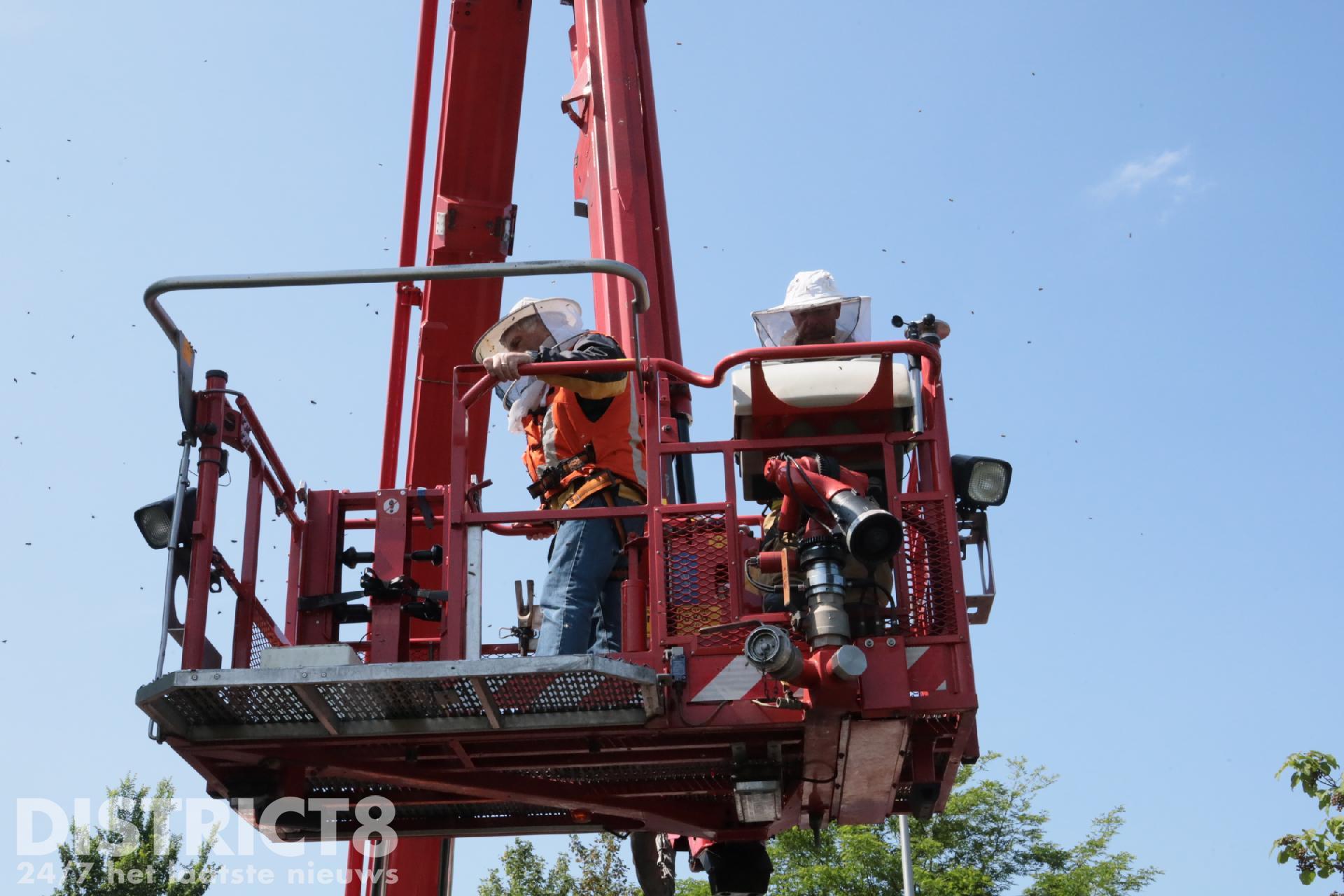 De imker kon niet bij de zwerm komen dus moest de brandweer er aan te pas komen. Door middel van een hoogwerker kon de klus snel geklaard worden.