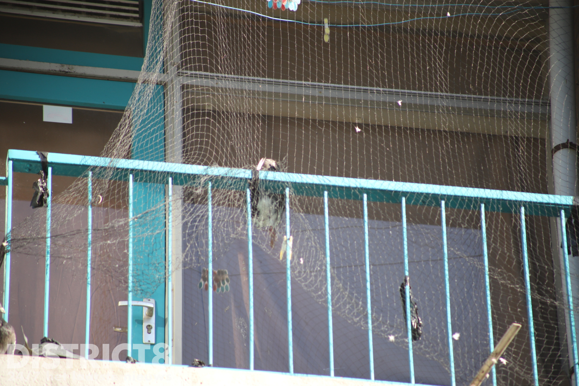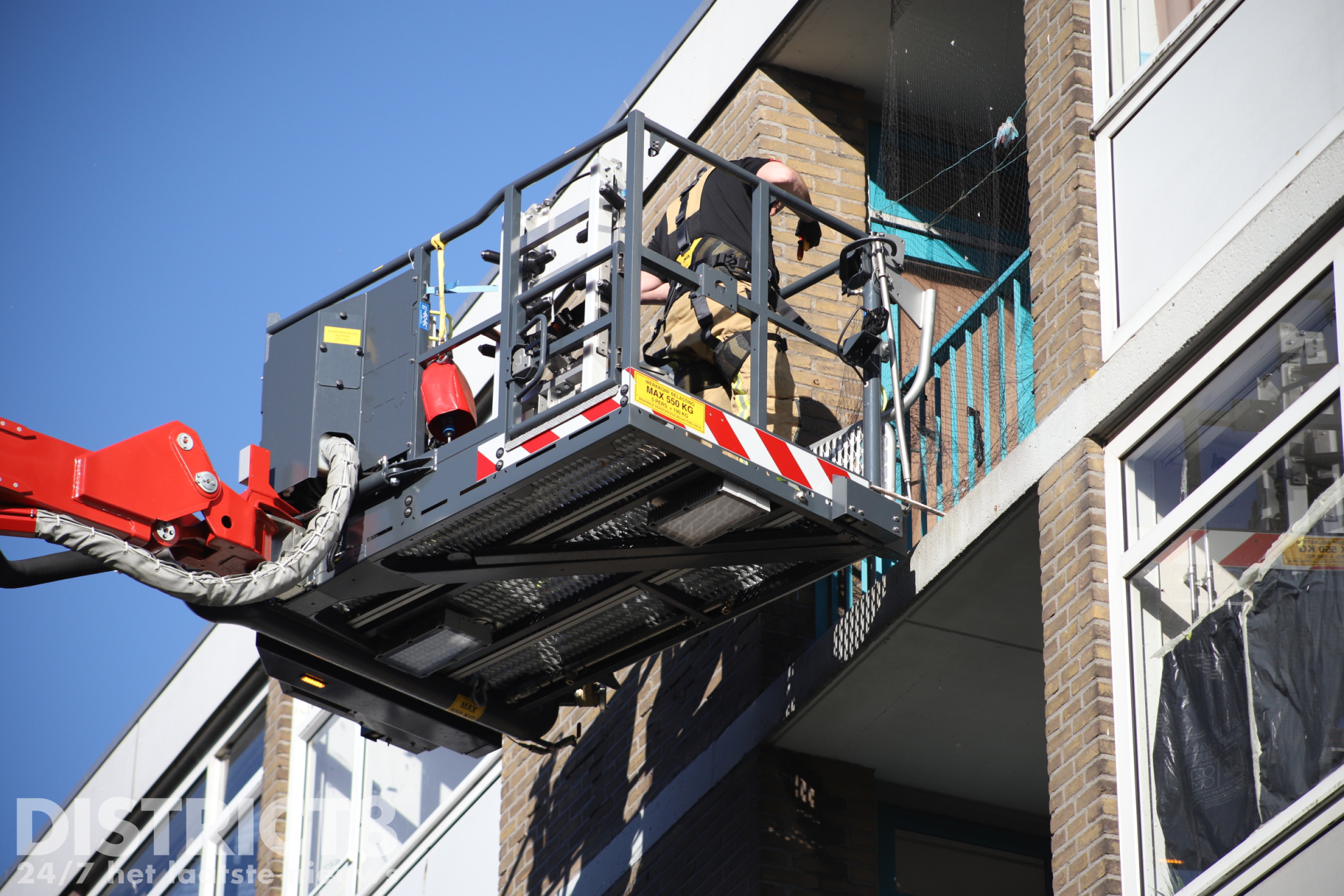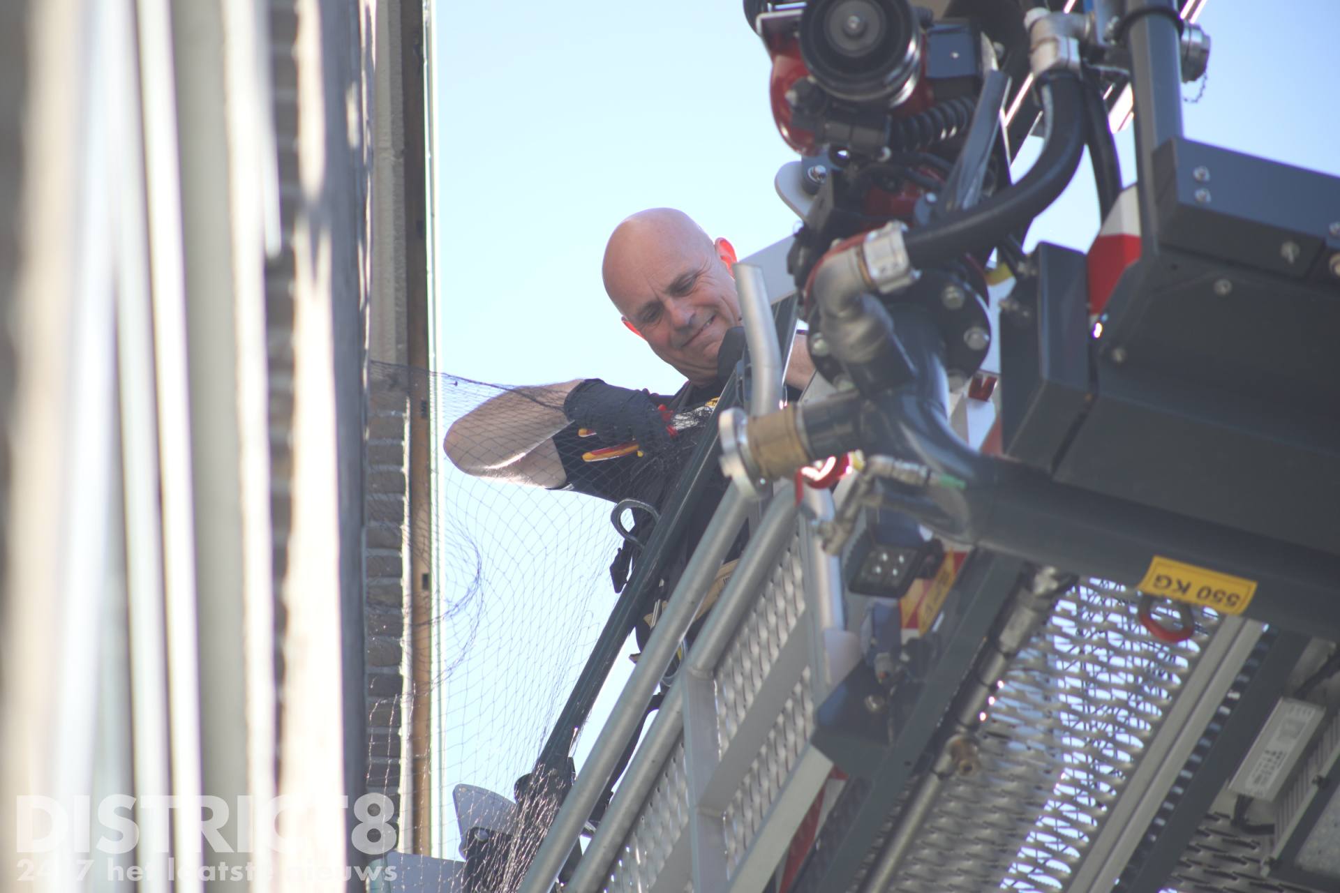 Een brandweerman heeft het net op het balkon bereikt en de duif losgeknipt. Na de bevrijding verwijderde de brandweer het hele net van het balkon. Op de grond werd de duif losgelaten.