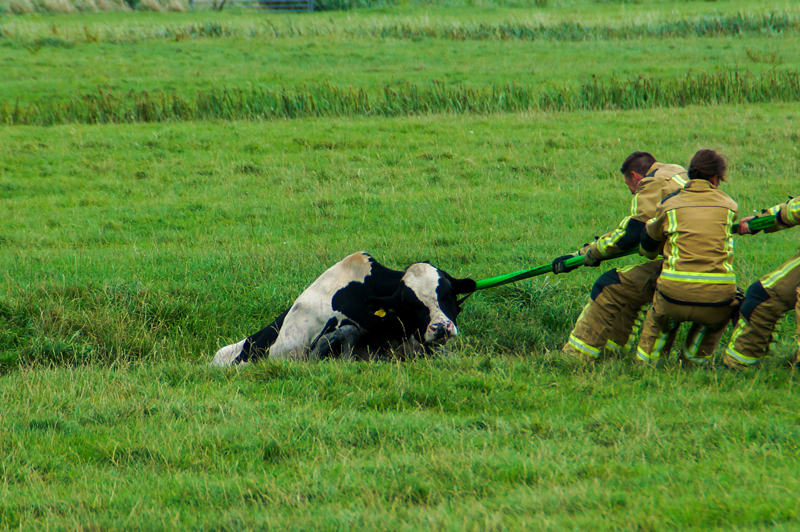 De brandweer heeft met behulp van touwen en voldoende mankracht de koe uit de sloot gehaald. De koe maakt het goed.