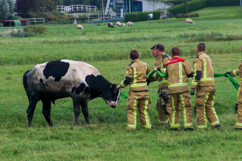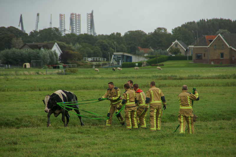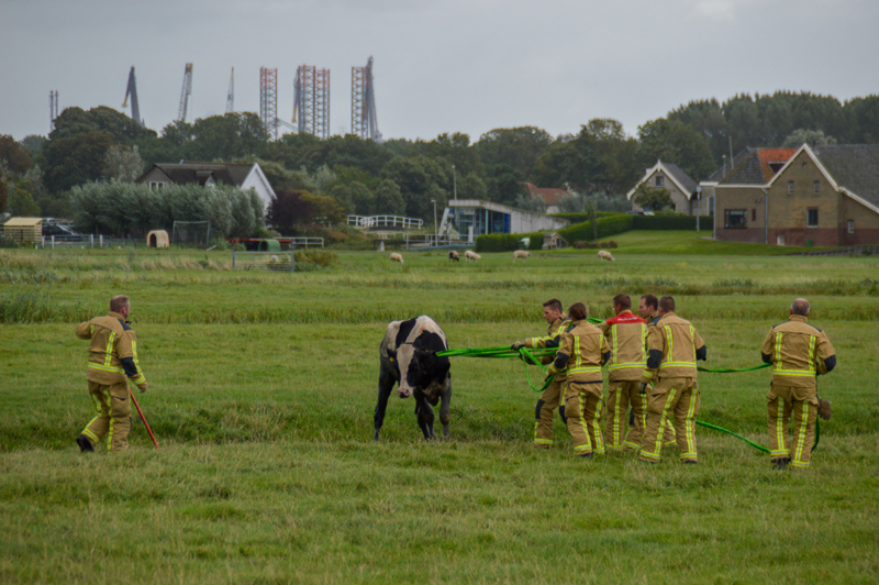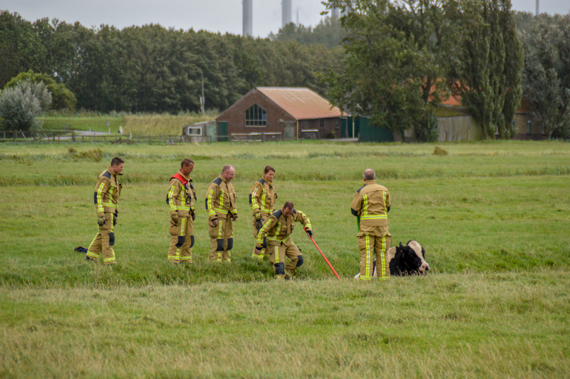 Maasland – Een automobilist(e) zag zondagmiddag vanaf de snelweg A20 een koe in de sloot liggen en schakelde de brandweer van kazerne Maasland in om de koe uit de sloot te halen.