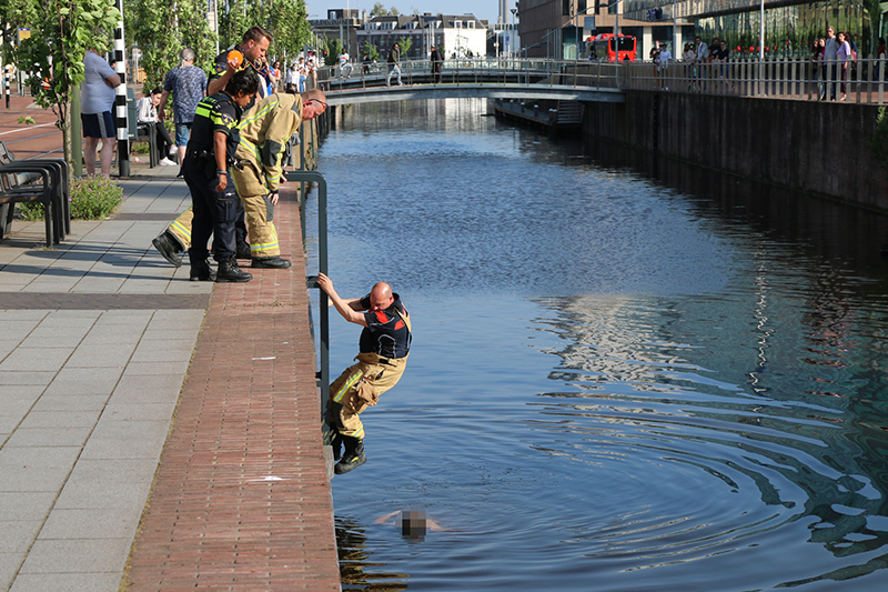 Duikers van de brandweer zijn niet veel later via de overzijde te water gegaan en hebben de man aan de kant geholpen.