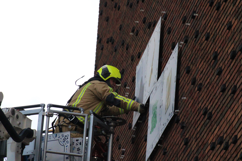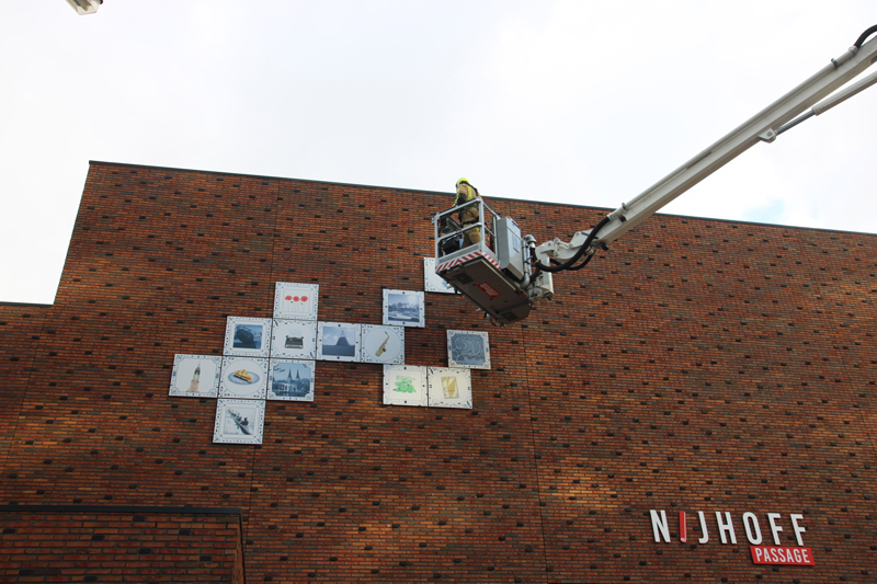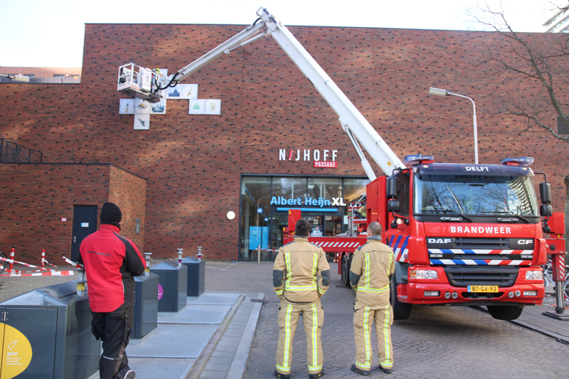 Ter plaatse bleek dat er borden verwijdert moesten worden aan een pand van de Nijhoff-passage. De brandweer zonder spoed met de hoogwerker ter plaatse aangezien de borden op enige hoogte hingen, een brandweerman heeft de borden vakkundig verwijdert. Een uitgang van de Nijhoff-passage was korte tijd afgesloten.