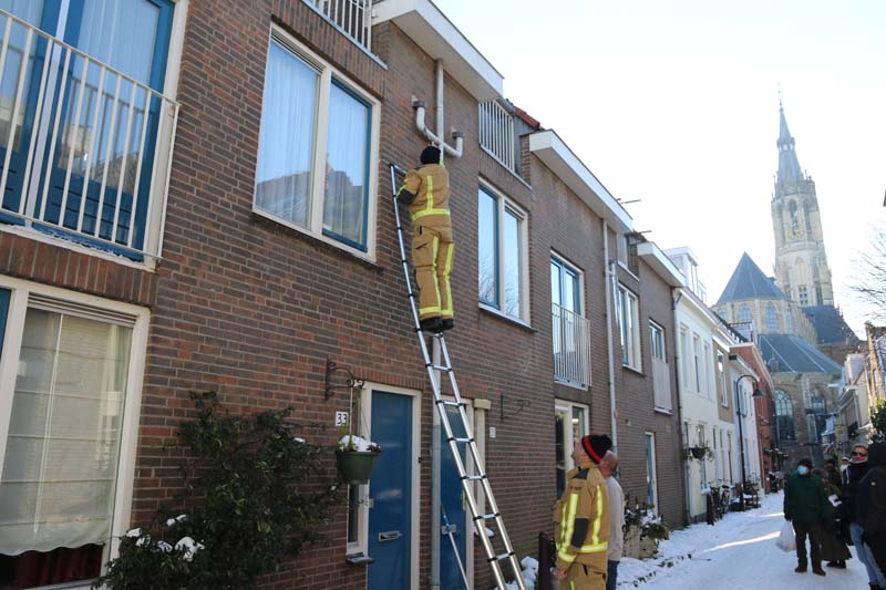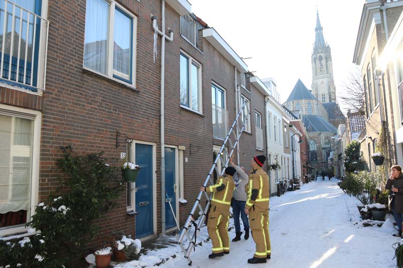 Home Delft Brandweer verwijdert grote ijspegels aan regenpijp Trompetstraat Delft
