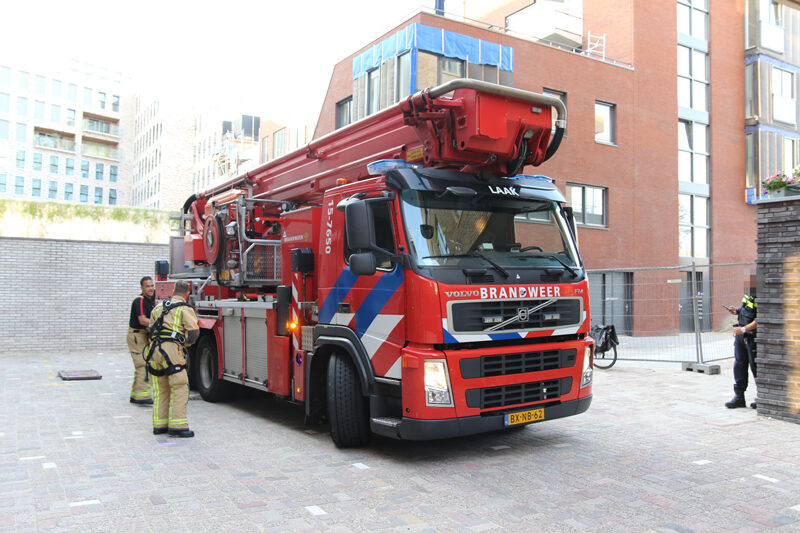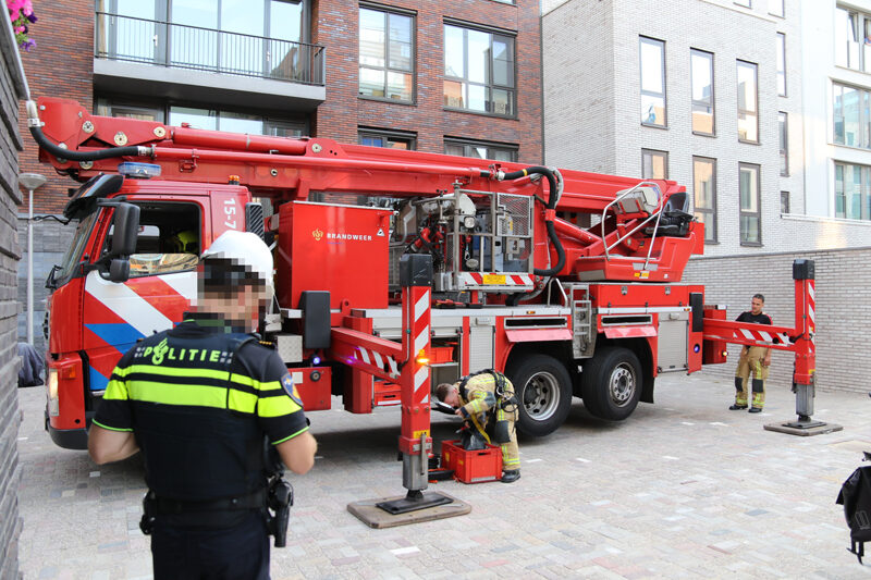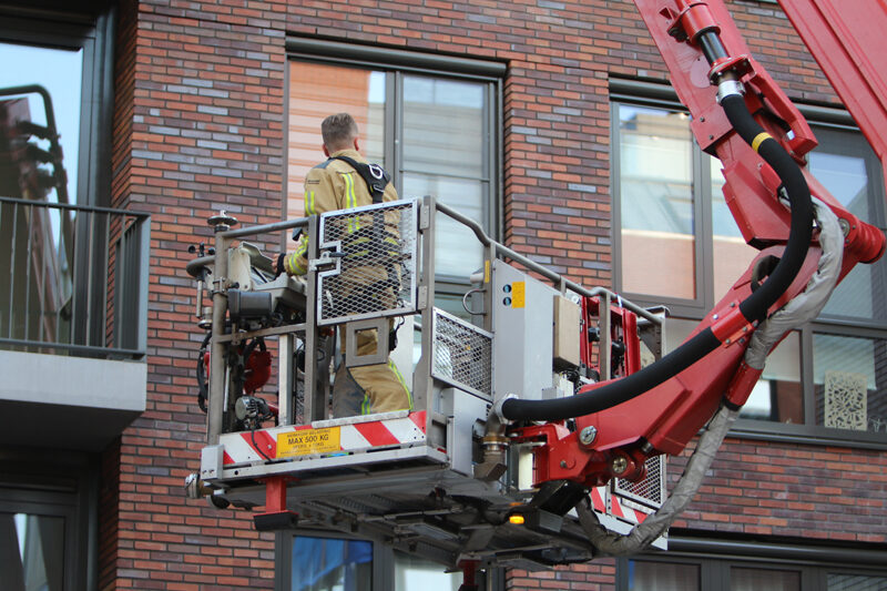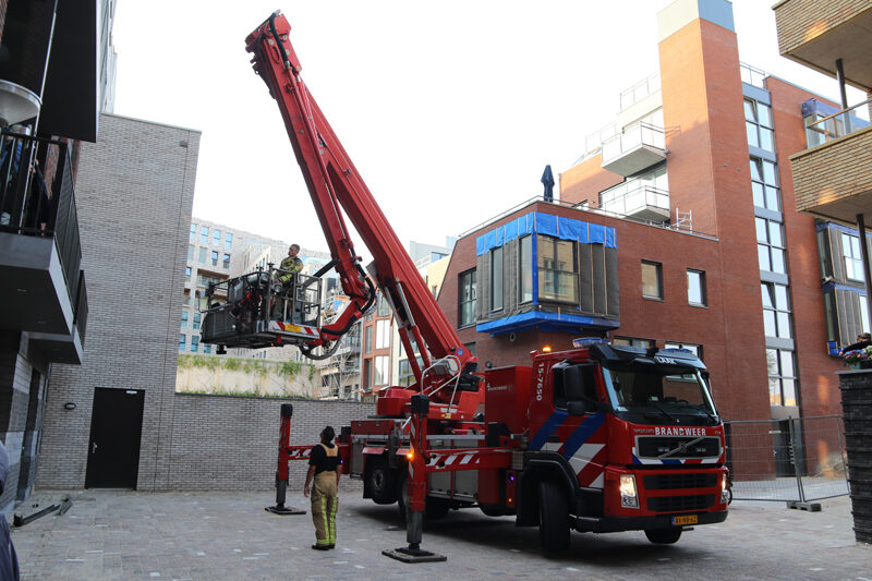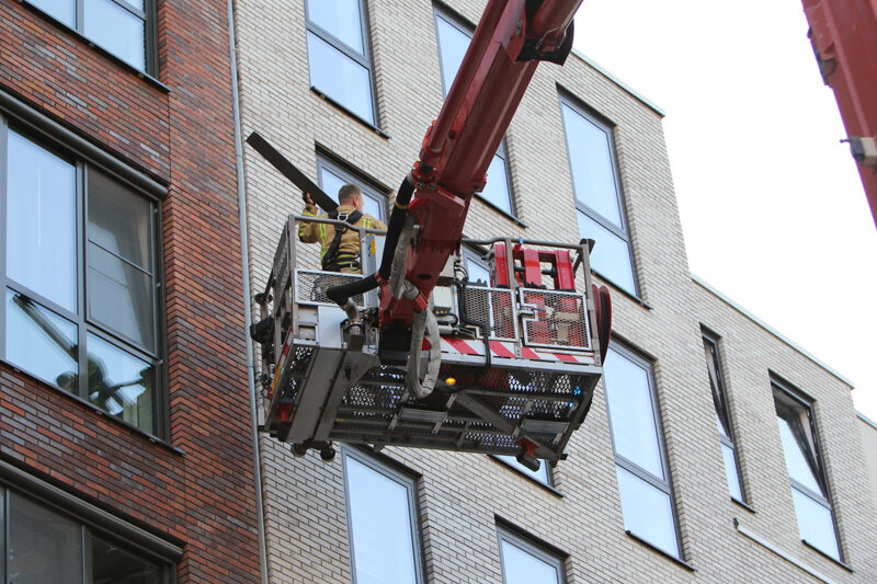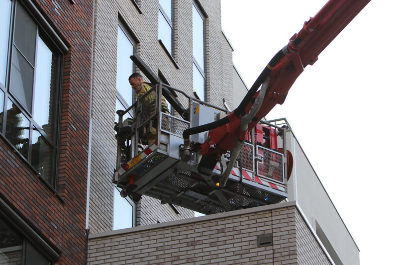 De brandweer kwam ter plaatse. Zij hebben met een hoogwerker de loshangende regenpijp onderdelen losgehaald en veilig naar beneden gebracht.