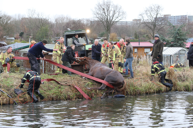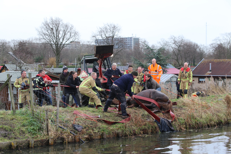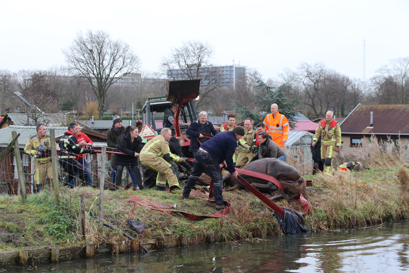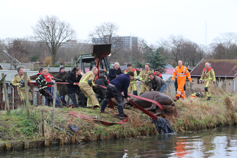 Bij aankomst van deze speciale wagen was er ook al een tractor ter plaatse gekomen, deze heeft samen met alle brandweermannen en omstanders het paard op het droge getrokken.