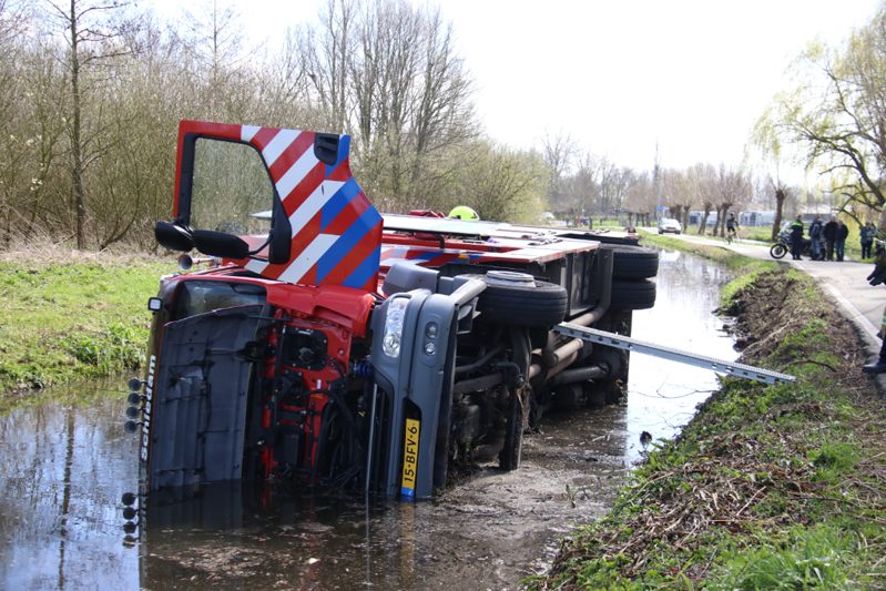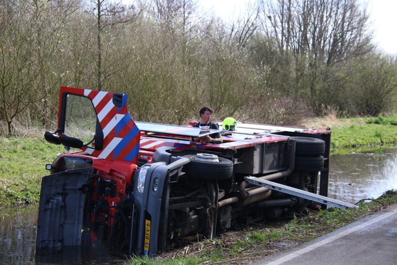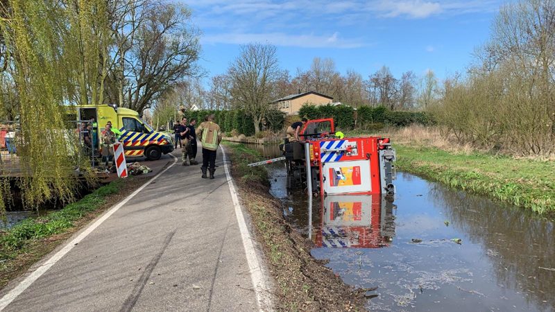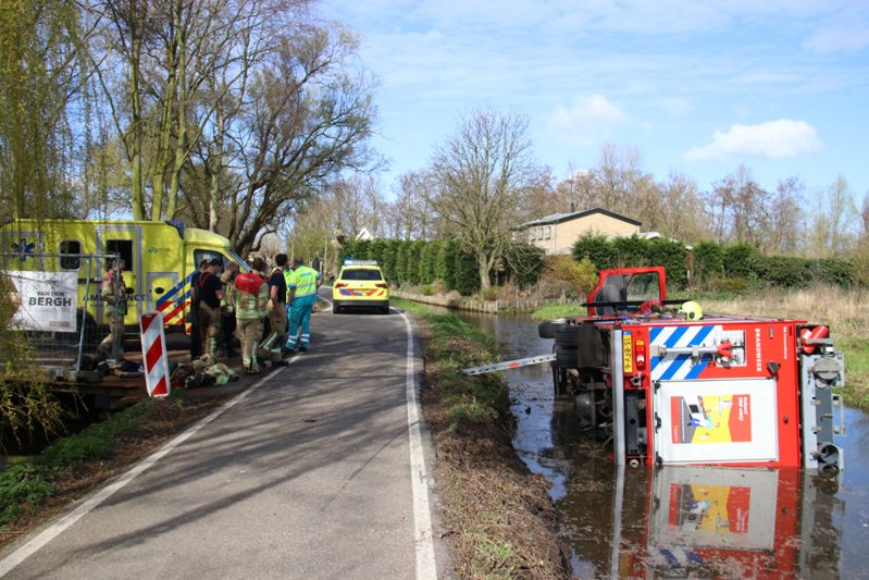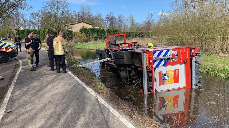 Schiedam – Zondagmiddag is de tankautospuit van de brandweer Schiedam op zijn kant in het water terecht gekomen. De brandweer was op weg naar een ongeval met een trein nabij de Groeneweg. Het rechtervoorwiel kwam in de berm terecht op het smalle weggedeelte en zakte weg met alle gevolgen van dien. De brandweerlieden handelde snel en wisten allen het voertuig ongedeerd te verlaten. Het zal nog een flinke klus worden het zware voertuig weer op de kant te krijgen.
