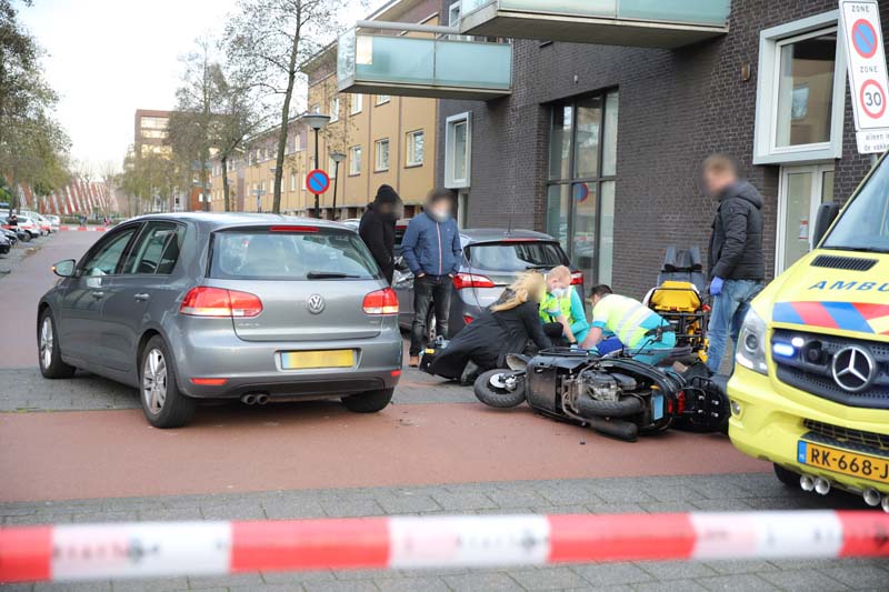 De automobilist wilde vanaf de Laan van Wateringseveld afslaan en zag de brommer die over het parallelgelegen fietspad reed over het hoofd. De brommerrijder kwam hard ten val op de stoep en raakte gewond.