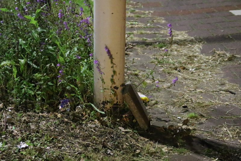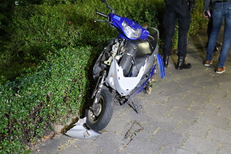 Het fietspad was tijdelijk afgezet met lint zodat de hulpdiensten veilig konden werken. De brommer raakte flink beschadigd en is op de stoep op slot gezet door de politie.