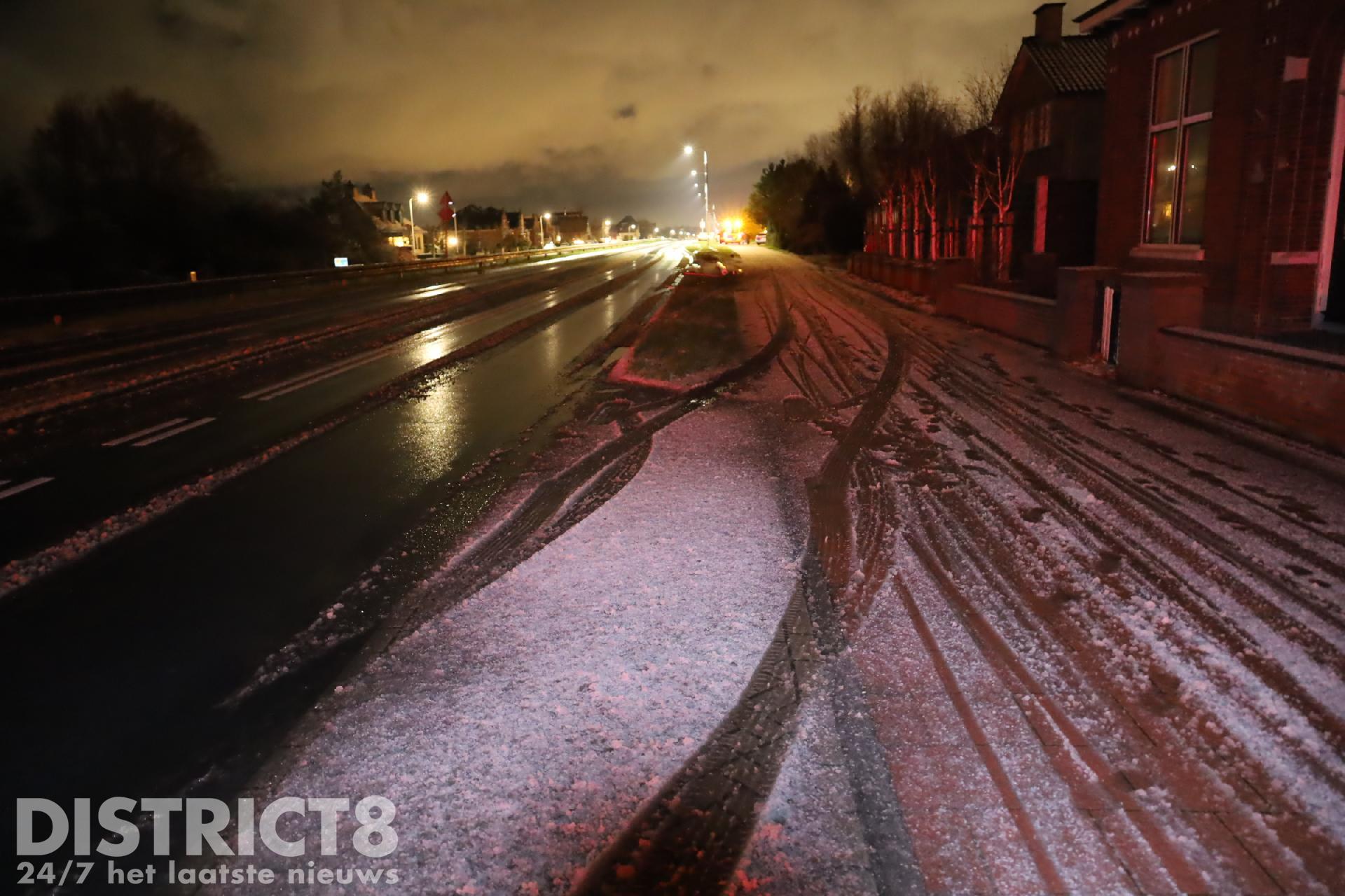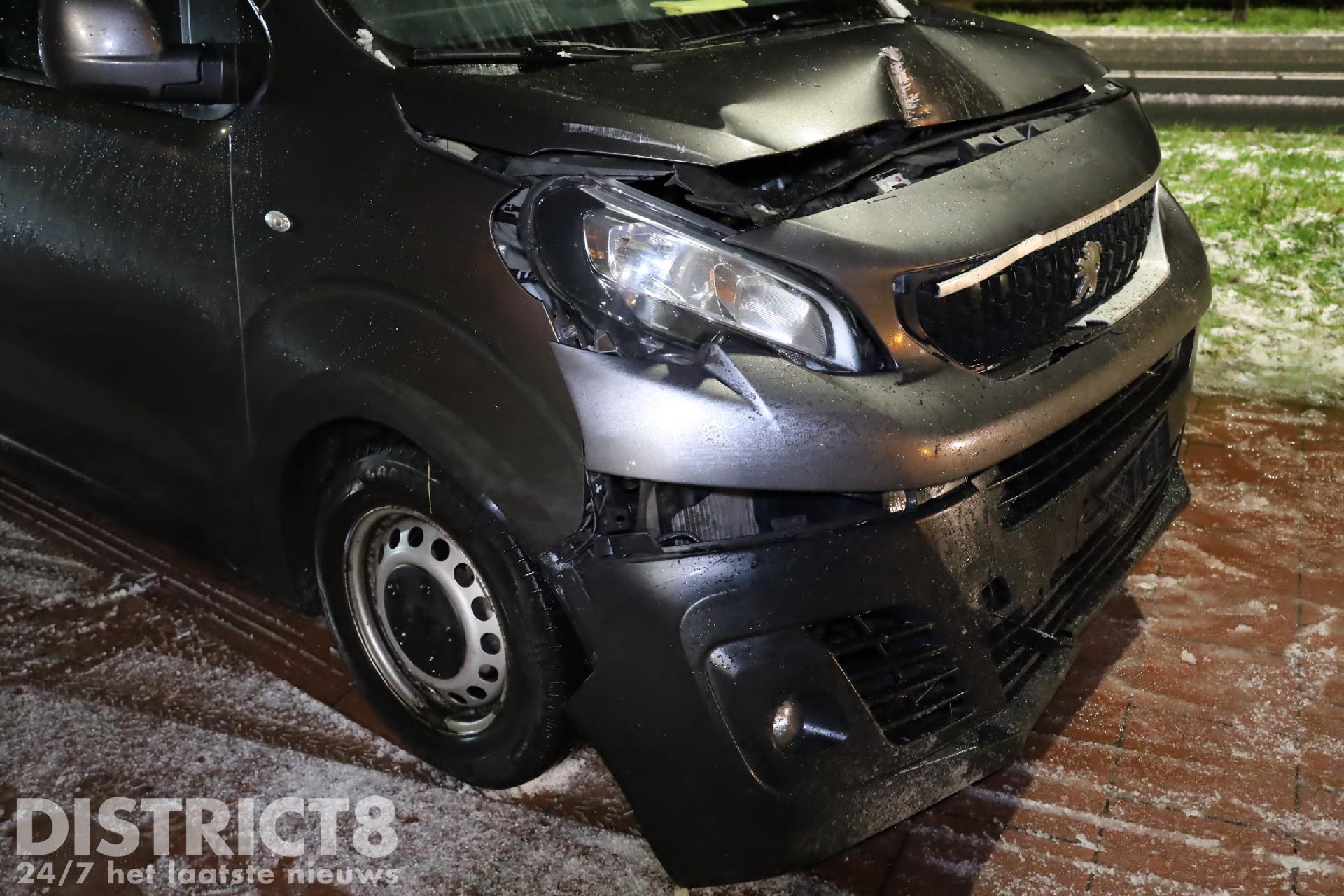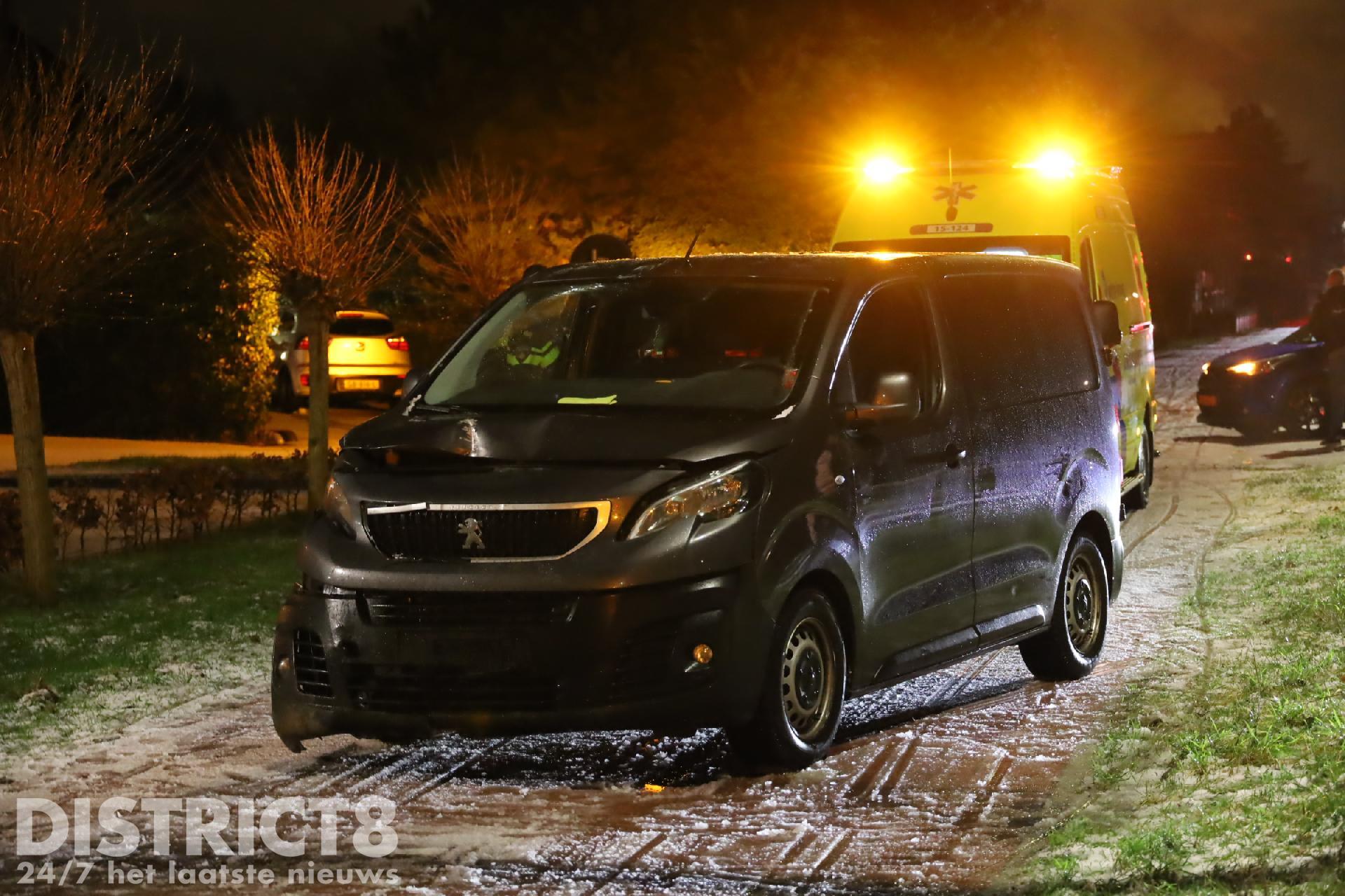 Rond kwart voor tien ging het mis. Door de gladheid begon het voertuig ongecontroleerd te glijden. Het busje gleed zover door dat twee lichtmasten het moesten ontgelden. Een derde lichtmast kon net aan worden ontweken.