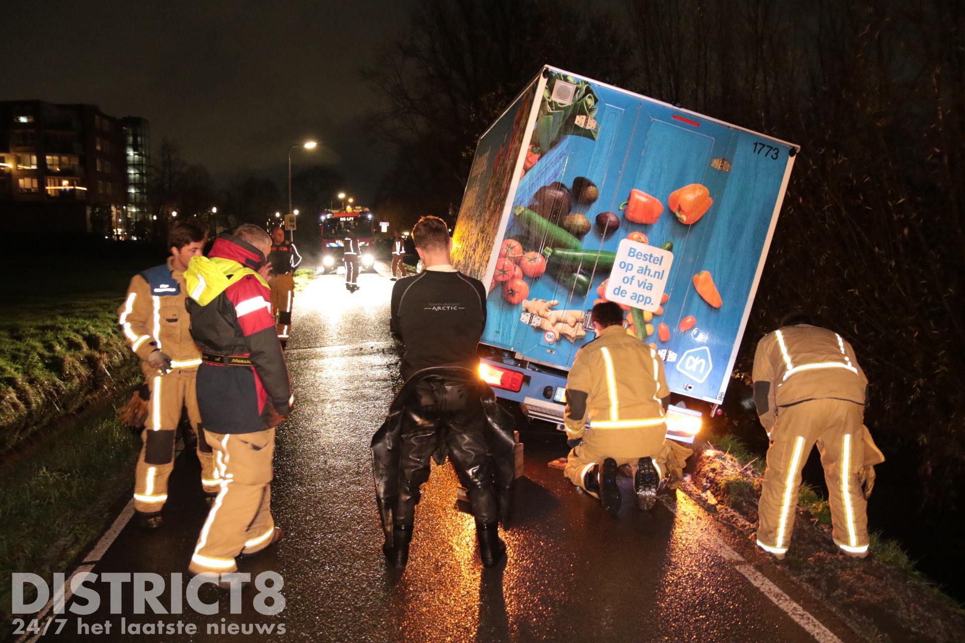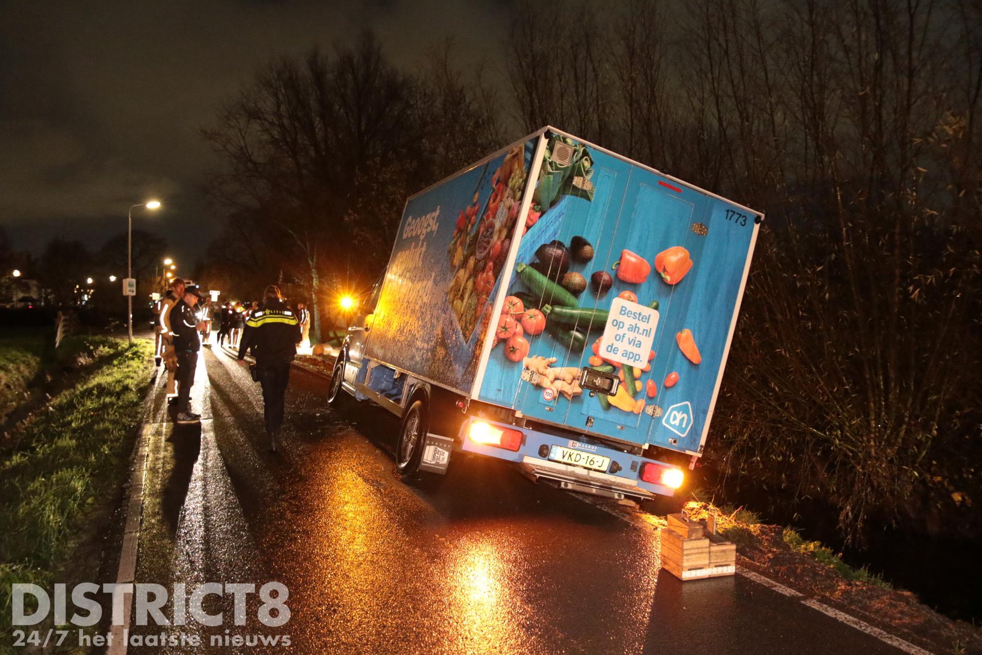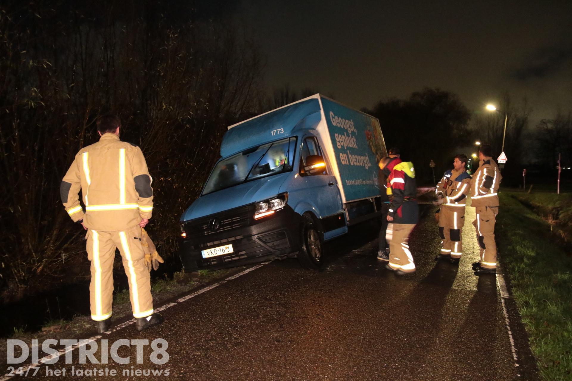 Enkele honderden meters verderop ging het ook mis. Een boodschappen bezorger van de Albert Heijn kwam naast de weg terecht. Door de zachte berm dreigt het busje de sloot in te zakken. De brandweer is bezig om het busje op het droge te houden.