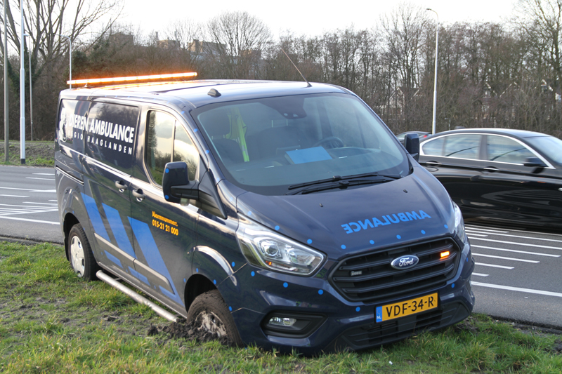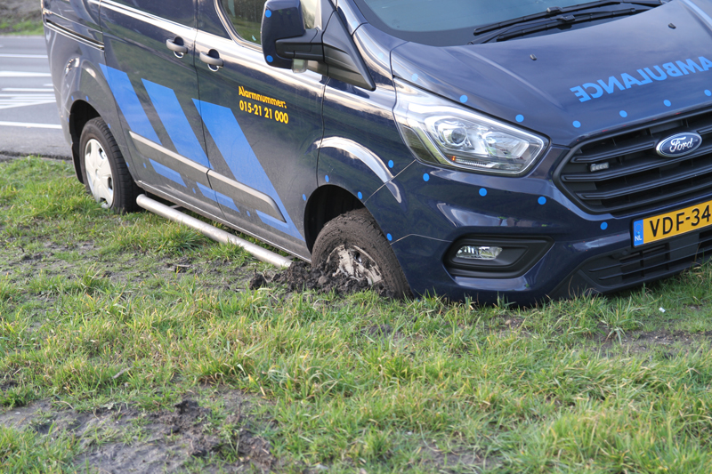 Delft – Een busje van de dierenambulance is woensdagmiddag vast komen te zitten in de berm langs de Kruithuisweg in Delft.