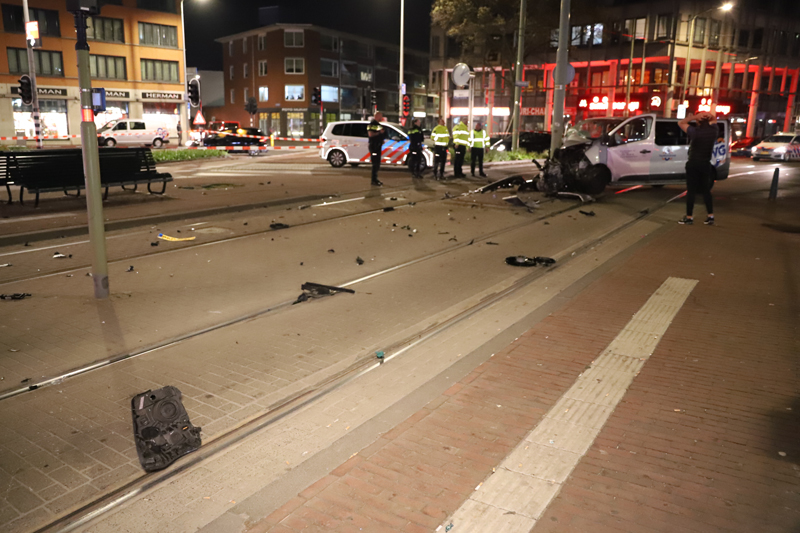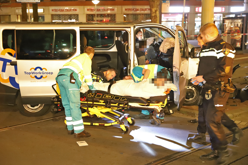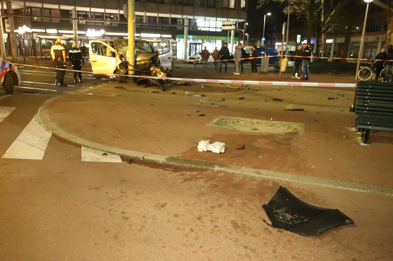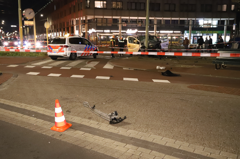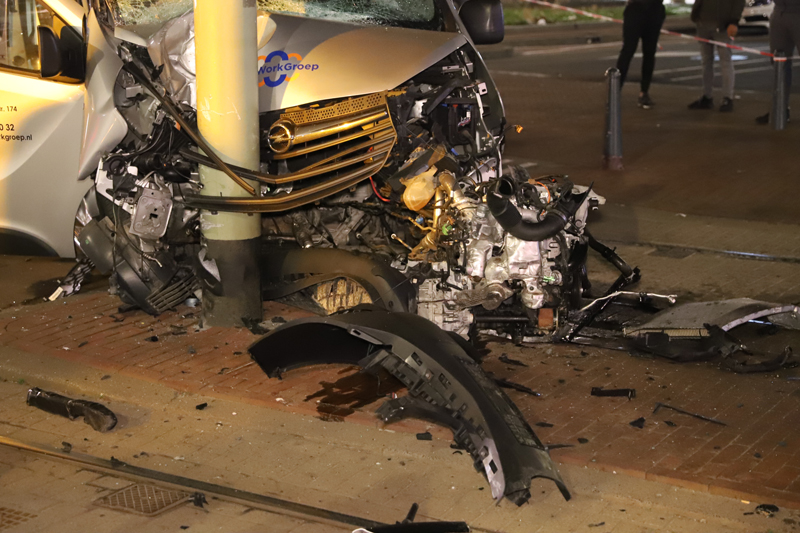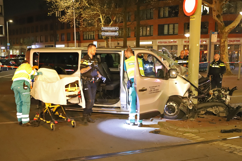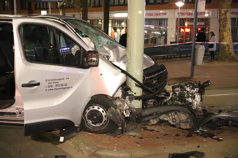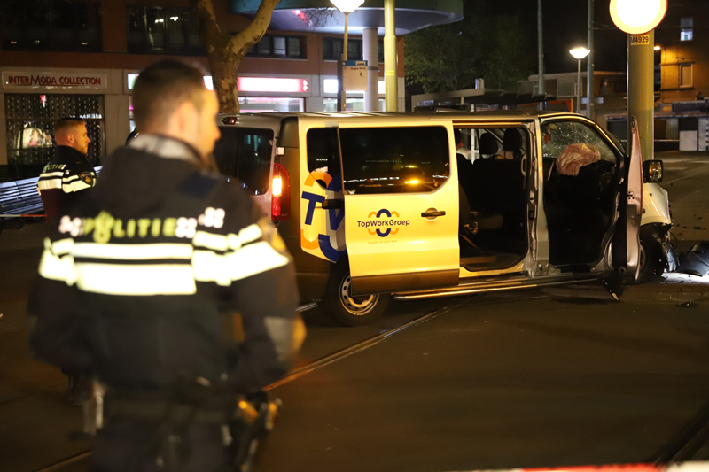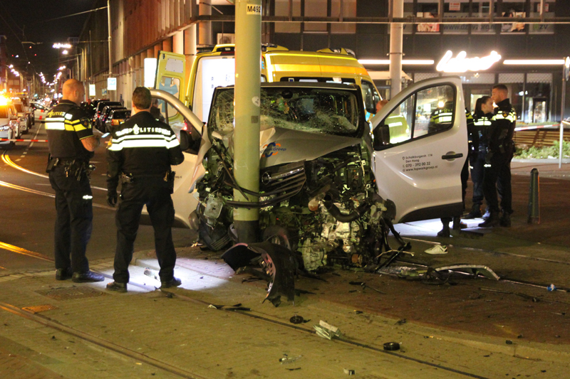 Den Haag – Op het Hobbemaplein in Den Haag is zondagnacht 14 april een busje frontaal tegen een bovenleidingsmast van de HTM gereden. Het busje raakte door de klap flink beschadigd.