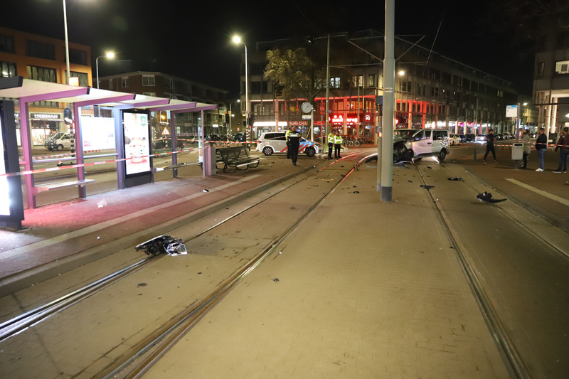 Door het ongeval moest tram 6 omrijden, ook lag een groot deel van de kruising onder de auto-onderdelen.