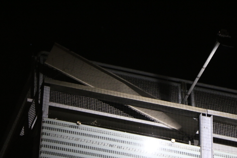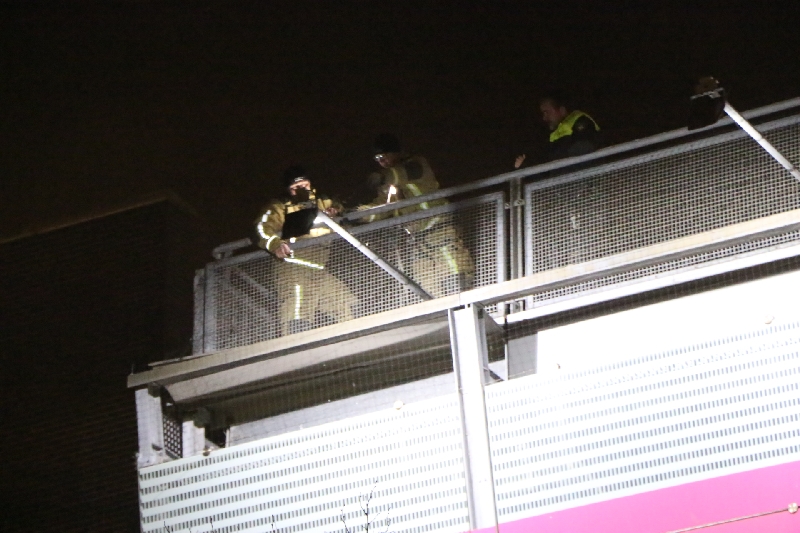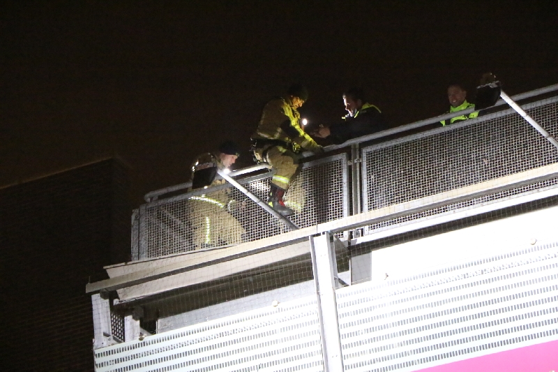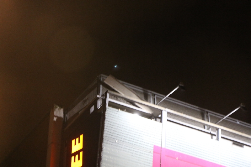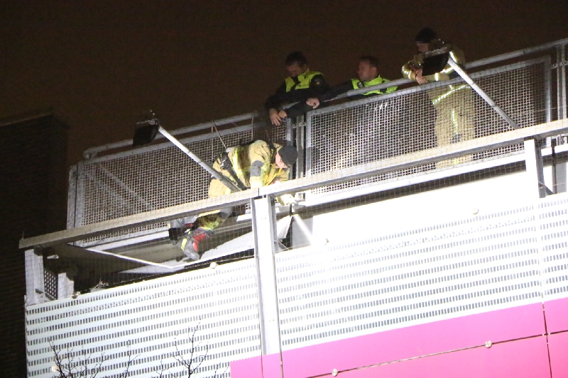 De brandweer kwam met een hoogwerker ter plaatse. Maar door de harde wind kon de hoogwerker niet ingezet worden. Gelukkig kon de brandweer via het parkeerdek dichterbij de dakplaat komen. Doordat een brandweerman goed gezekerd over het hekje van het parkeerdek kon stappen was het gevaar snel geweken en kon de dakplaat worden verwijderd.