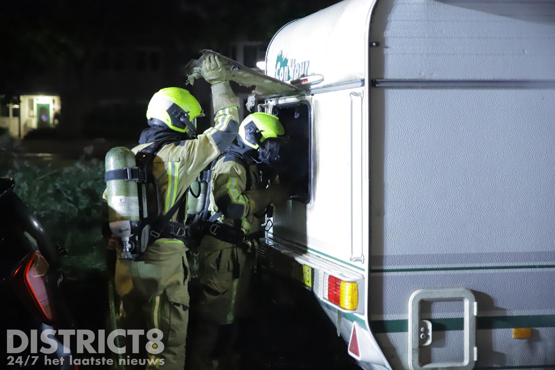 De brand heeft de volledige caravan verwoest. De brandweer heeft verschillende ramen en de deur moeten forceren om de brand volledig te kunnen blussen.