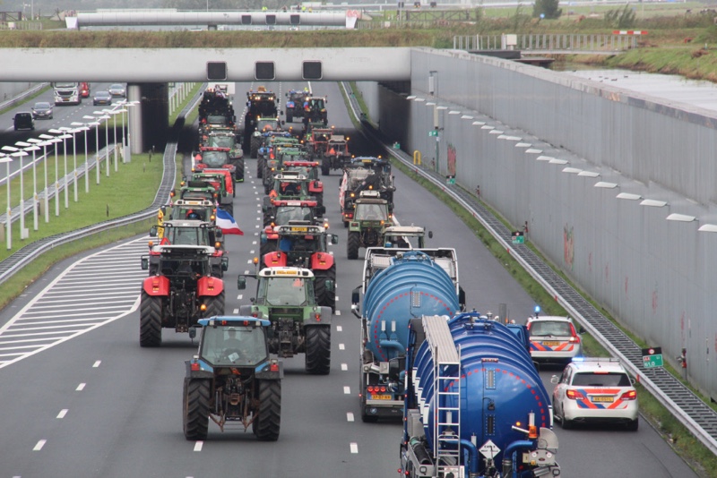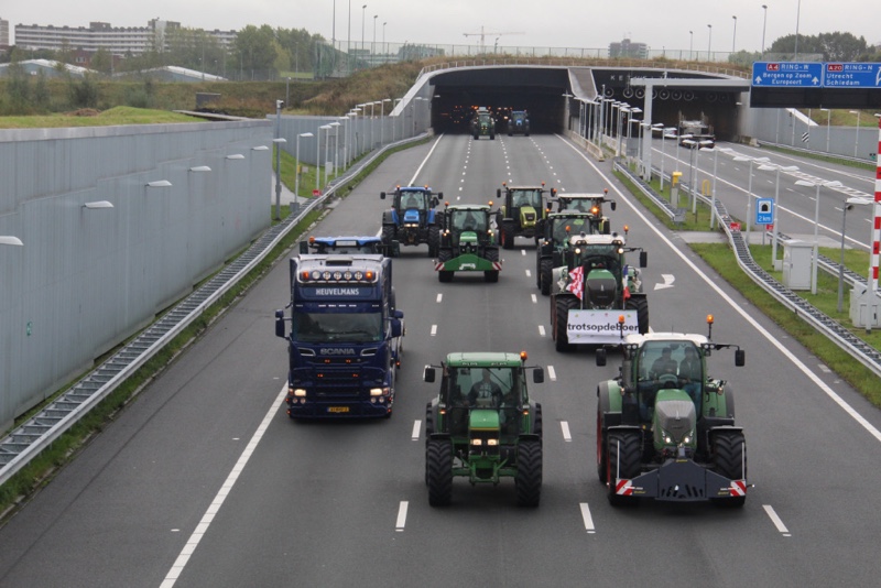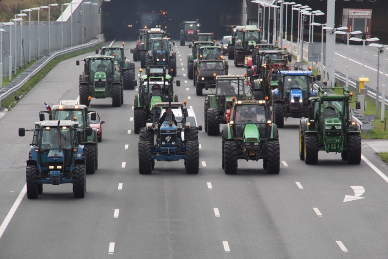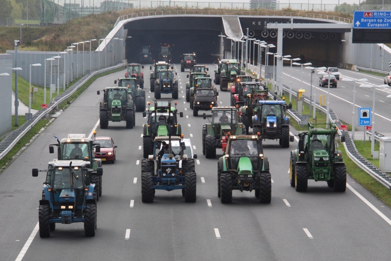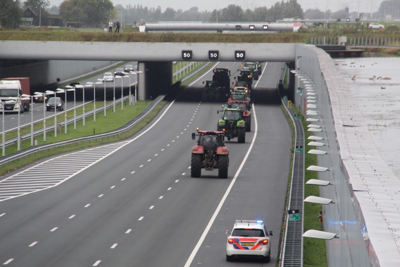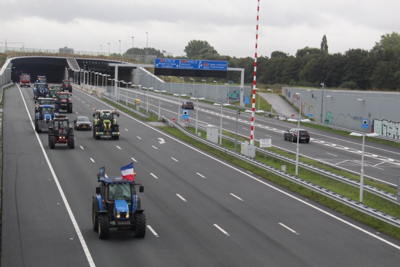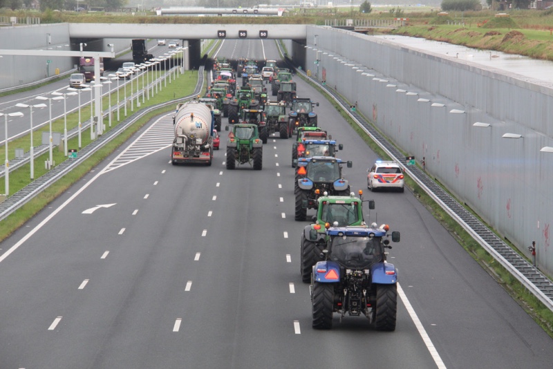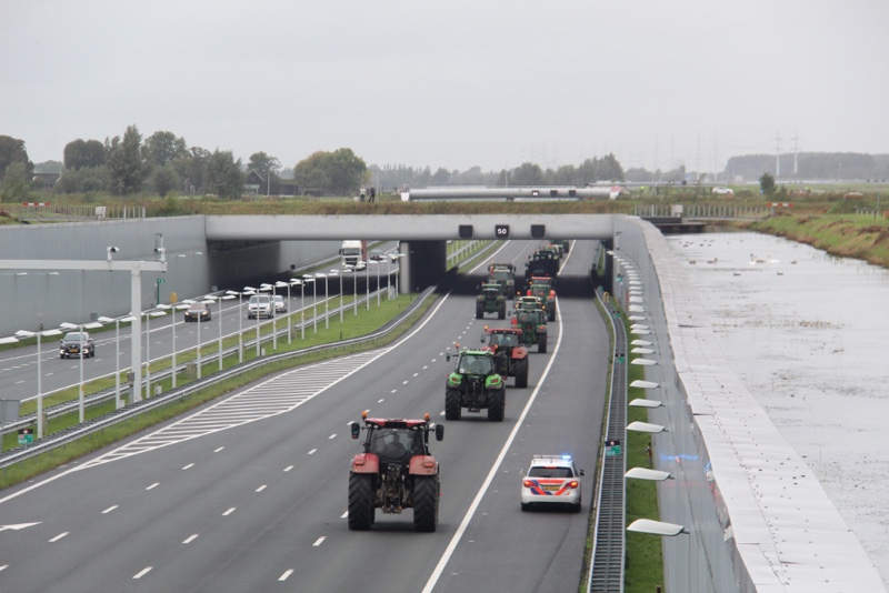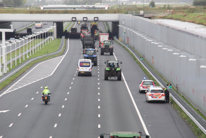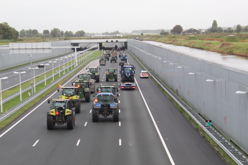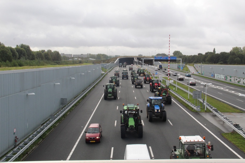 De tractoren rijden massaal over de snelweg met 30km/u wat voor een flinke verkeersopstopping zorgt. Er wordt over de hele breedte van de rijbaan gereden.