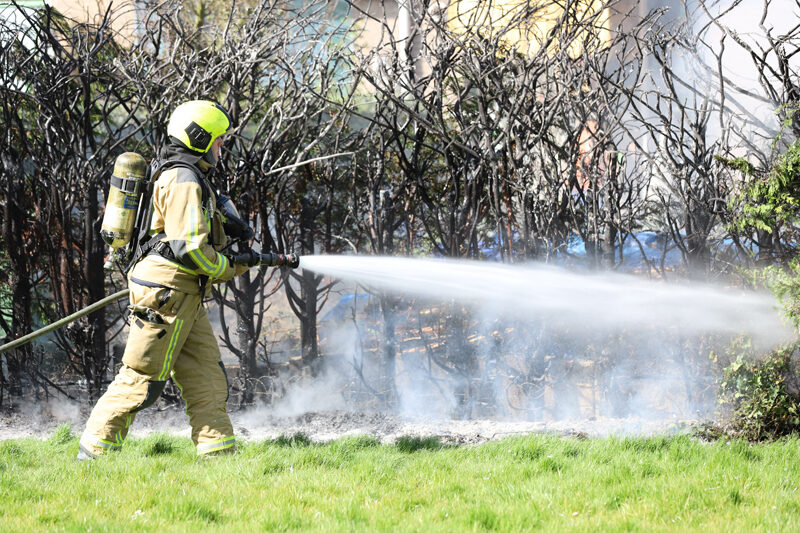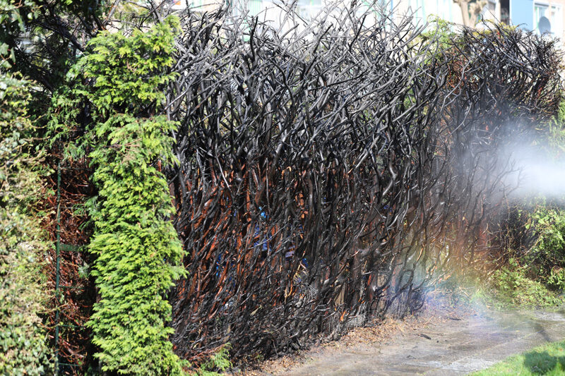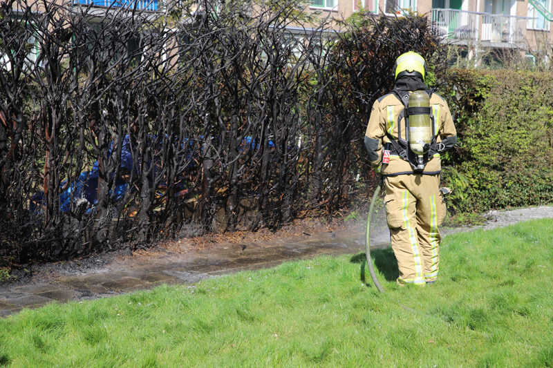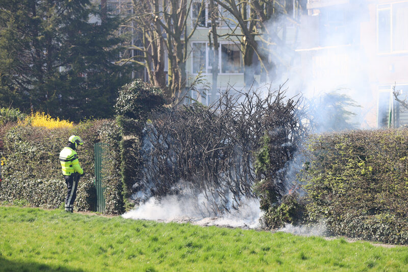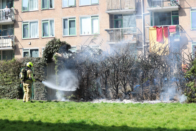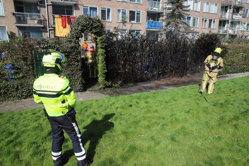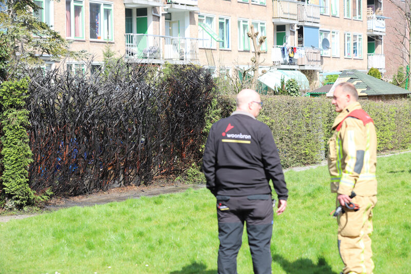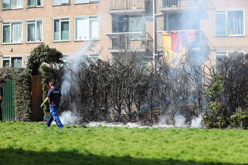 Delft – Woensdagmiddag 31 maart is een stuk coniferen haag volledig uitgebrand op de achterplaats van een aantal portiekwoningen langs de Frank van Borselenstraat in Delft.