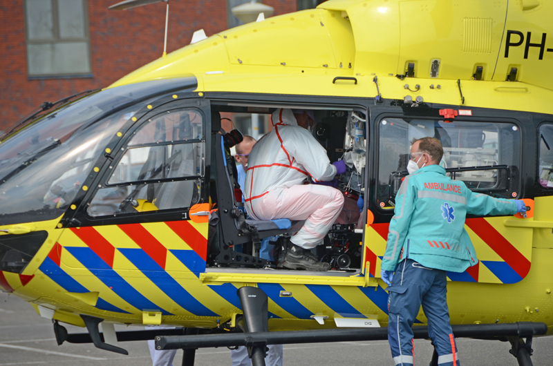Deze helikopter die normaal gesproken wordt ingezet voor het medische vervoer vanaf de Waddeneilanden naar het vaste land wordt sinds enkele weken ingezet voor de gigantische logistieke uitdaging om de coronapatiënten te verdelen over het hele land.