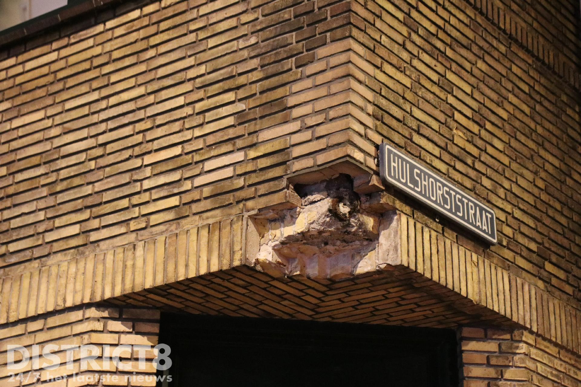 Een flink aantal bakstenen lagen op straat en er is een groot gat te zien. De politie heeft de gedeelte van de stoep afgezet met linten.