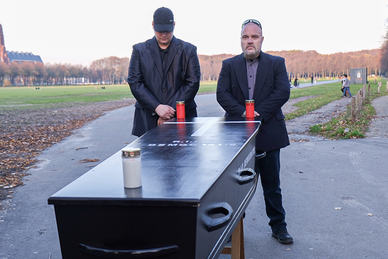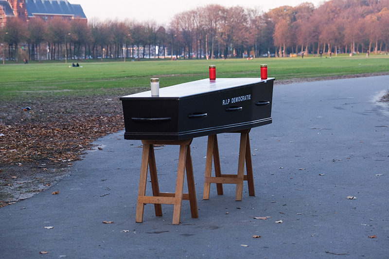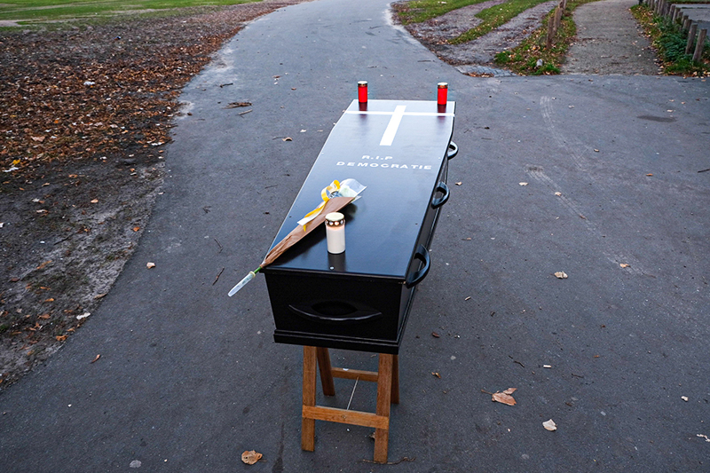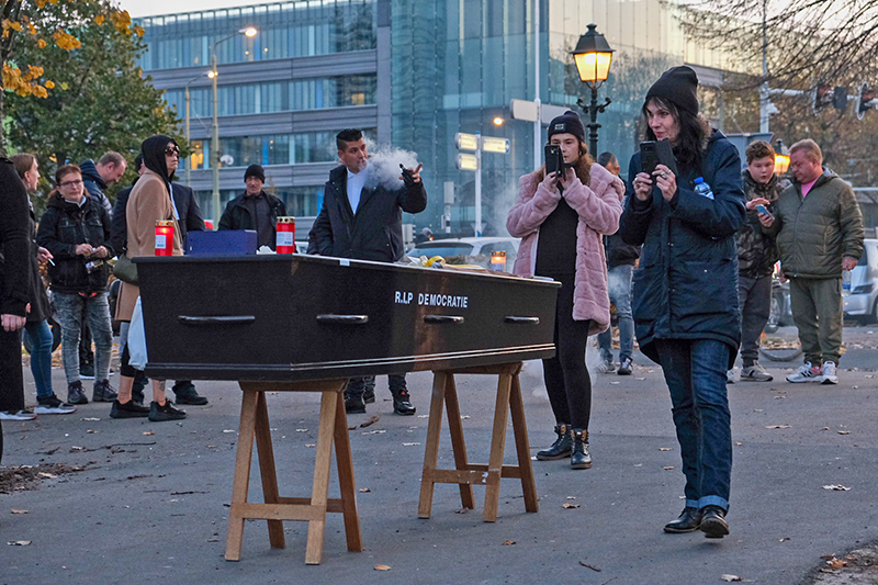 Den Haag – Op het Malieveld in Den Haag wordt momenteel een denkbeeldige begrafenis gehouden door tientallen demonstranten. De aanwezigen hebben een doodskist neergezet waarop te lezen is: RIP de democratie. De politie is in grote aantallen aanwezig inclusief politie te paard, ME en bikers. Diverse mensen hebben rozen neergelegd ter nagedachtenis aan de democratie.