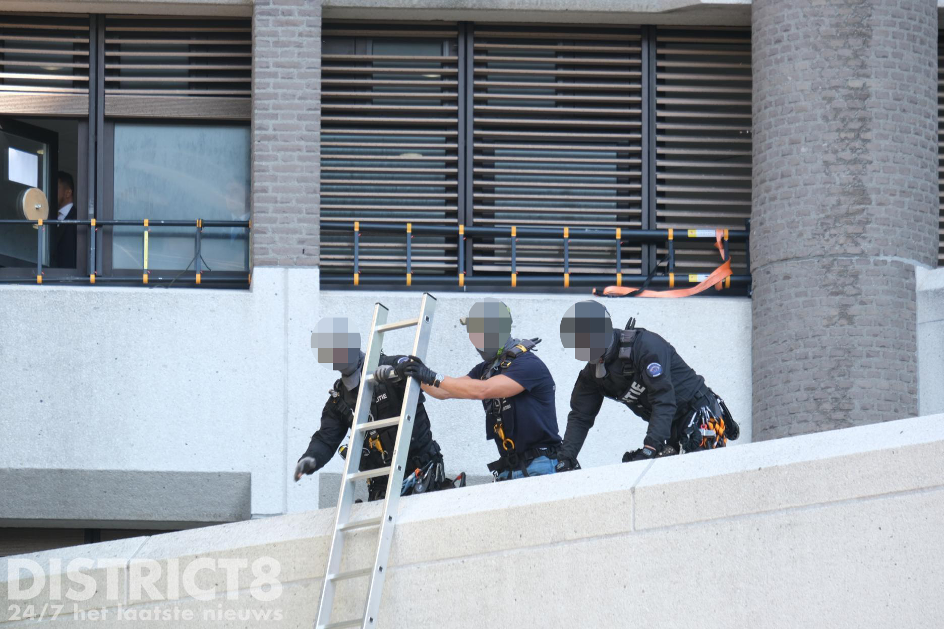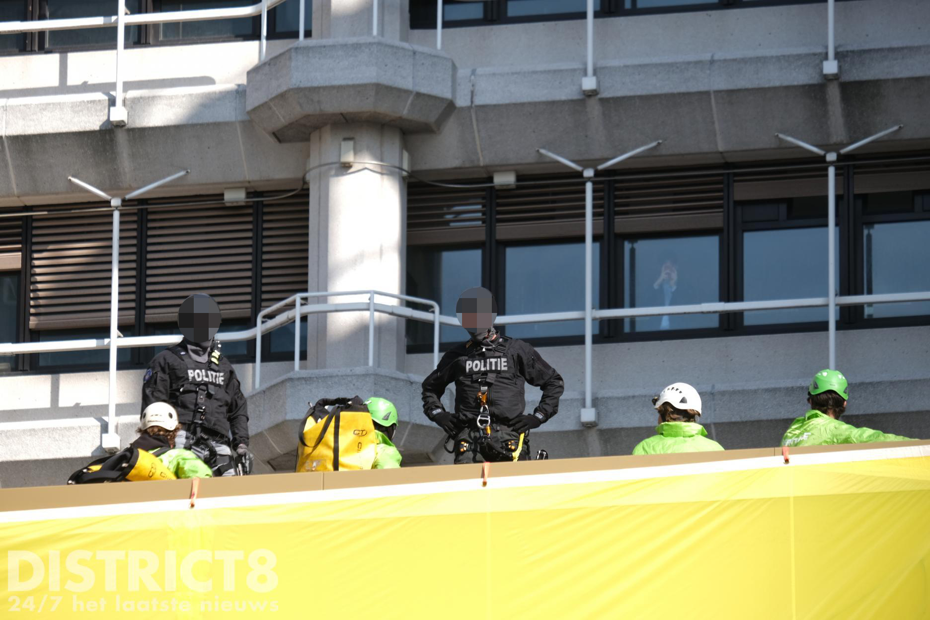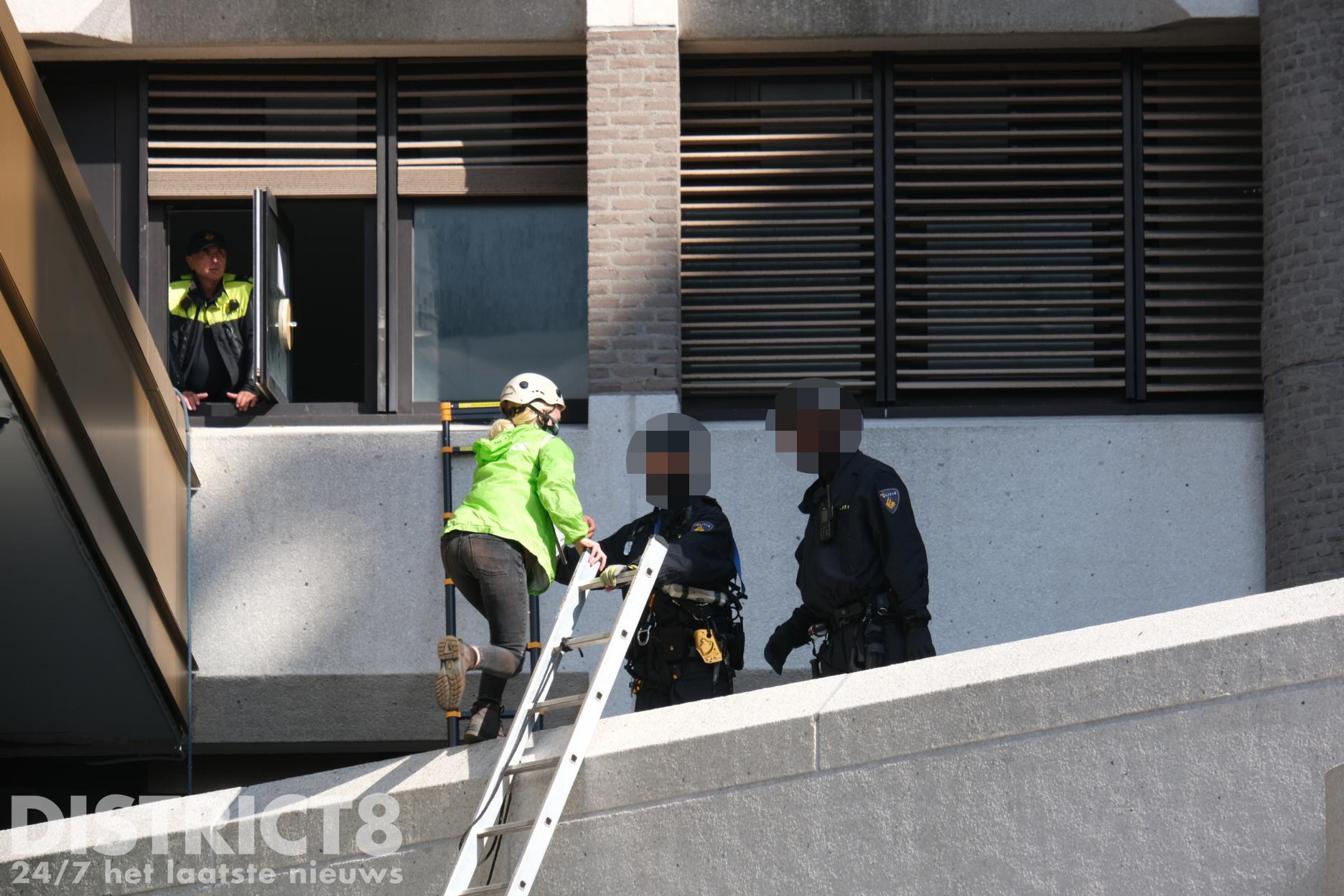 Inmiddels zijn agenten en leden van de Dienst Speciale Interventies het dak op gegaan en hebben de demonstranten aangehouden.