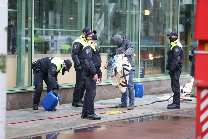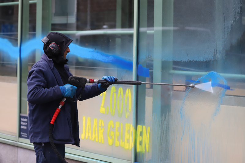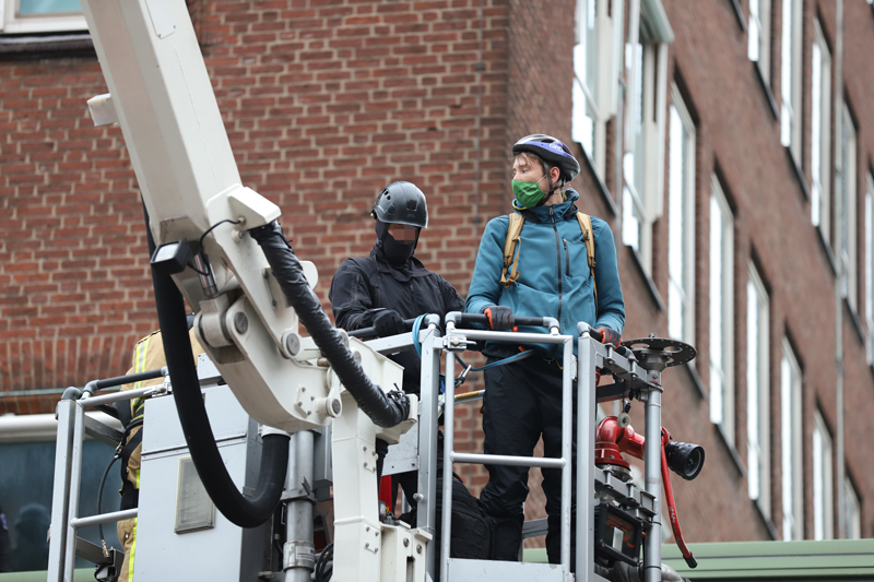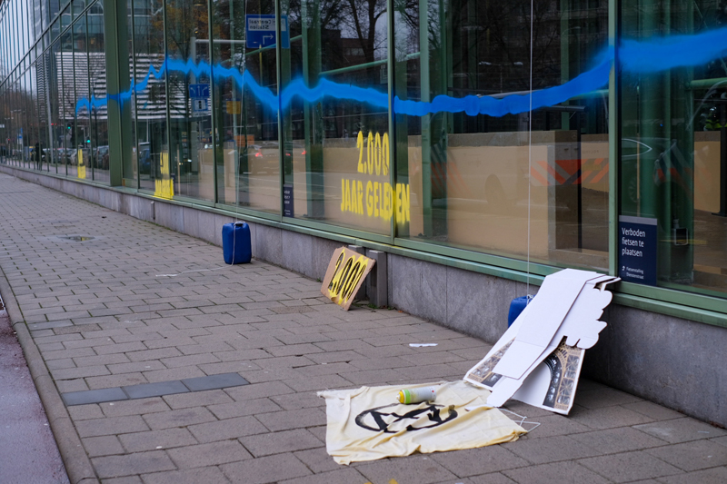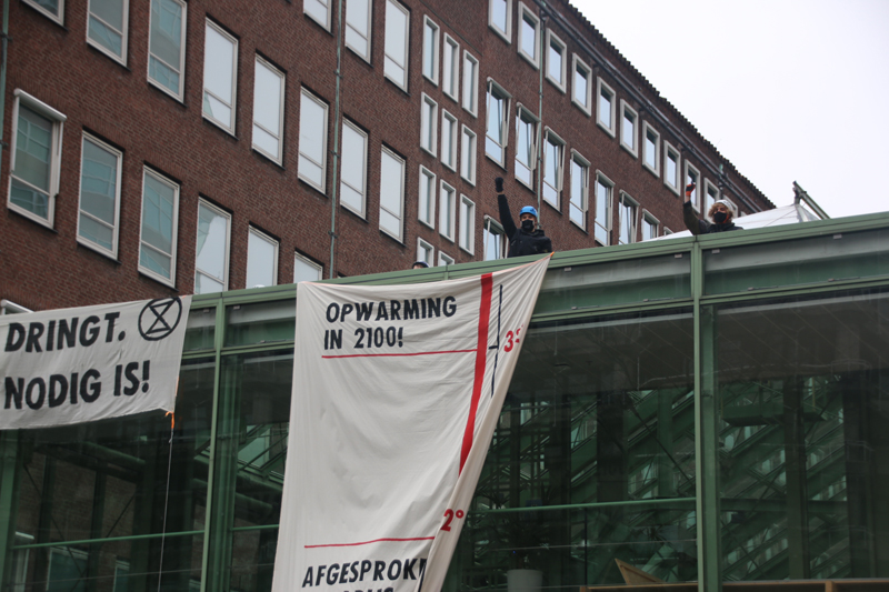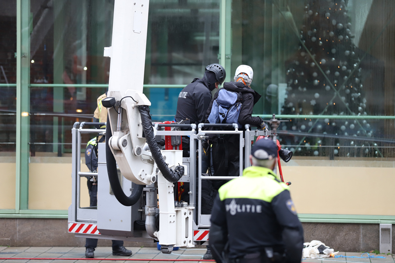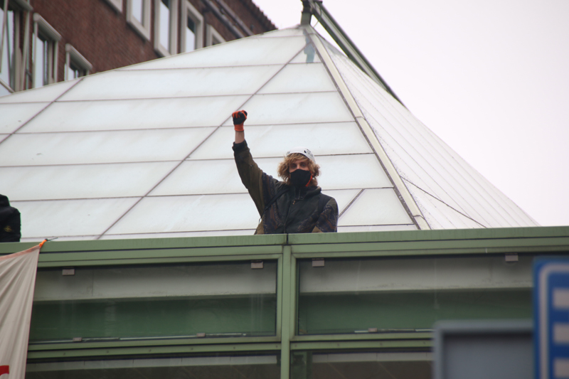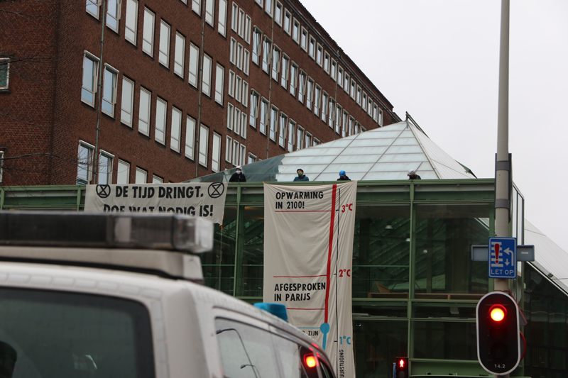 De demonstranten krijgen hiervoor een proces verbaal. Het arrestatieteam en een onderhandelaar van de politie zijn met spoed ter plaatse gekomen omdat er vier personen op het dak zitten van het Ministerie van Economische Zaken.