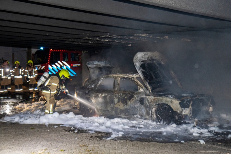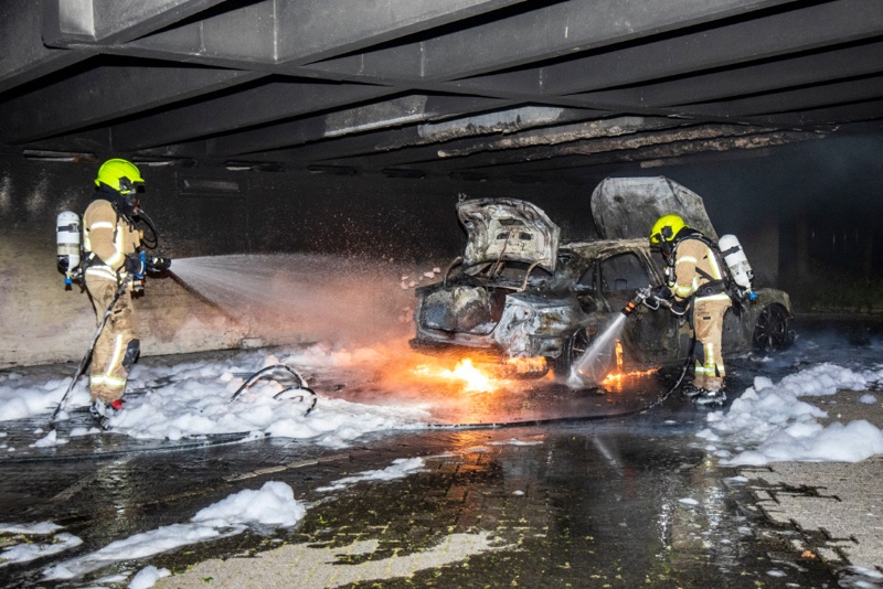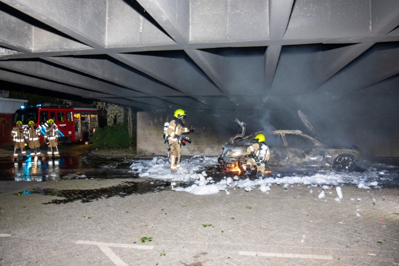 Onder de Spaansebrug in Rotterdam is kort na de schietpartij een brandende auto aangetroffen. Het zou hier mogelijk om de vluchtauto gaan.