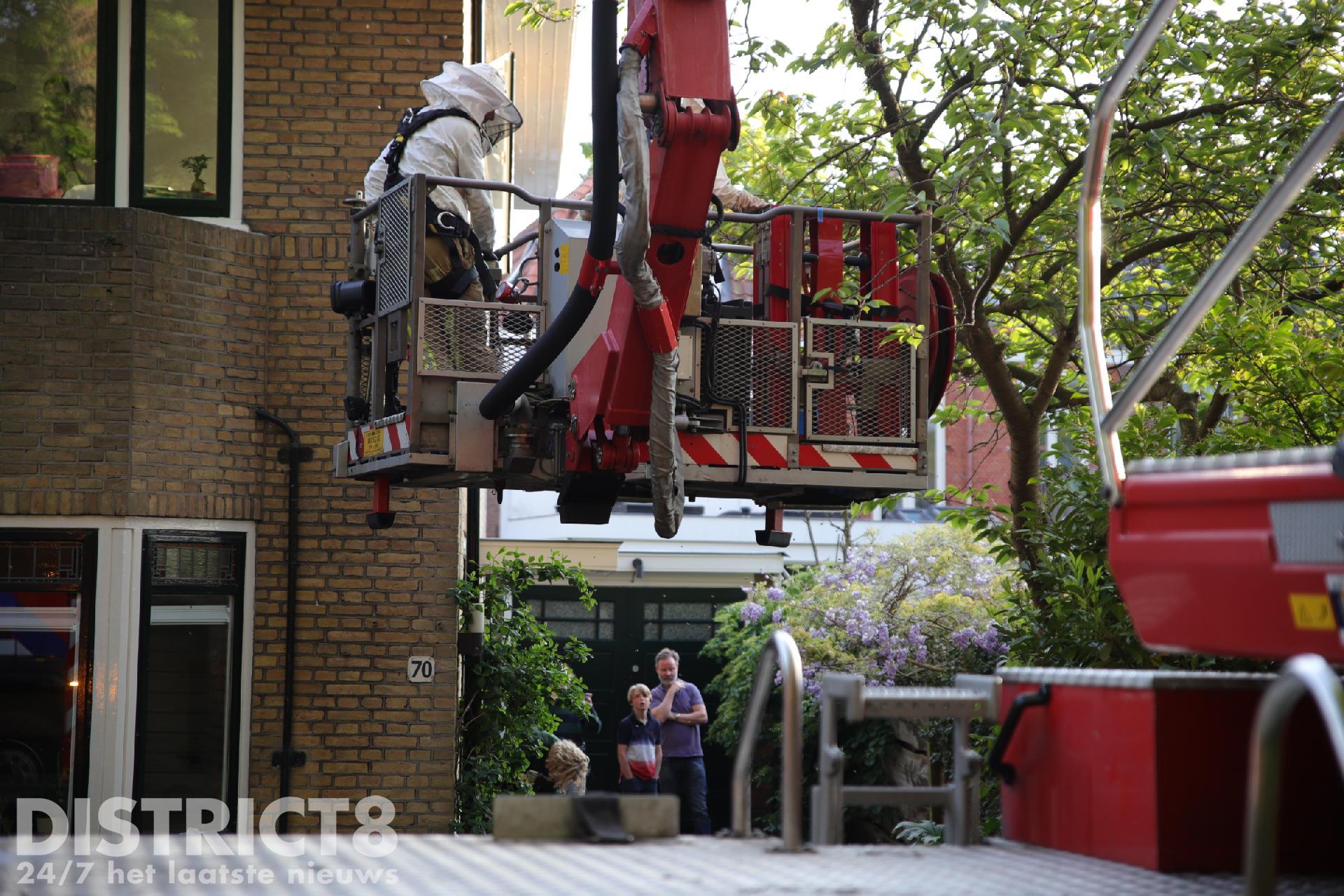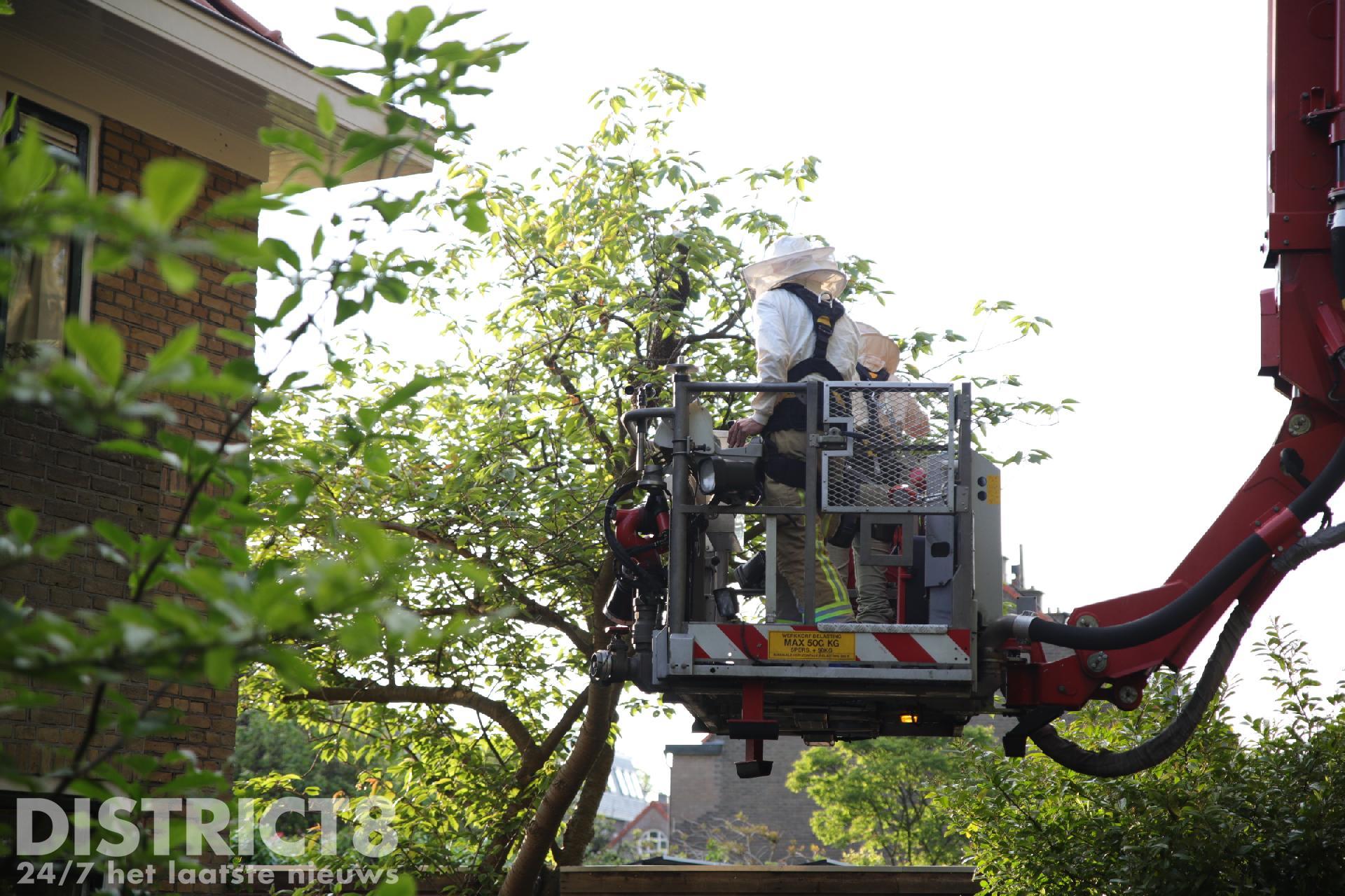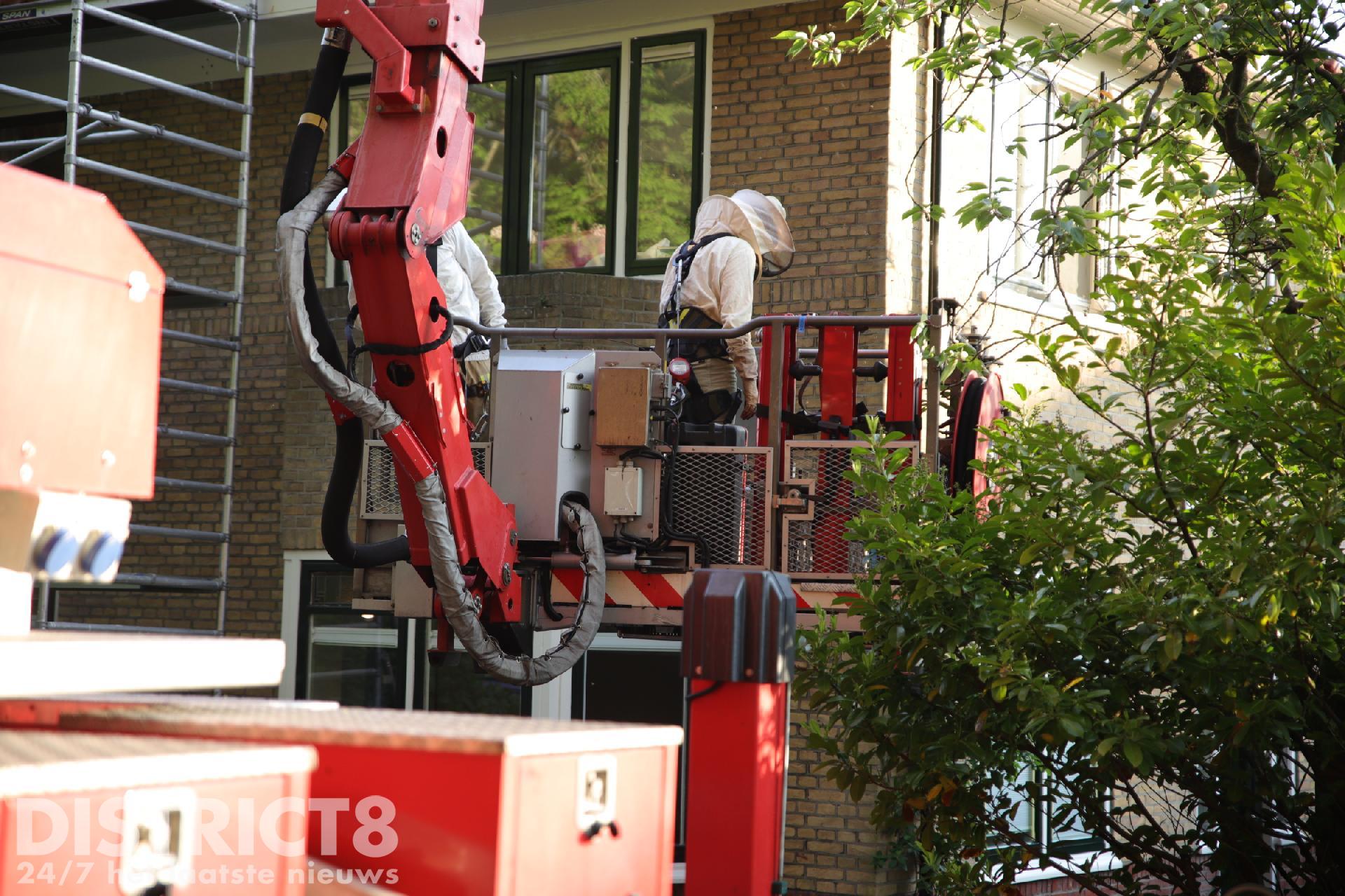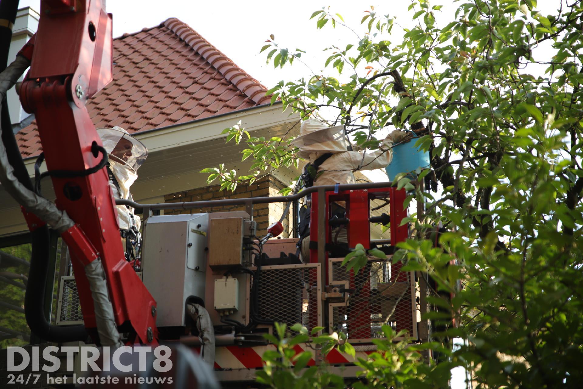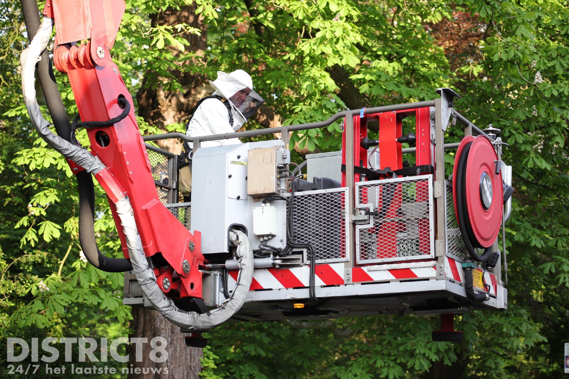 De hoogwerker van de brandweer is daarbij komen assisteren. Met een speciale imkerhoed op zijn een imker en een brandweerman omhoog gegaan.