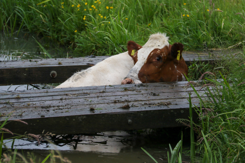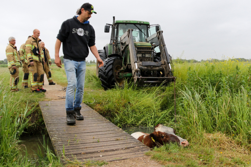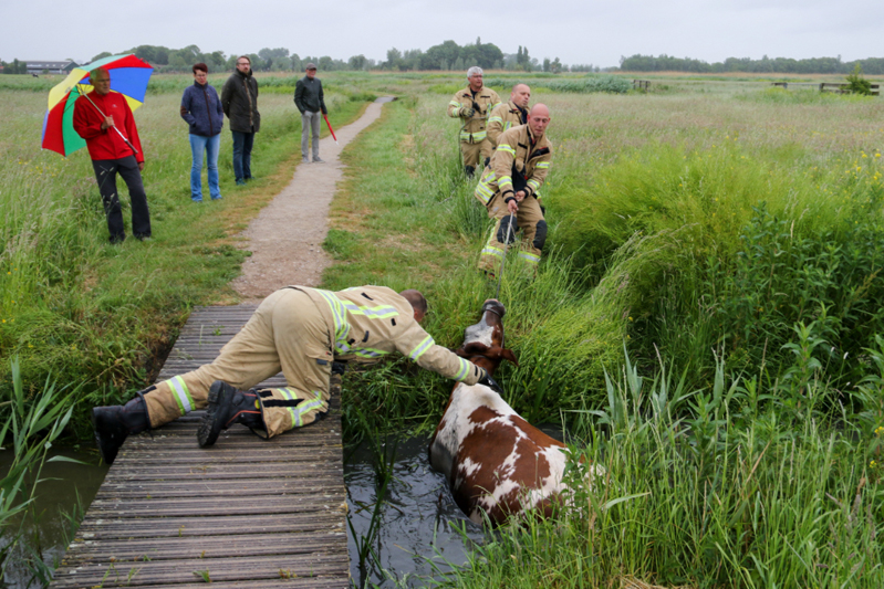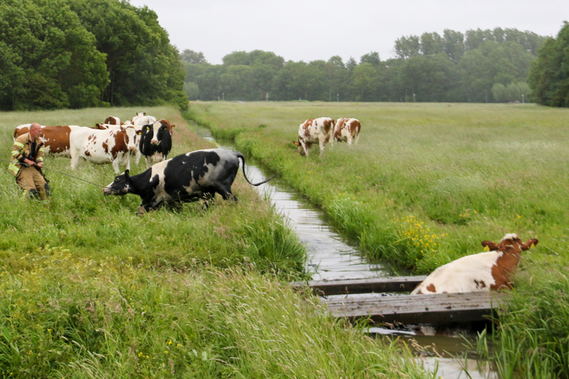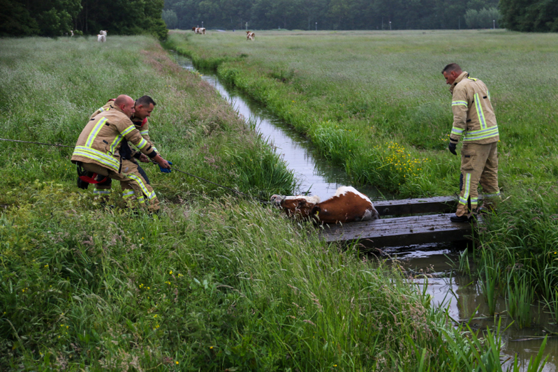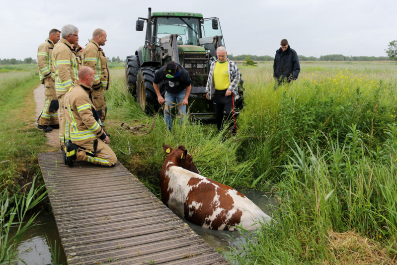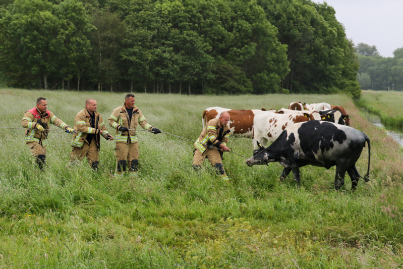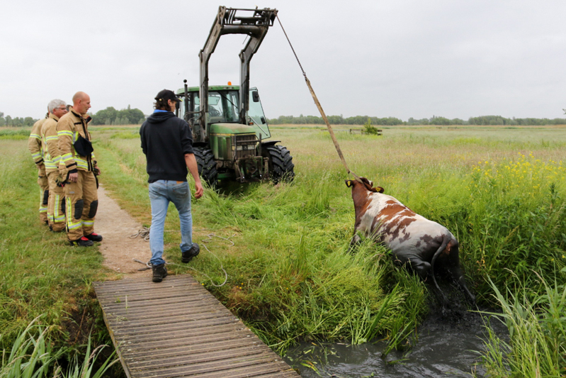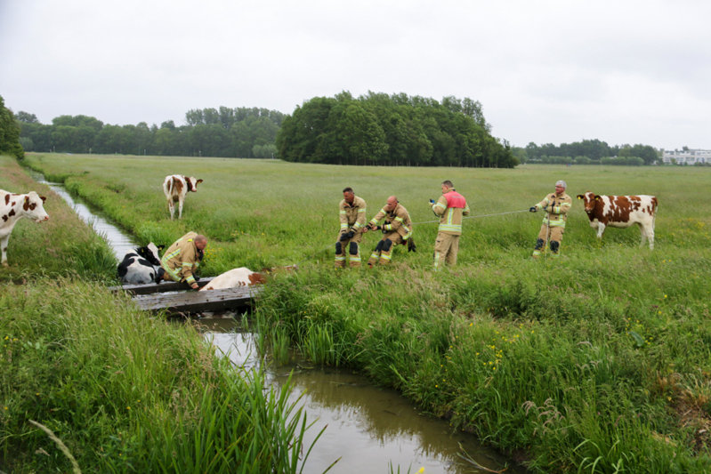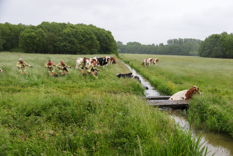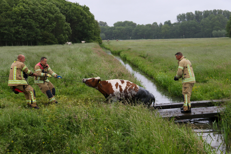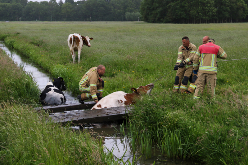 Een van de koeien loopt richting de wandelaar waar het beest onder een bruggetje door probeert te komen. De wandelaars bellen de brandweer en nog voordat de brandweer ter plaatse ligt, ligt er een derde koe in de sloot. Het lukt de brandweer er twee uit te trekken maar voor de derde die flink vast zit moest een traktor ter plaatse komen om haar eruit te halen.