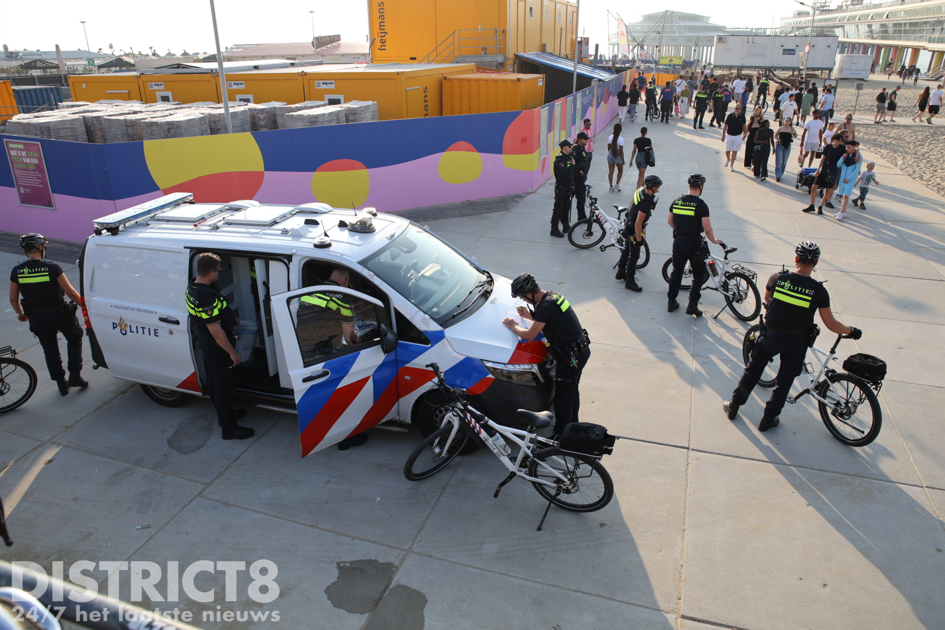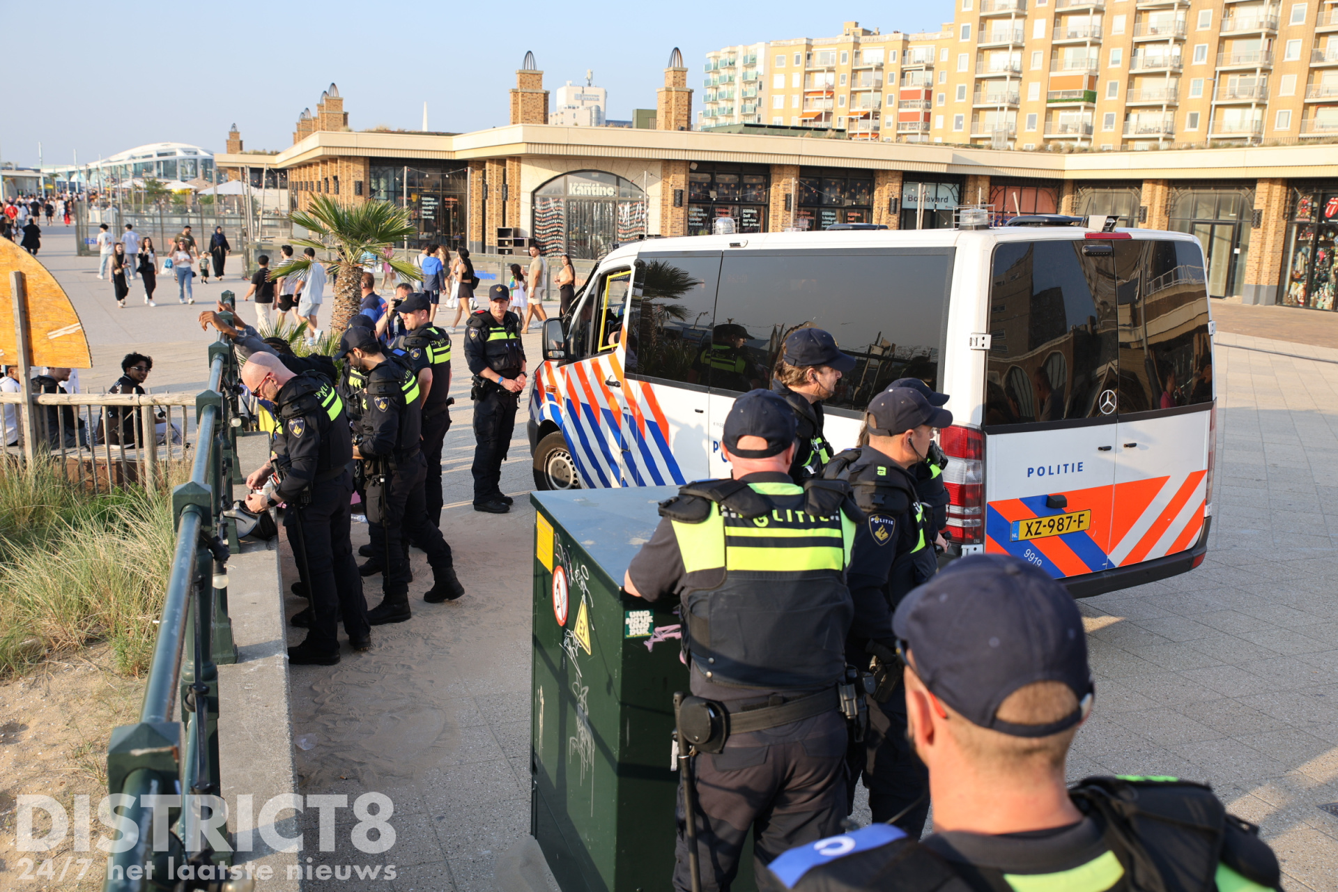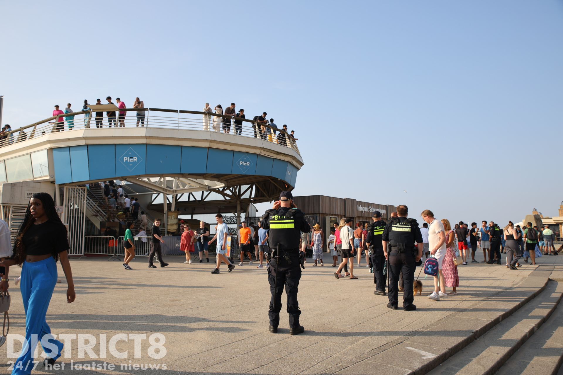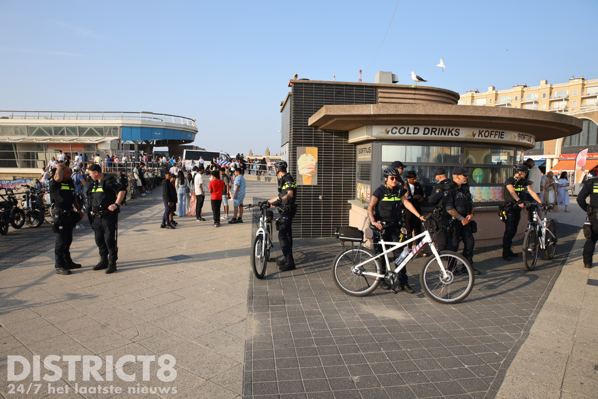 Ook vandaag, in verband met het warme weer en eerdere oproepen met betrekking tot mogelijke ongeregeldheden, is de politie in grote getale aanwezig. Een groepje jongeren bij de McDonalds bij de pier is gecontroleerd door de politie en handhaving.