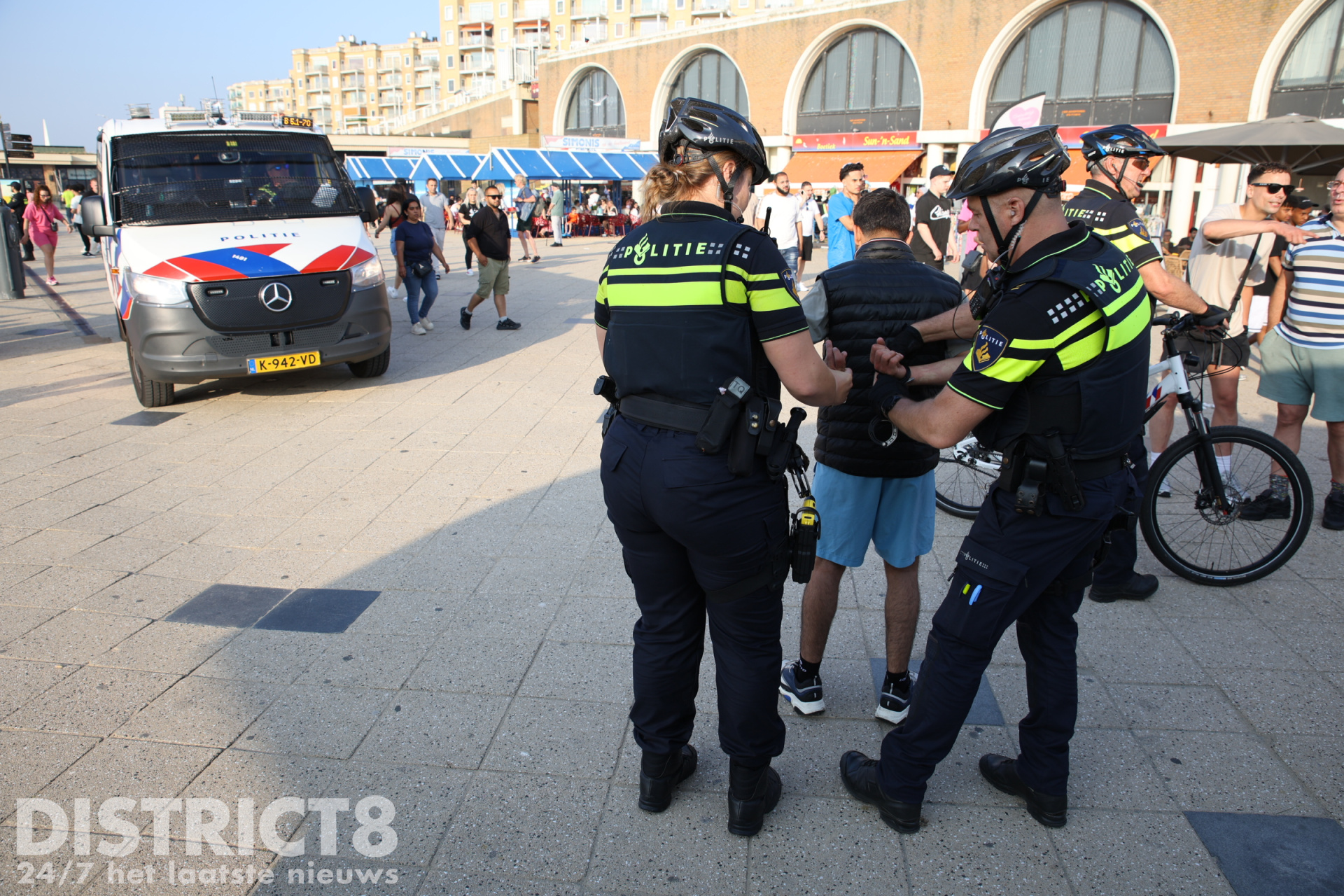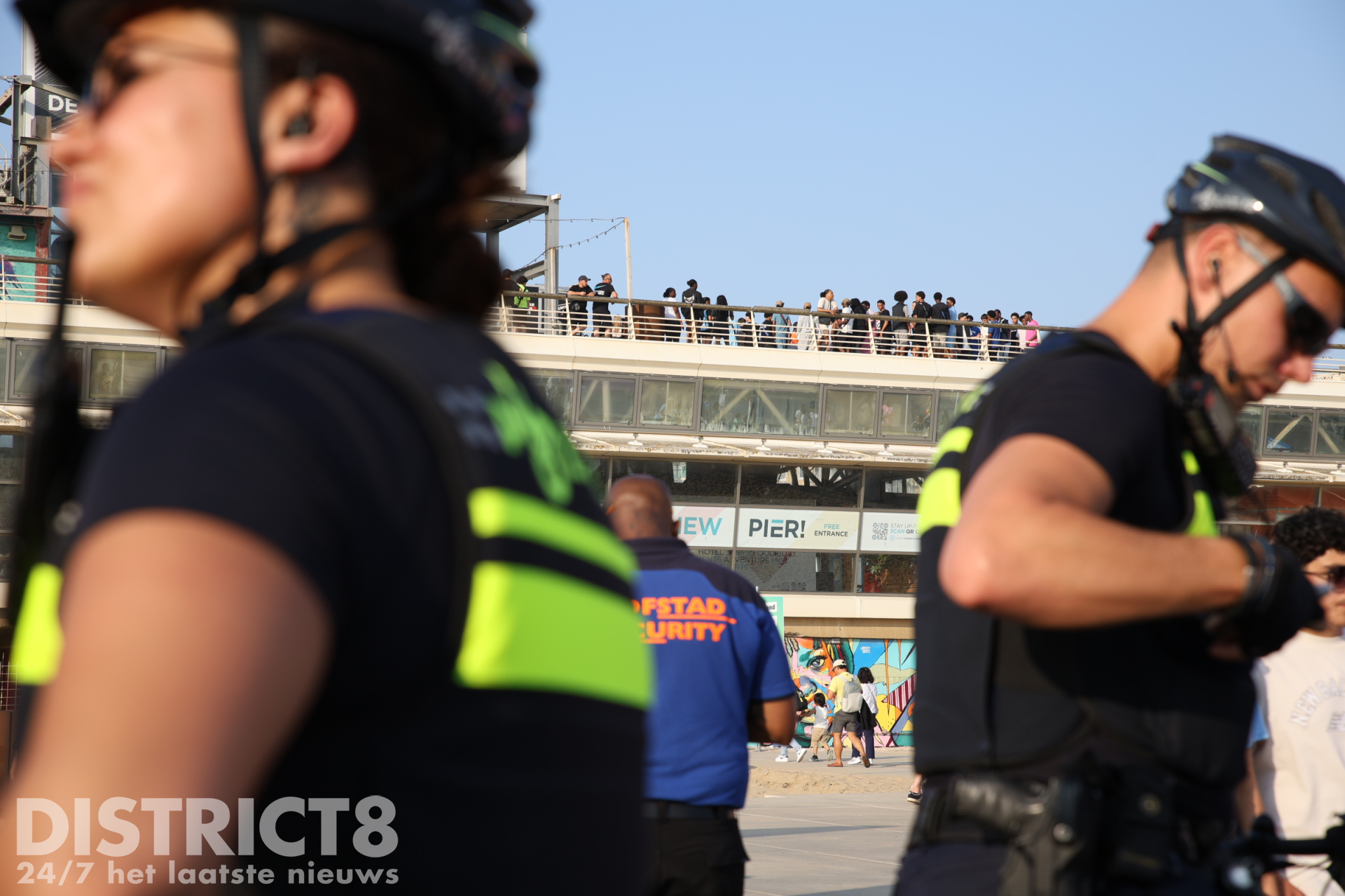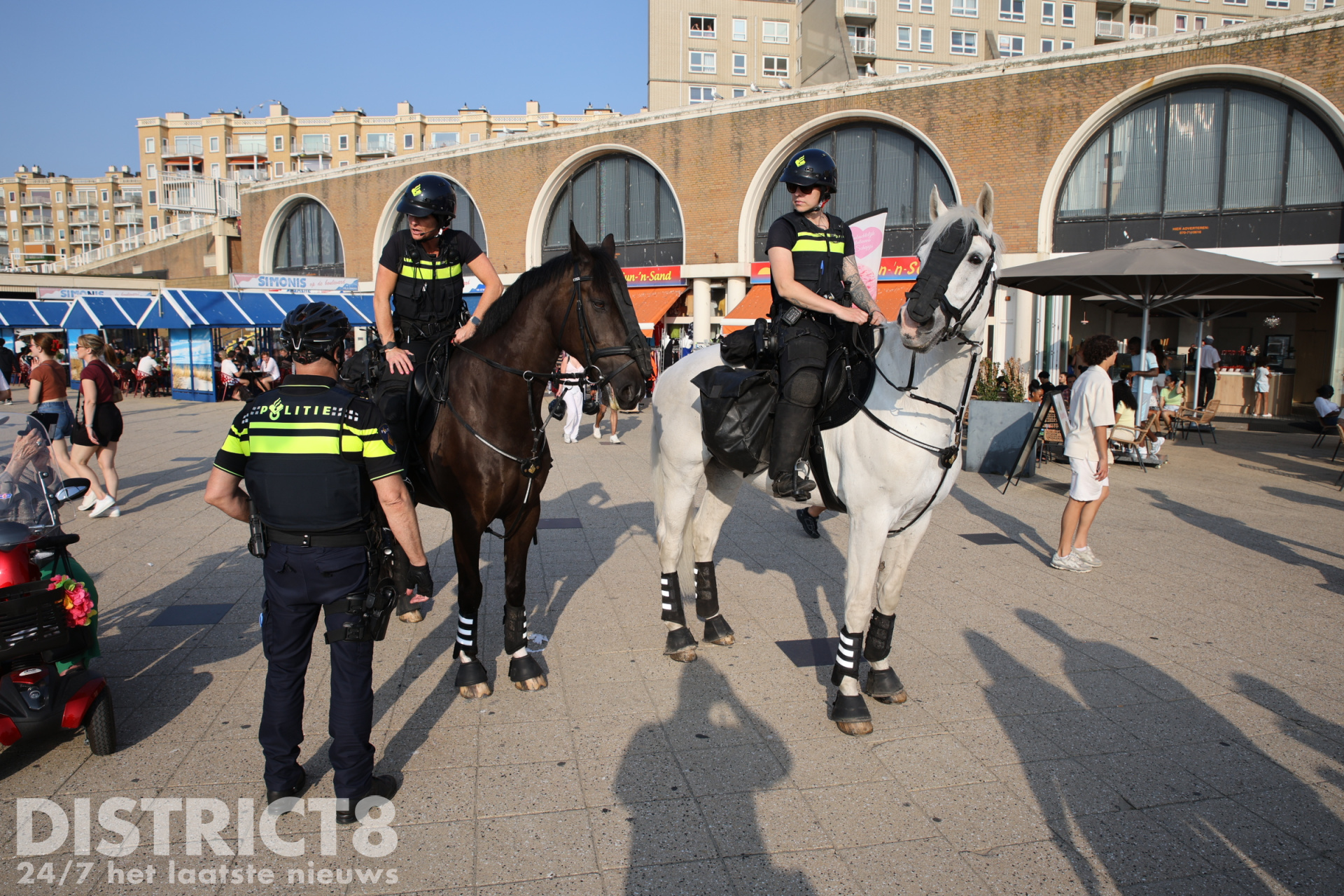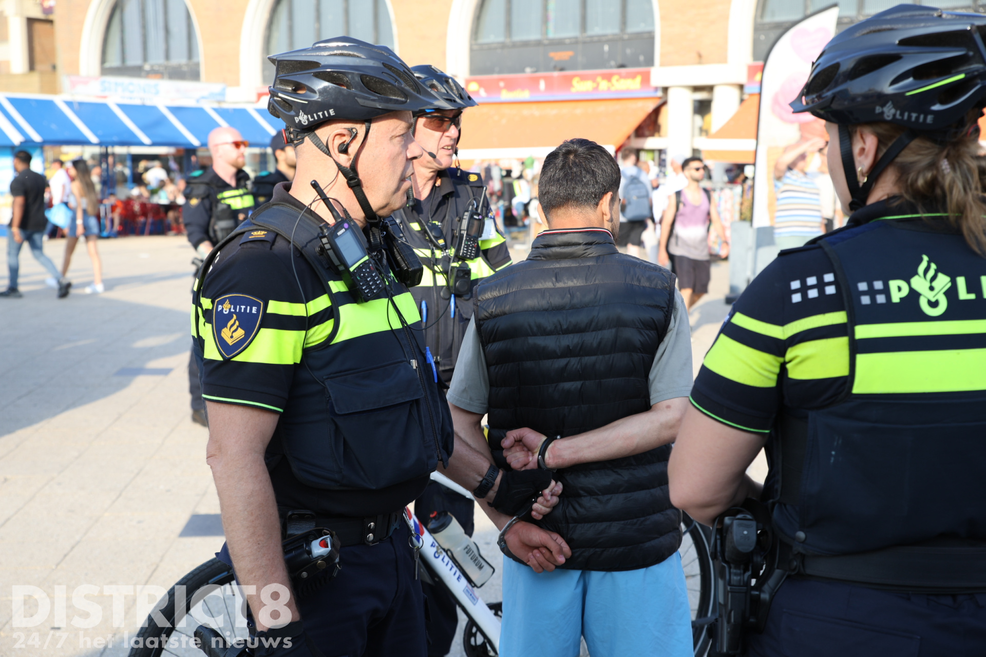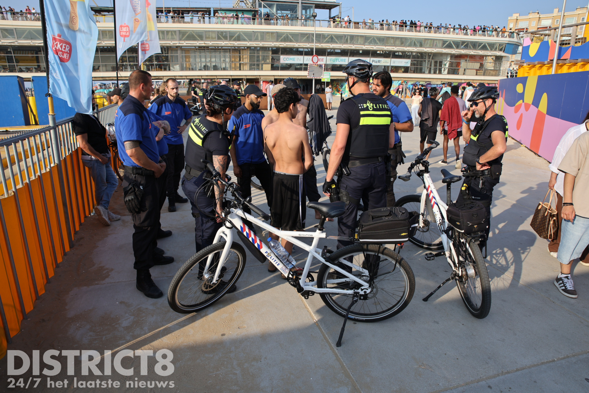Ook vandaag, in verband met het warme weer en eerdere oproepen met betrekking tot mogelijke ongeregeldheden, is de politie in grote getale aanwezig. Een groepje jongeren bij de McDonalds bij de pier is gecontroleerd door de politie en handhaving.