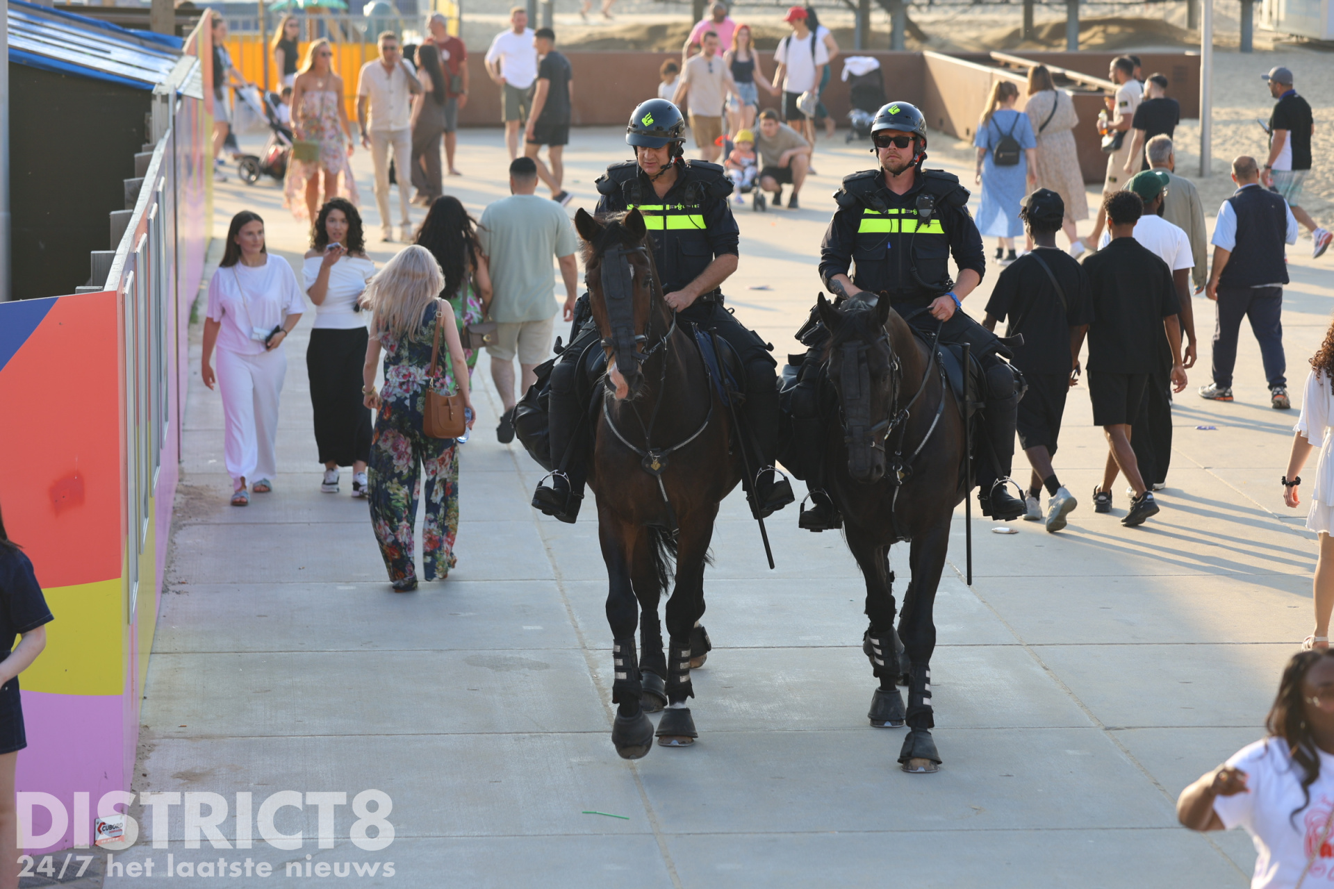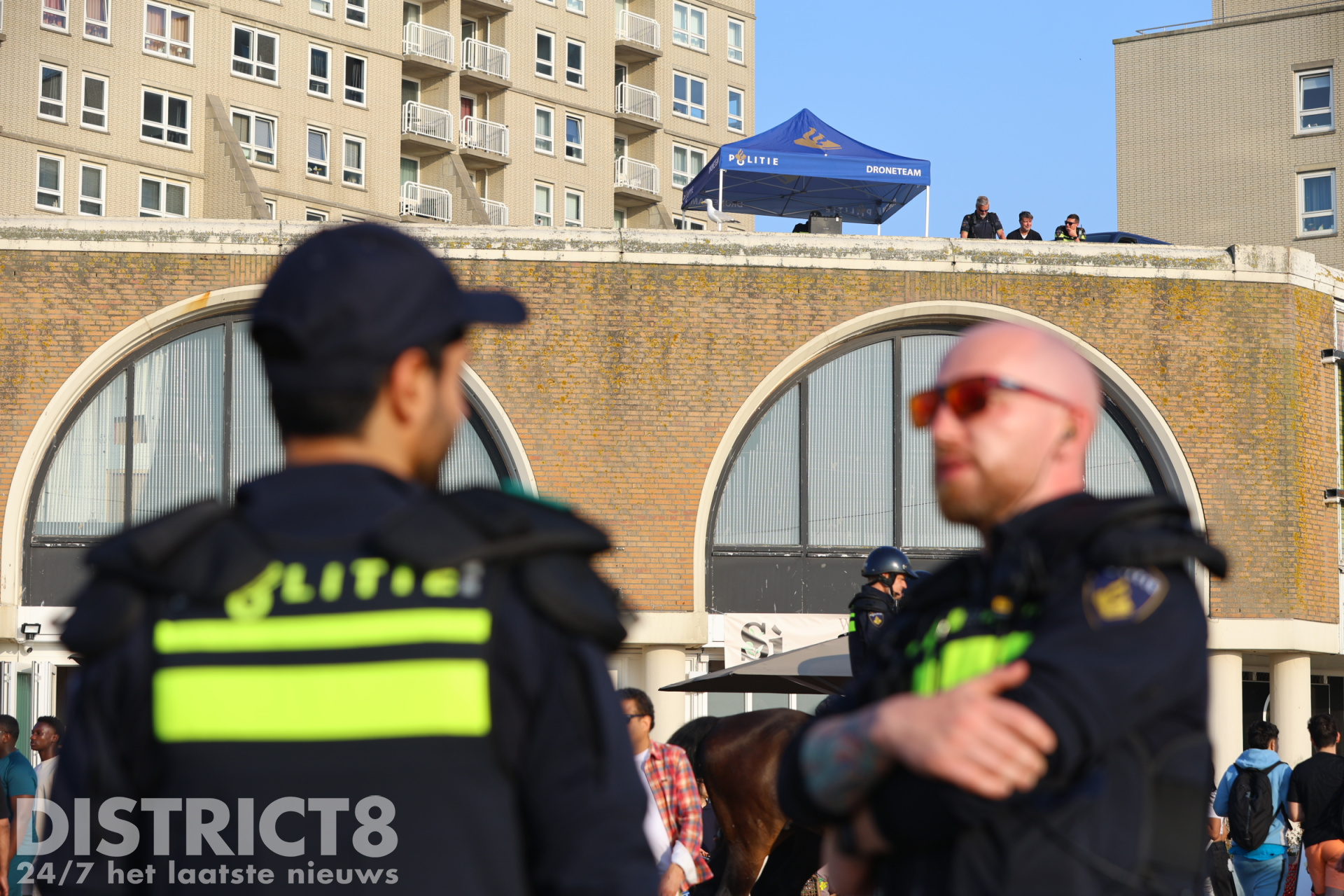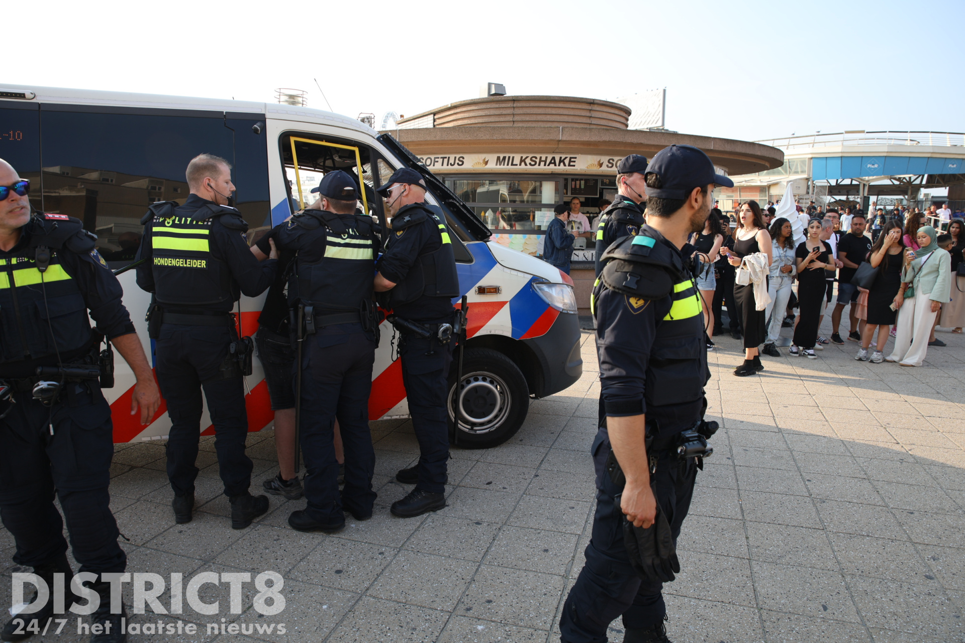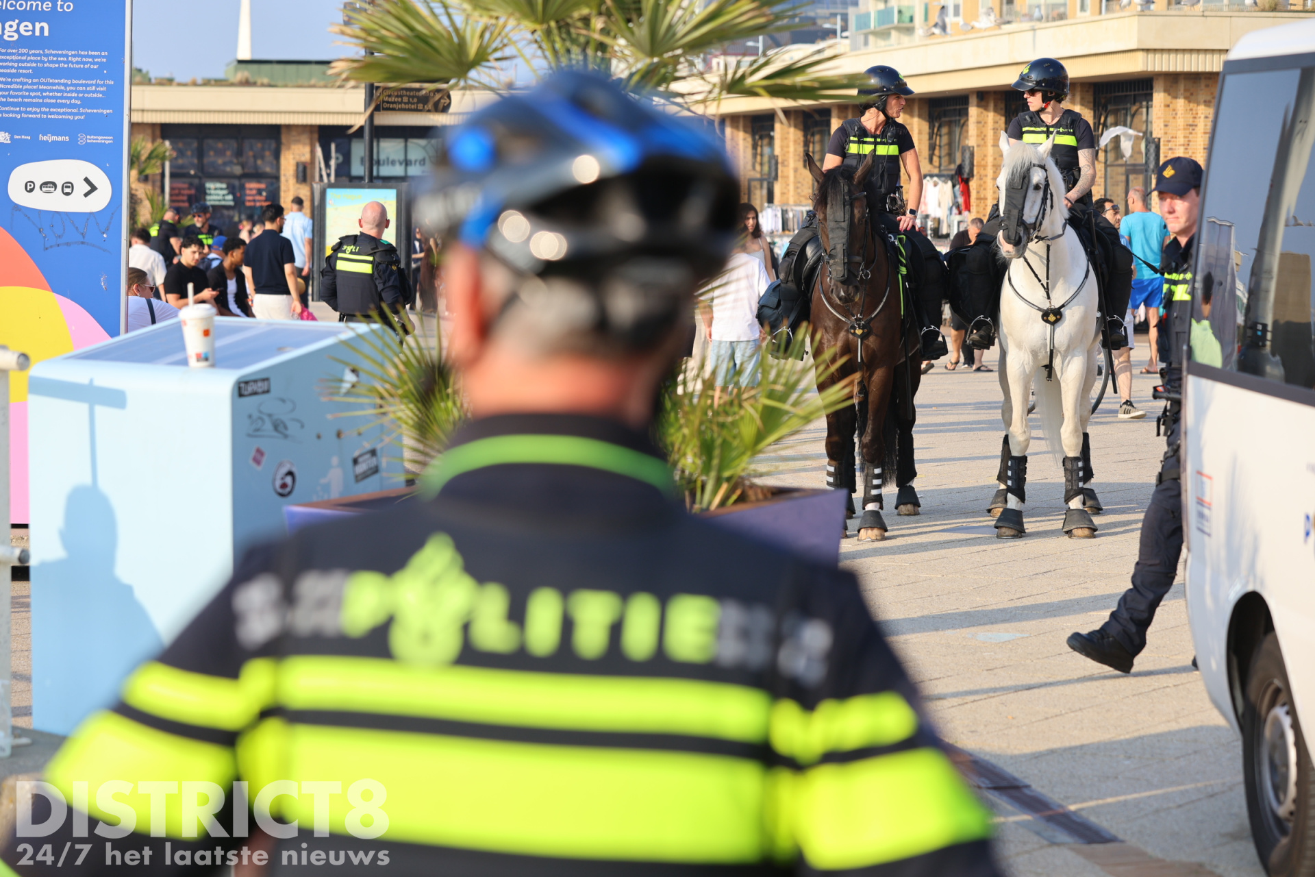 Ook vandaag, in verband met het warme weer en eerdere oproepen met betrekking tot mogelijke ongeregeldheden, is de politie in grote getale aanwezig. Een groepje jongeren bij de McDonalds bij de pier is gecontroleerd door de politie en handhaving.