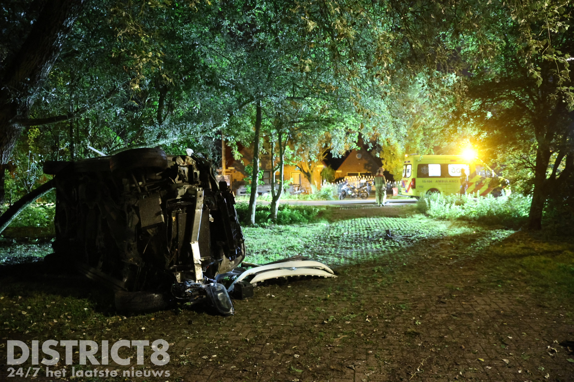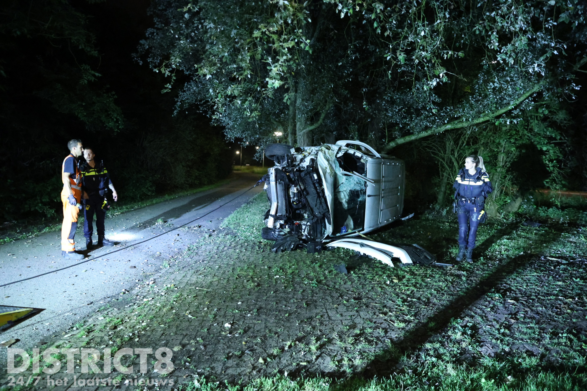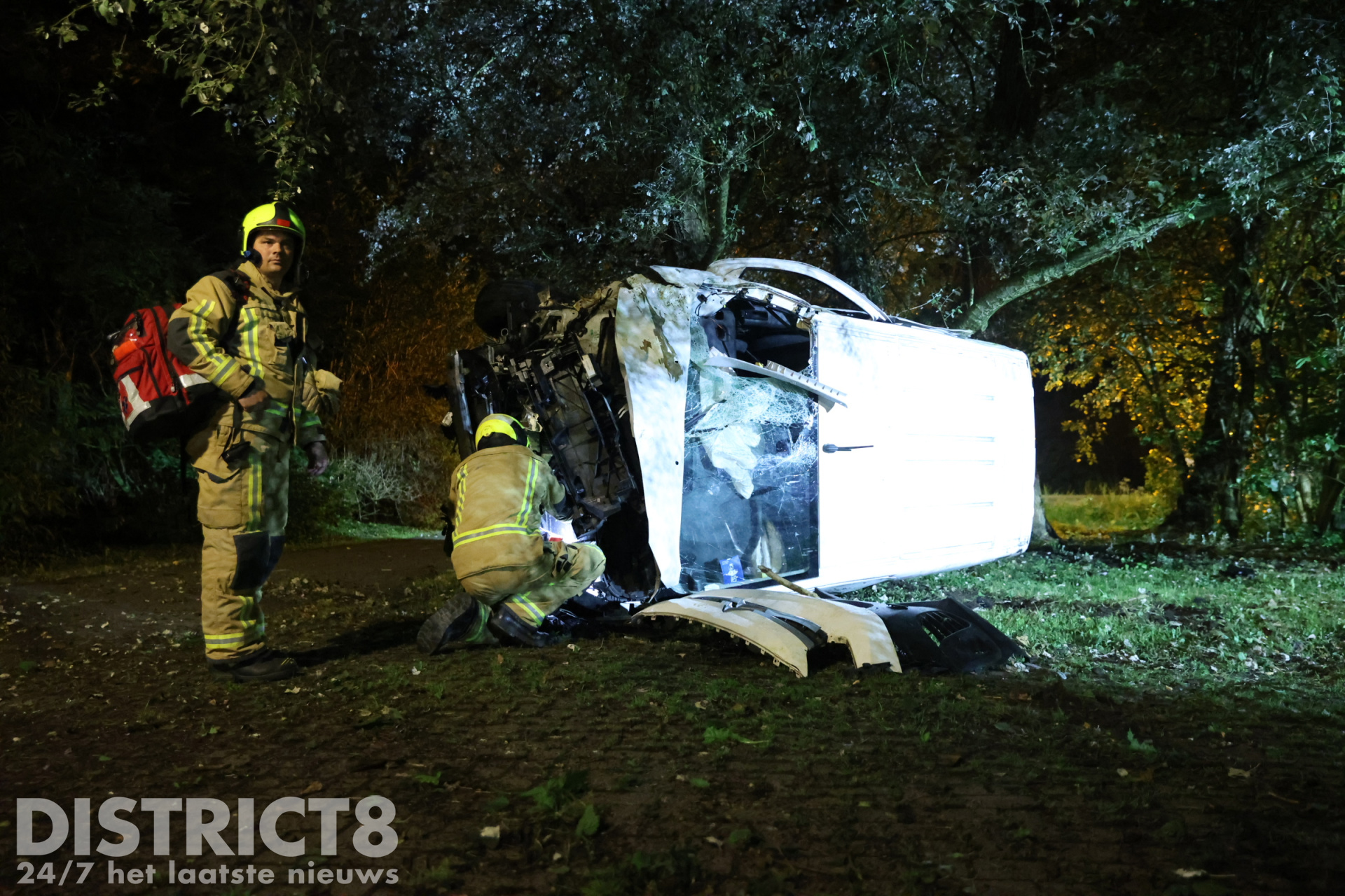 De dollemansrit van de bestuurder eindigde al snel. Na het rammen van een lichtmast schoot de auto volledig van de weg en kwam op z’n kant tot stilstand. Dit enkele meters verderop.