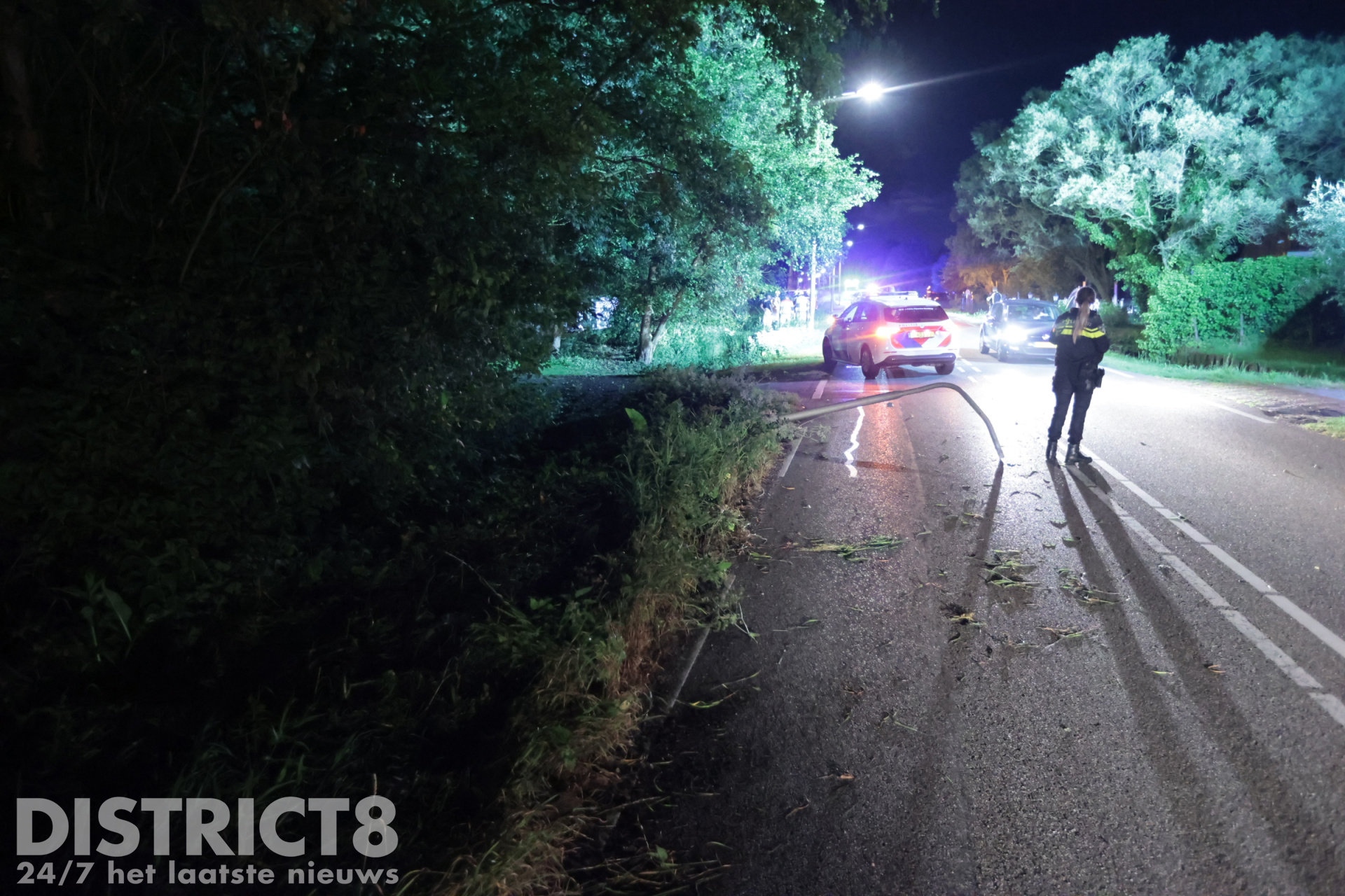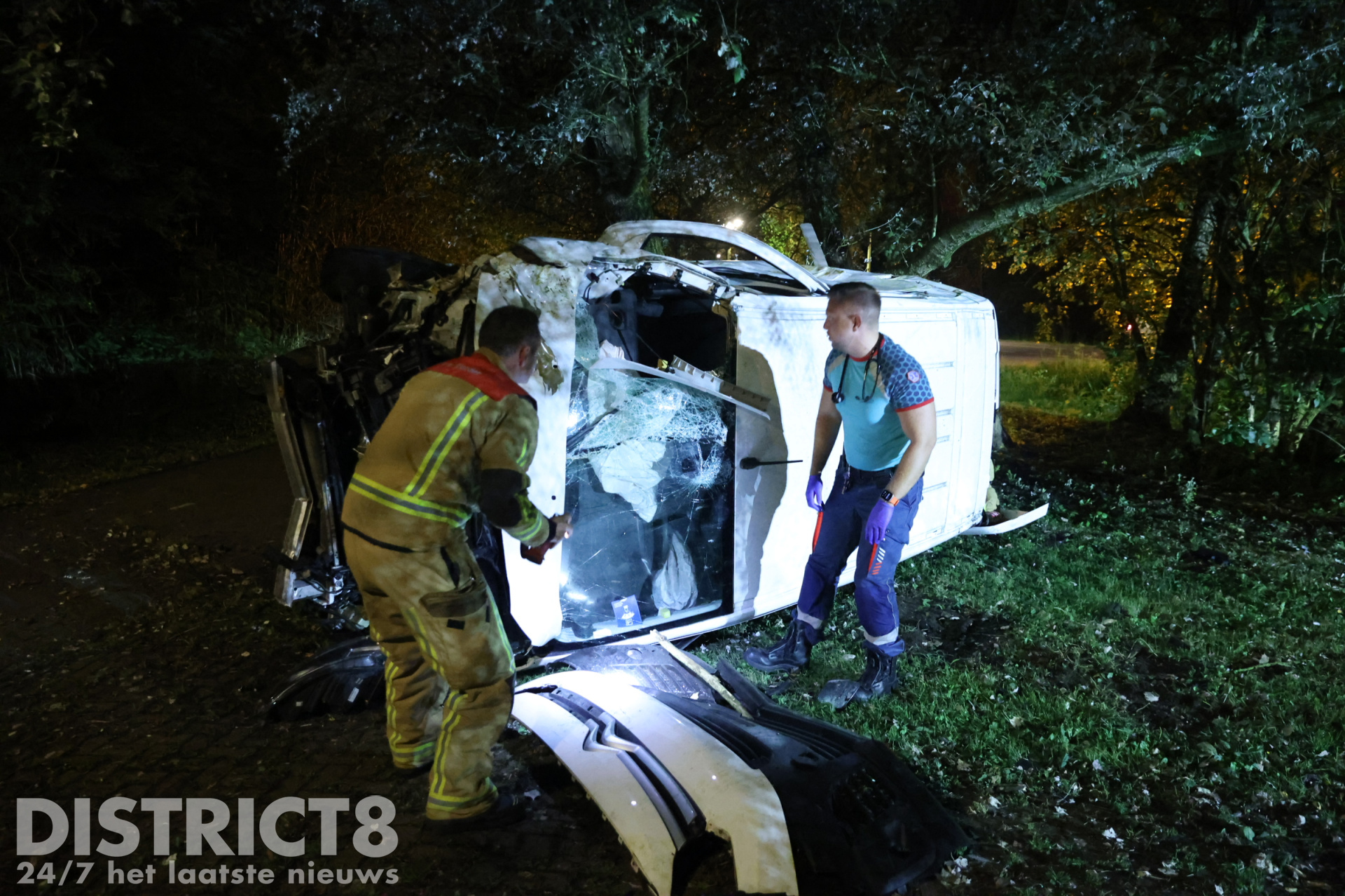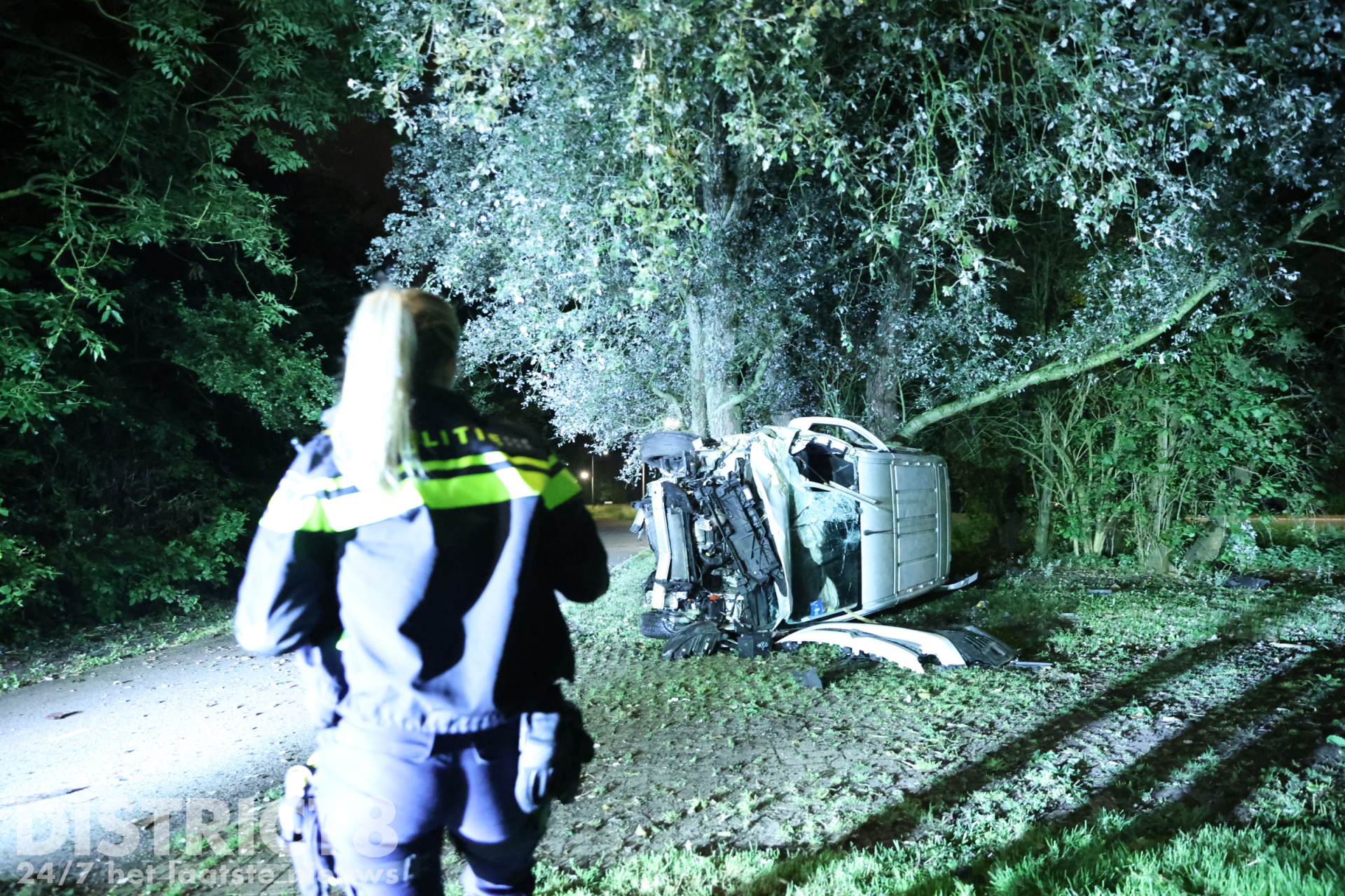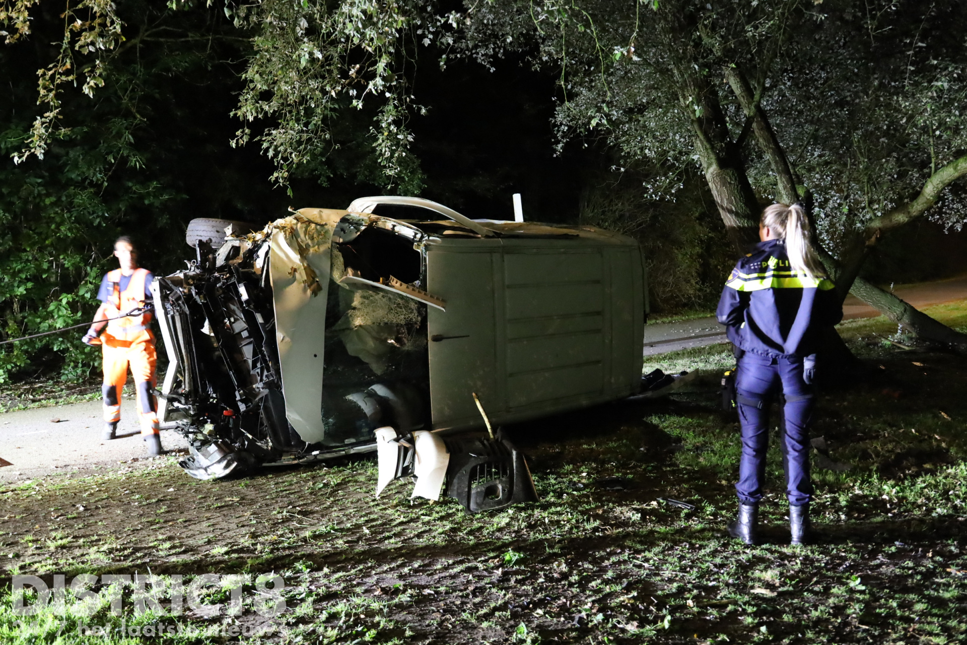 De dollemansrit van de bestuurder eindigde al snel. Na het rammen van een lichtmast schoot de auto volledig van de weg en kwam op z’n kant tot stilstand. Dit enkele meters verderop.