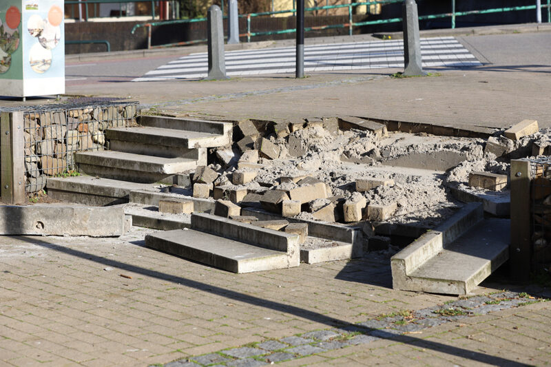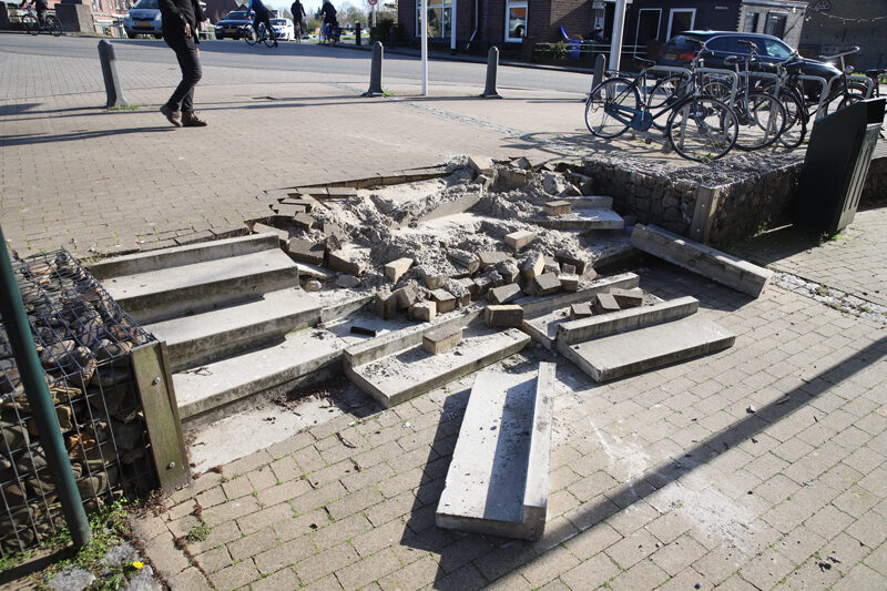 Door de mislukte parkeerpoging raakte de trap beschadigd, de wagen zal worden weggehaald.
