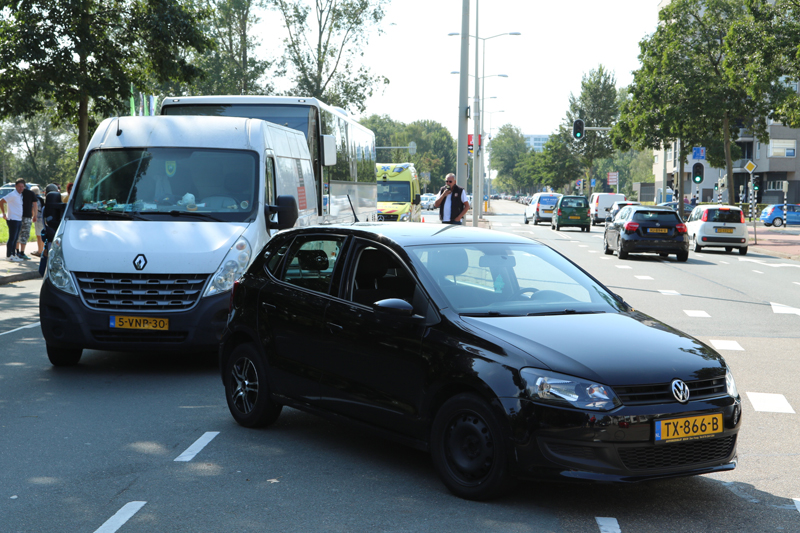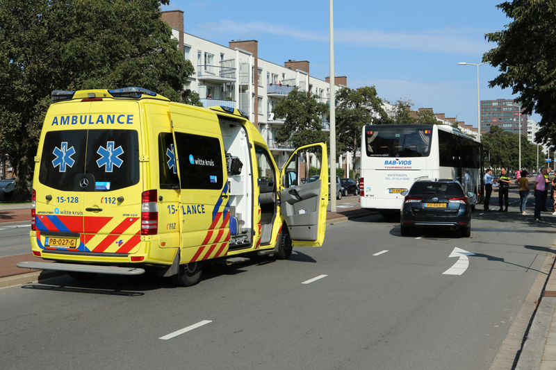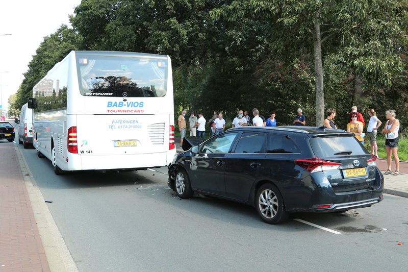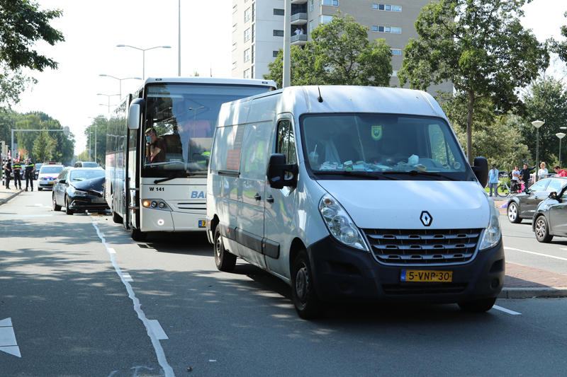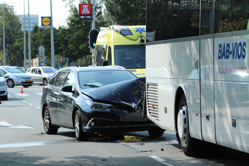Den Haag – Zondag 13 september heeft op de Erasmusweg ter hoogte van de Laan van Wateringseveld een ongeval plaatsgevonden tussen en een afslaande personenauto en een bedrijfsbus. Een achteropkomende touringcar kon op tijd remmen, de auto daarachter echter niet meer. Hierdoor ontstond een tweede aanrijding waarbij de personenauto achterop de touringcar botste tijdens het invoegen.