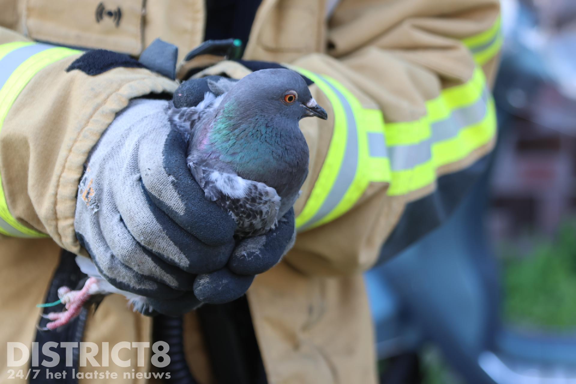 De brandweerlieden van kazerne Laak wisten de duif uit het net te bevrijden. Het diertje bleef ongedeerd en kon, nadat het was bevrijd, verder met zijn vlucht.