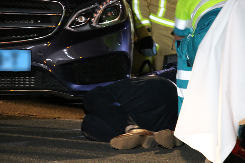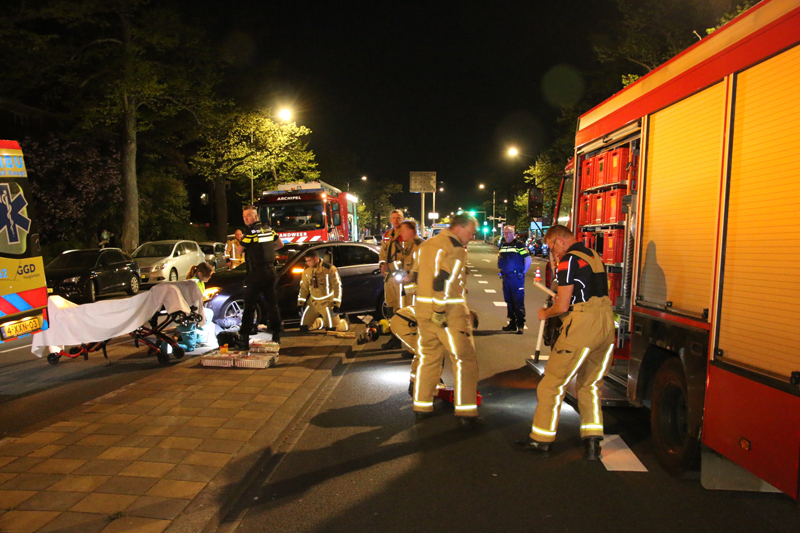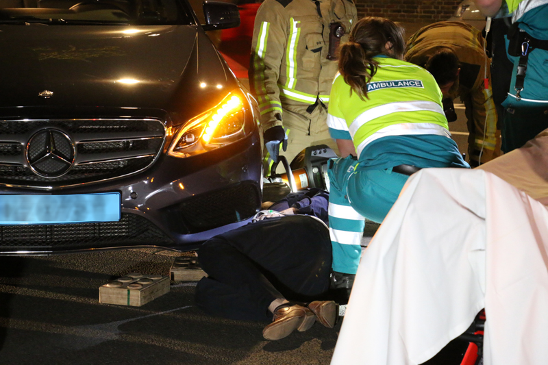 De auto kwam tot stilstand midden op de weg. De arm van de bestuurder kwam bekneld te zitten onder een voorwiel.