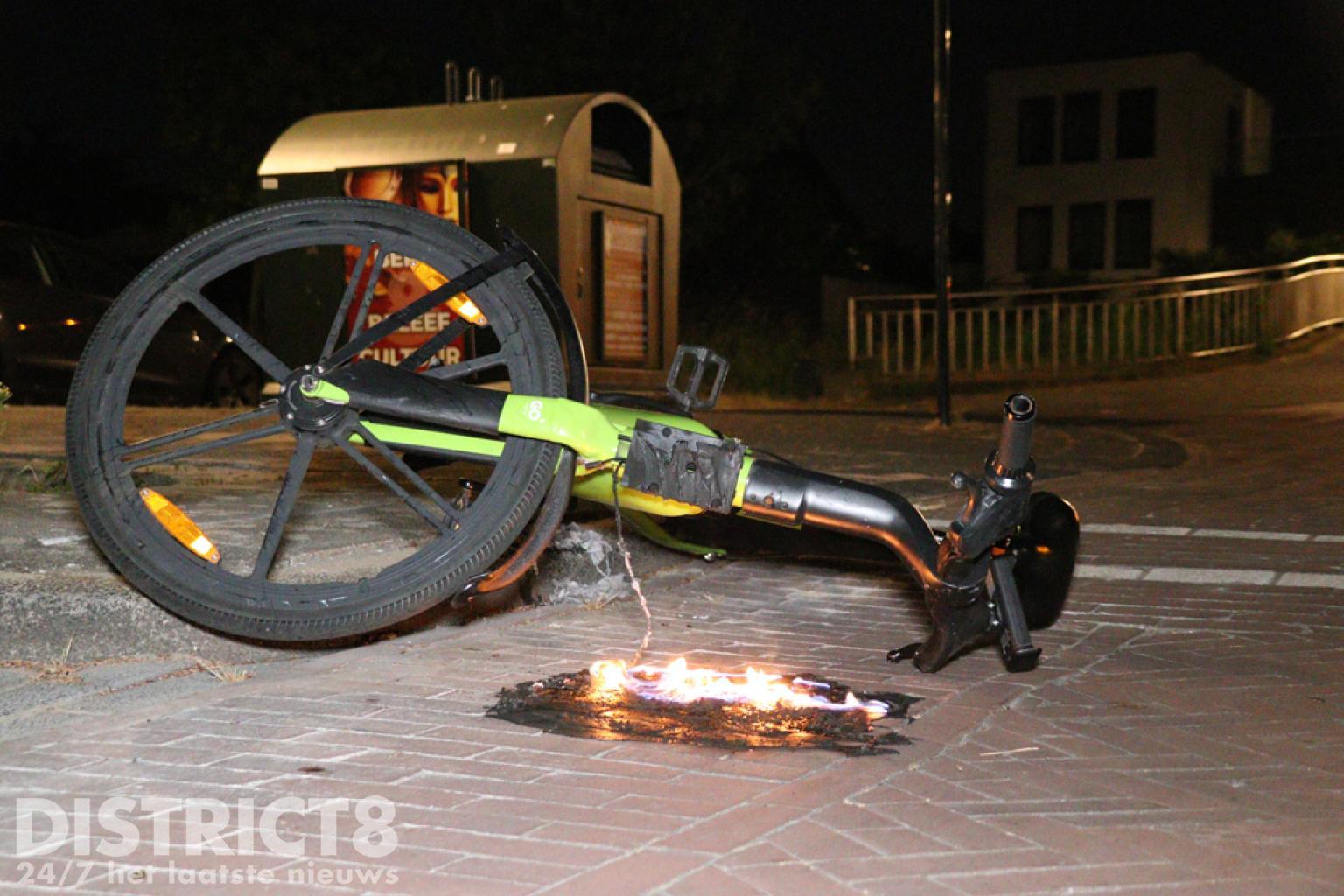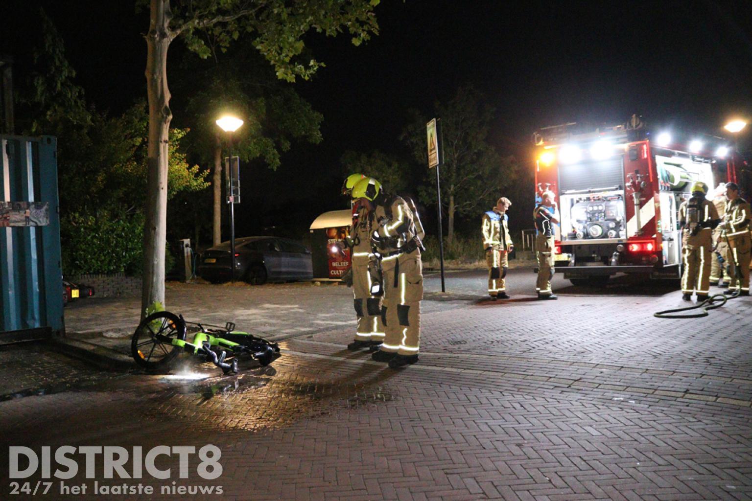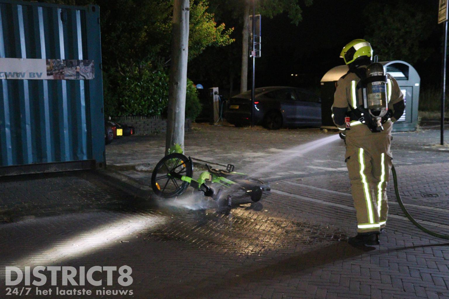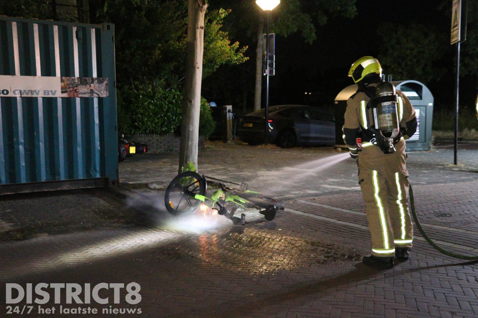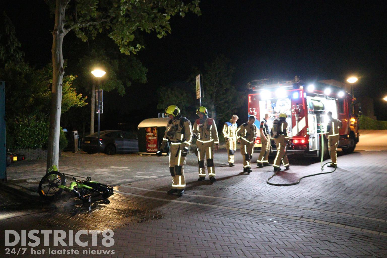 De brandweer kwam met spoed ter plaatse, met een hoge druk was het vuur al snel uit. In de buurt van de fiets zijn ook twee scooters liggend aangetroffen.