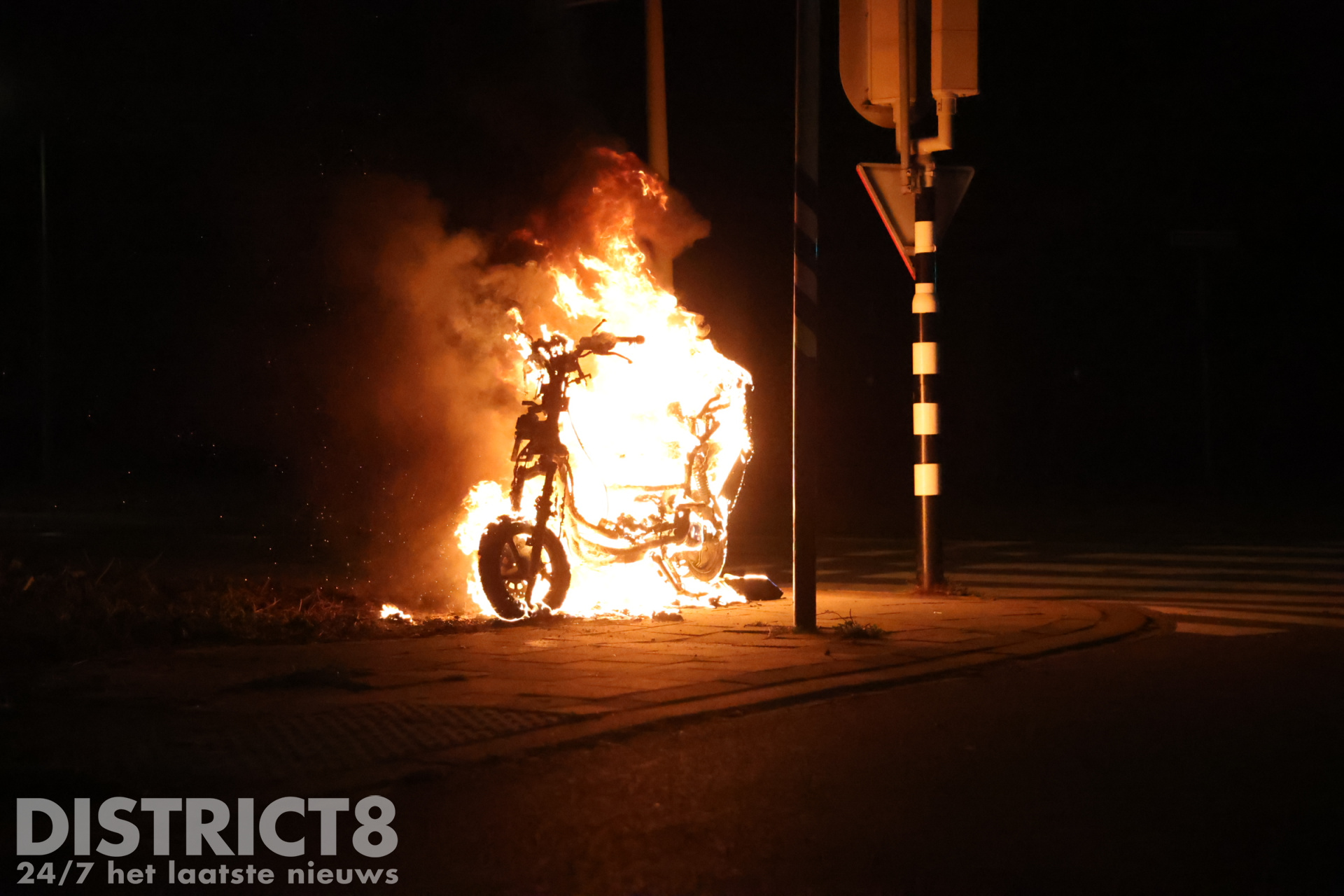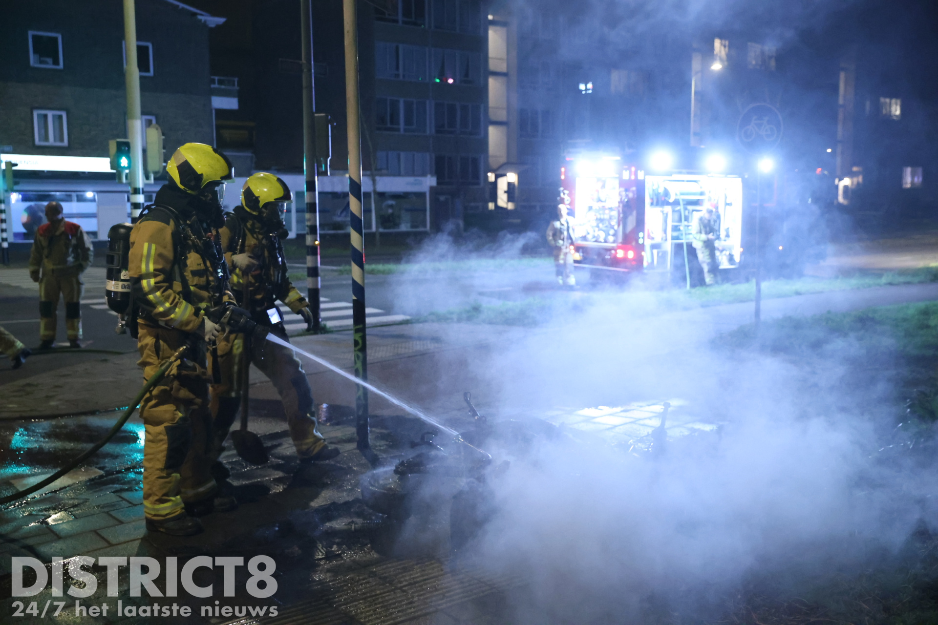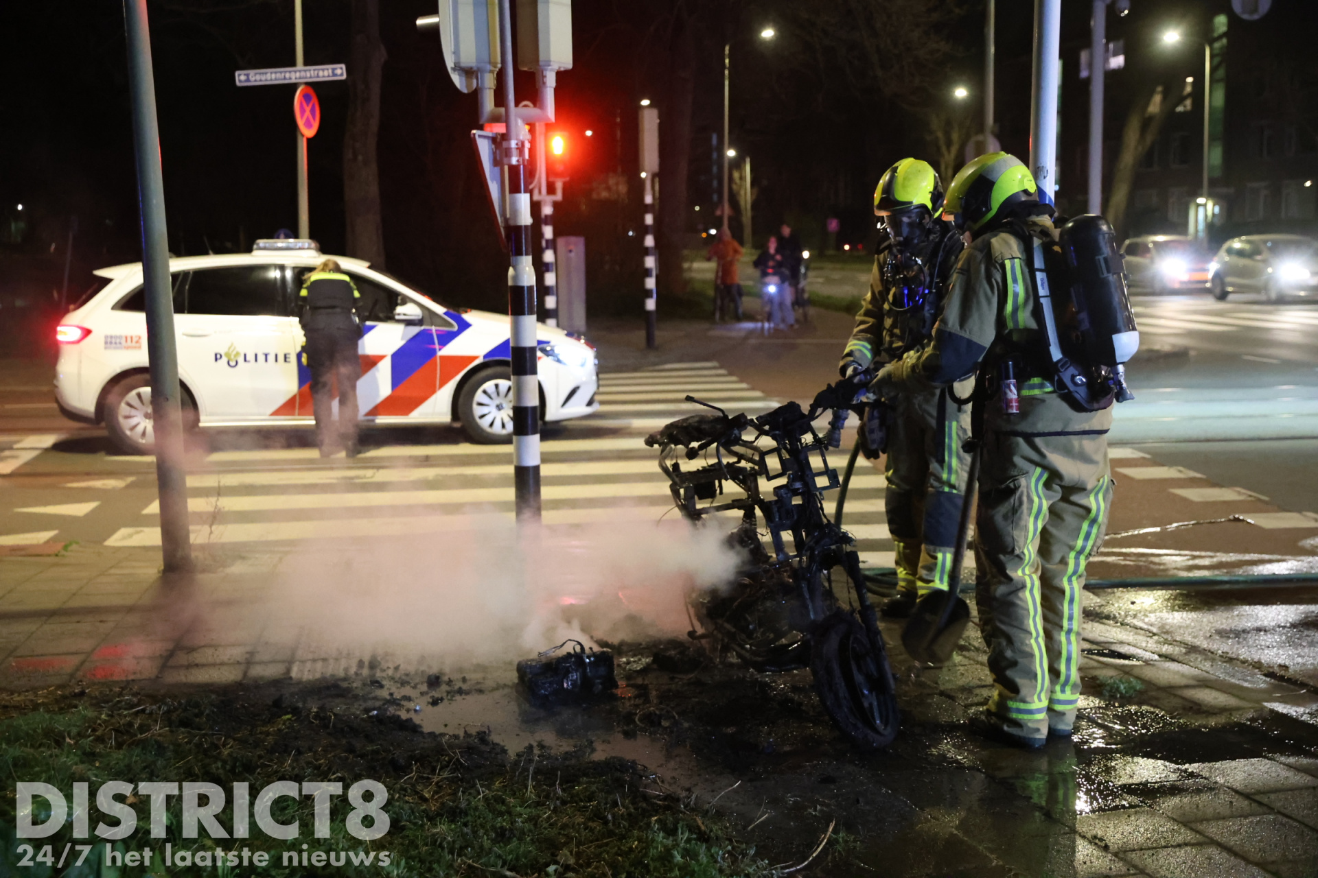 Den Haag – In de nacht van zaterdag op zondag 23 maart is een elektrische scooter in brand gestoken op de kruising van de Segbroeklaan en de Goudenregenstraat in Den Haag. De scooter ging volledig in vlammen op, vermoedelijk door opzet.