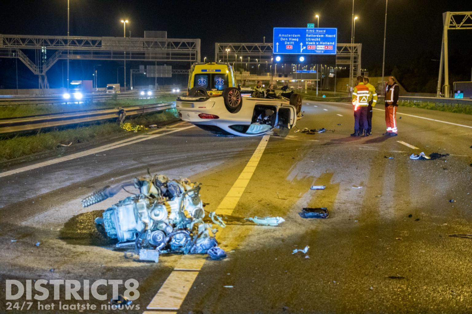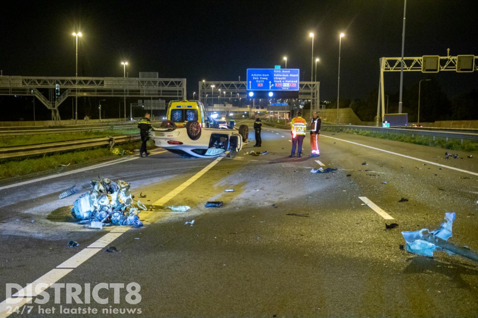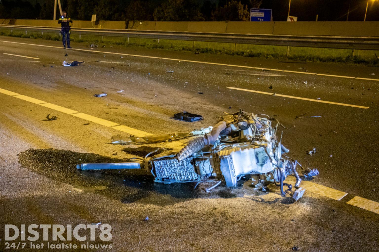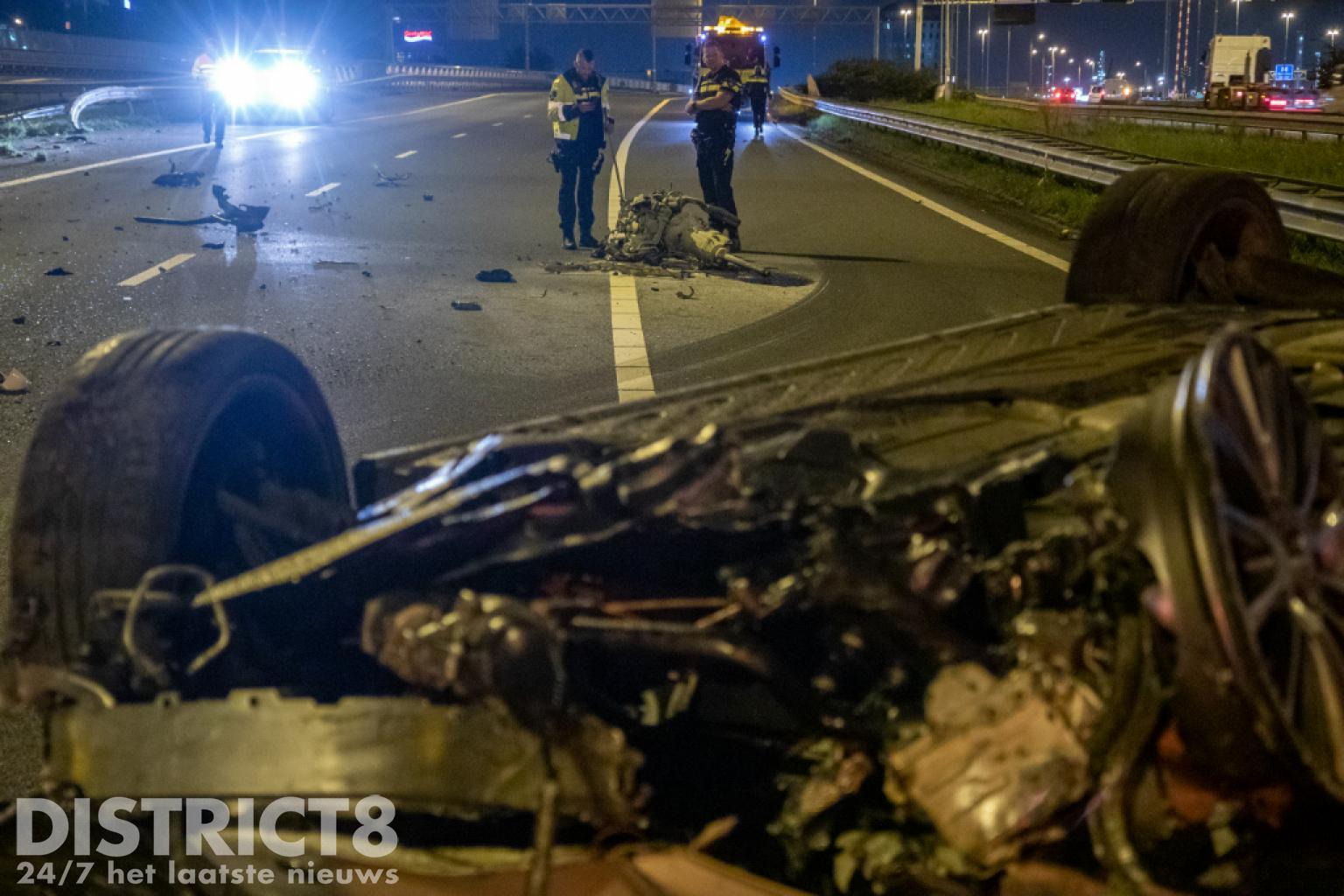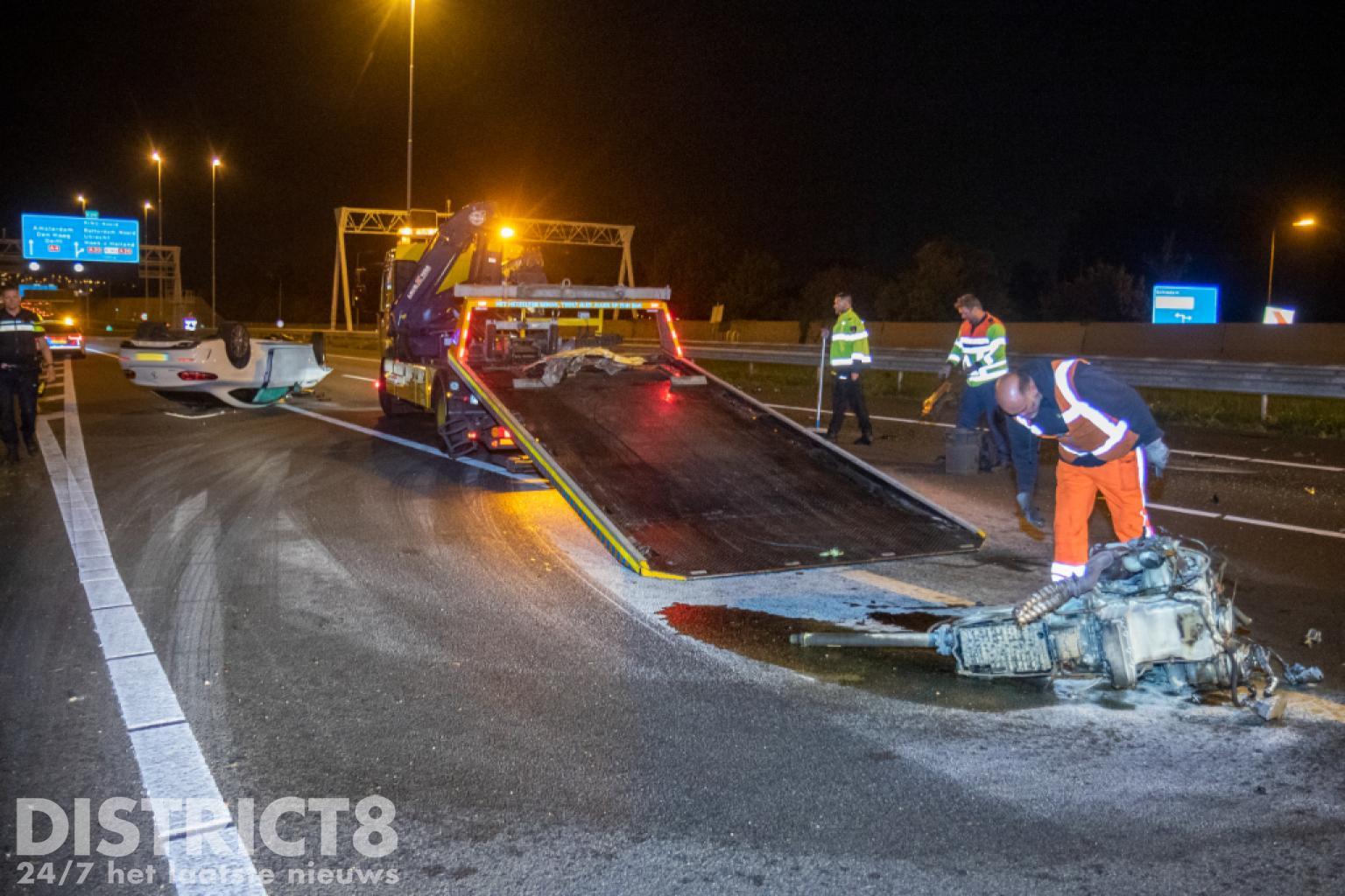 De auto kwam vervolgens een eind verderop ondersteboven op zijn dak tot stilstand. Onderweg werd het complete motorblok nog verloren. Ook lag de snelweg bezaaid met brokstukken.